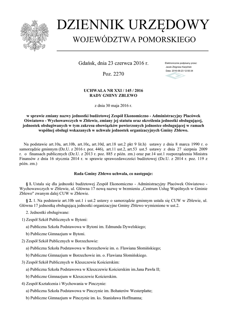 DZIENNIK URZĘDOWY WOJEWÓDZTWA POMORSKIEGO Gdańsk, dnia 23 czerwca 2016 r. Elektronicznie podpisany przez: Jacek Zbigniew Karpiński Poz. 2270 Data: 2016-06-23 12:50:34 UCHWAŁA NR XXI / 145 / 2016 RADY GMINY ZBLEWO z dnia 30 maja 2016 r. w sprawie zmiany nazwy jednostki budżetowej Zespół Ekonomiczno - Administracyjny Placówek Oświatowo - Wychowawczych w Zblewie, zmiany jej statutu oraz określenia jednostki obsługującej, jednostek obsługiwanych w tym zakresu obowiązków powierzonych jednostce obsługującej w ramach wspólnej obsługi wskazanych w uchwale jednostek organizacyjnych Gminy Zblewo. Na podstawie art.10a, art.10b, art.10c, art.10d, art.18 ust.2 pkt 9 lit.h) ustawy z dnia 8 marca 1990 r. o samorządzie gminnym (Dz.U. z 2016 r. poz. 446), art.11 ust.2, art.53 ust.5 ustawy z dnia 27 sierpnia 2009 r. o finansach publicznych (Dz.U. z 2013 r. poz. 885 z późn. zm.) oraz par.14 ust.1 rozporządzenia Ministra Finansów z dnia 16 stycznia 2014 r. w sprawie sprawozdawczości budżetowej (Dz.U. z 2014 r. poz. 119 z późn. zm.) Rada Gminy Zblewo uchwala, co następuje: § 1. Ustala się dla jednostki budżetowej Zespół Ekonomiczno - Administracyjny Placówek Oświatowo Wychowawczych w Zblewie, ul. Główna 17 nową nazwę w brzmieniu „Centrum Usług Wspólnych w Gminie Zblewo" zwanym dalej CUW w Zblewie. § 2. 1. Na podstawie art.10b ust.1 i ust.2 ustawy o samorządzie gminnym ustala się CUW w Zblewie, ul. Główna 17 jednostką obsługującą jednostki organizacyjne Gminy Zblewo wymienione w ust.2. 2. Jednostki obsługiwane: 1) Zespół Szkół Publicznych w Bytoni: a) Publiczna Szkoła Podstawowa w Bytoni im. Edmunda Dywelskiego; b) Publiczne Gimnazjum w Bytoni. 2) Zespół Szkół Publicznych w Borzechowie: a) Publiczna Szkoła Podstawowa w Borzechowie im. o. Flawiana Słomińskiego; b) Publiczne Gimnazjum w Borzechowie im. o. Flawiana Słomińskiego. 3) Zespół Szkół Publicznych w Kleszczewie Kościerskim: a) Publiczna Szkoła Podstawowa w Kleszczewie Kościerskim im.Jana Pawła II; b) Publiczne Gimnazjum w Kleszczewie Kościerskim. 4) Zespół Kształcenia i Wychowania w Pinczynie: a) Publiczna Szkoła Podstawowa w Pinczynie im. Bohaterów Westerplatte; b) Publiczne Gimnazjum w Pinczynie im. ks. Stanisława Hoffmanna; Dziennik Urzędowy Województwa Pomorskiego –2– Poz. 2270 c) Publiczne Przedszkole w Pinczynie. 5) Zespół Szkół Publicznych w Zblewie: a) Publiczna Szkoła Kwaśniewskiego; Podstawowa z Oddziałami Integracyjnymi w Zblewie im. Wincentego b) Publiczne Gimnazjum w Zblewie im. Wincentego Kwaśniewskiego. 6) Gminne Przedszkole w Zblewie. § 3. 1. CUW w Zblewie jest gminną jednostką organizacyjną działającą w formie jednostki budżetowej. 2. Przedmiotem działalności CUW w Zblewie jest prowadzenie: 1) obsługi administracyjnej jednostek obsługiwanych Gminy Zblewo w zakresie kompetencji wynikających z ustawy o systemie oświaty i innych ustaw regulujących zadania gminy w zakresie oświaty, w obszarach określonym statutem, o którym mowa w ust.3, 2) wspólnej obsługi finansowej i kadrowej jednostek obsługiwanych, w obszarach określonym statutem, o którym mowa w ust.3, przy czym zakres wspólnej obsługi nie obejmuje kompetencji kierowników jednostek obsługiwanych zaliczanych do sektora finansów publicznych do dysponowania środkami publicznymi oraz zaciągania zobowiązań, a także sporządzania i zatwierdzania planu finansowego oraz przeniesień wydatków w tym planie, 3) całokształtu rachunkowości i sprawozdawczości jednostek obsługiwanych w ramach wspólnej obsługi. 3. Nadaje się Statut Centrum Usług Wspólnych w Gminie Zblewo, w brzmieniu stanowiącym załącznik nr 1 do niniejszej uchwały. § 4. Traci moc uchwała Rady Gminy w Zblewie z dnia 17 maja 2007r. nr VI/60/2007 w sprawie utworzenia jednostki organizacyjnej Zespół Ekonomiczno-Administracyjny Placówek OświatowoWychowawczych w Zblewie, uchwała Rady Gminy w Zblewie z dnia 17 maja 2007r. nr VI/61/2007 w sprawie wprowadzenia zmian w Statucie Zespołu Ekonomiczno-Administracyjnego Placówek OświatowoWychowawczych w Zblewie oraz ogłoszenia jego treści jednolitej, uchwała Rady Gminy w Zblewie z dnia 28 października 2015r. nr XIV/74/2015 w sprawie wprowadzenia zmian do Statutu Zespołu EkonomicznoAdministracyjnego Placówek Oświatowo-Wychowawczych w Zblewie. § 5. Wykonanie uchwały powierza się Wójtowi Gminy Zblewo. § 6. Uchwała wchodzi w życie po upływie 14 dni od dnia ogłoszenia w Dzienniku Urzędowym Województwa Pomorskiego z mocą obowiązującą od 1 stycznia 2017 r. Przewodniczący Rady Gminy Leszek Burczyk Dziennik Urzędowy Województwa Pomorskiego –3– Poz. 2270 Załącznik Nr 1 do Uchwały Nr XXI/145/2016 Rady Gminy Zblewo z dnia 30 maja 2016r. Statut Centrum Usług Wspólnych w Gminie Zblewo § 1. Centrum Usług Wspólnych w Gminie Zblewo, z siedzibą w Zblewie, ul. Główna 17, 83-210 Zblewo zwany dalej „CUW w Zblewie” jest gminną jednostką organizacyjną działającą w formie jednostki budżetowej na terenie Gminy Zblewo. § 2. Centrum Usług Wspólnych w Gminie Zblewo używa pieczęci nagłówkowej z nazwą jednostki w pełnym brzmieniu z adresem siedziby, numerem telefonu oraz NIP-em. § 3. CUW w Zblewie działa na podstawie: 1) ustawy z dnia 8 marca 1990 r. o samorządzie gminnym (Dz.U. z 2015 r. poz. 1515 z późn. zm.); 2) ustawy z dnia 7 września 1991 r. o systemie oświaty (t.j. Dz.U.2015r., poz 2156 z późn. zm.); 3) ustawy z dnia 27 sierpnia 2009 r. o finansach publicznych (t.j. Dz. U. z 2013 r. poz. 885 z późn. zm.); 4) ustawy z dnia 29 września 1994 r. o rachunkowości (t.j. Dz. U. z 2013 r. poz. 330 z późn. zm.); 5) niniejszego statutu. § 4. 1. CUW w Zblewie jako jednostka obsługująca, zapewnia wspólną obsługę administracyjną, finansową i kadrową jednostkom obsługiwanym wymienionym w ust.2 w obszarach określonych w ust.3, ust.4, ust.5 i ust.6. 2. Jednostki obsługiwane: 1) Zespół Szkół Pub