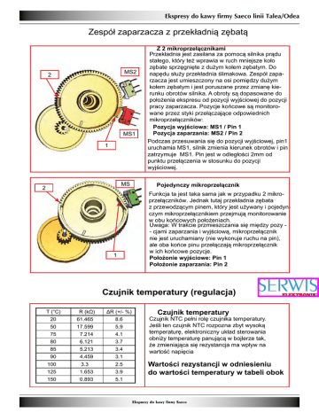 Ekspresy do kawy firmy Saeco linii Talea/Odea Zespół zaparzacza z przekładnią zębatą MS2 2 MS1 1 MS 2 1 Z 2 mikroprzełącznikami Przekładnia jest zasilana za pomocą silnika prądu stałego, który też wprawia w ruch mniejsze koło zębate sprzęgnięte z dużym kołem zębatym. Do napędu służy przekładnia ślimakowa. Zespół zaparzacza jest umieszczony na osi pomiędzy dużym kołem zębatym i jest poruszane przez zmianę kierunku obrotów silnika. A obroty są dopasowane do położenia ekspresu od pozycji wyjściowej do pozycji pracy zaparzacza. Pozycje końcowe są monitorowane przez styki przełączające odpowiednich mikroprzełączników: Pozycja wyjściowa: MS1 / Pin 1 Pozycja zaparzania: MS2 / Pin 2 Podczas przesuwania się do pozycji wyjściowej, pin1 uruchamia MS1, silnik zmienia kierunek obrotów i pin zatrzymuje MS1. Pin jest w odległości 2mm od punktu przełączenia w stosunku do pozycji wyjściowej. Pojedynczy mikroprzełącznik Funkcja ta jest taka sama jak w przypadku 2 mikroprzełączników. Jednak tutaj przekładnia zębata z przewodzącym pinem, który jest używany i pojedynczym mikroprzełącznikiem przejmują monitorowanie w obu końcowych położeniach. Uwaga: W trakcie przmieszczania się między pozy - cjami zaparzania i wyjściową, mikroprzełącznik nie jest uruchamiany (nie wykonuje ruchu na pin), ale oba końce pinu przełączają mikroprzełącznik w ich końcowe pozycje. Położonie wyjściowe: Pin 1 Położonie zaparzania: Pin 2 Czujnik temperatury (regulacja) T (°C) R (kΩ) ΔR (+/- %) 20 61.465 8.6 50 17.599 5.9 75 7.214 4.1 80 6.121 3.7 85 5.213 3.4 90 4.459 3.1 100 3.3 2.5 125 1.653 3.9 150 0.893 5.1 Czujnik temperatury Czujnik NTC pełni rolę czujnika temperatury. Jeśli ten czujnik NTC rozpozna zbyt wysoką temperaturę, elektroniczny układ sterowania obniży temperaturę panującą w bojlerze tak, że zmieniająca się rezystancja ma wpływ na wartość napięcia Wartości rezystancji w odniesieniu do wartości temperatury w tabeli obok Ekspresy do kawy firmy Saeco Ekspresy do kawy firmy Saeco linii Talea/Odea Saeco Brewing System (System zaparzania wg Saeco) SBS – system zaparzania Saeco – zasady Sterowanie prędkością przepływu, która następnie ma wpływ na czas kontaktu między kawą i wodą, powoduje zmiany ekstrakcji i dlatego zmienia się intensywność smaku oraz moc kawy. • Wolniejszy przepływ: mocniejsza ekstrakcja • Szybki przepływ: słabsza ekstrakcja SBS / zawór dozujący Przekręcanie pokrętła SBS powoduje powstanie ciśnienia zwrotnego do zespołu zaparzania, gdzie prędkość przepływu jest regulowana za pomocą zaworu sterującego zawartością śmietanki. Zawór regulujący zawartość śmietanki Duży przepływ (wolna ekstrakcja) Kawa może przepływać szybciej, gdy zawór SBS jest otwarty. Ciśnienie wywierane na membranę jest stosunkowo niskie i przy pomocy sprężyny pozostawia tę membranę prawie w pozycji wyjściowej, a sterowana iglica nie jest wciągnięta do otworu – przepływ pozostaje na niezmienionym poziomie. Zawór regulujący zawartością śmietanki Niski przepływ (mocna ekstrakcja) Kawa może być dawkowana niedpowiednio po zdławieniu zaworu SBS - napór ciśnienia na tylne powierzchnie rozpycha membranę na boki i przesuwa ją wbrew sile sprężyny. W następnym etapie, zawór iglicowy jest wciągnięty do otworu, który obniża przepływ. Ekspresy do kawy firmy Saeco Ekspresy do kawy firmy Saeco linii Talea/Odea Młynek do kawy Ceramiczny młynek do kawy 5 6 4 1 2 3 Młynek do kawy jest napędzany silnikiem prądu stałego (1) za pomocą przekładni ślimakowej (2). Ślimak (2) napędza koło zębate z tworzywa sztucznego (3), gdzie dolna płyta ceramiczna (4) i wykonany z miedzi ślimak (5) jest napędzany do dołu. Dwa magnesy (6) są wbudowane w napędzie przekładni. Czujnik Halla, który zamontowany jest od spodu obudowy,wysyła 2 impulsy do modułu elektroniki. Moduł elektroniki steruje obrotem wykorzystując dwa magnesy Sterowanie ilością dawki, blokada młynka do kawy, gdy w urządzeniu jest za mało ziaren kawy V Mała ilość ziaren kawy Jeśli urządzenie ma za mało ziaren, wykrywana jest bez ziaren kawy różnica prędkości (częstotliwość impulsów czujnika n=100% Halla), gdy młynek jest maksymalnie obciążony, i gdy w jego w cyklu następuje bezczynność. Jeżeli żadnych ziaren młynek nie znajduje (stan jałowy), prędkość jest t wysoka, a częstotliwość impulsów mała. t1 = komunikat „za mało ziaren” . z ziarnami kawy Jeśli ziarna są w młynku, powoduje to n=100% zmniejszenie prędkości pracy młynka ze względu na większe opory, które są stawiane przy mieleniu ziaren. t2 = żaden komunikat nie jest wyświetlany. t t1 t2 bez ziaren kawy t3 i t4 = Pomiar jest przeprowadzony, gdy proces n=50% mielenia spowalnia się na końcu t3 t t4 z ziarnami kawy n=50% t Kontrola ilości dawkowania Dozowana ilość jest sterowana za pomocą zapamiętanych impulsów (liczba obrotów proporcjonalna do wybranych parametrów kawy jak aromat, stopień ekstrakcji, mocna lub słaba Blokada młynka do kawy Jeśli zewnętrzne obiekty wprowadzone do młynka zostaną wykryte przez układ elektroniki, następuje zatrzymanie przepływu i blokada pracy młynka Ekspresy do kawy firmy Saeco Ekspresy do kawy firmy Saeco linii Talea/Odea Automatyczne sterowanie ilością dawki Automatyczne dawkowanie Urządzenia są wyposażone w automatyczną regulację ilości dawki w zależności od zastosowanych, następujących wersji oprogramowania: Model Wersja oprogramowania z automatycznym dozowaniem Talea Touch ≥ V.01.08.14 Talea Ring Plus / Ring ≥ V.02.00.08 Talea Giro i Odea Giro / Go ≥ V01.02.01 Funkcja: Ekspres automatycznie dostosowuje średnią dawkę kawy zgodnie z algorytmem opartym na trzech informacjach zapamiętanych w układzie elektroniki na podstawie wcześniejszych procesów 1. Liczba impulsów mielenia podczas procesu mielenia 2. Maksymalna śre