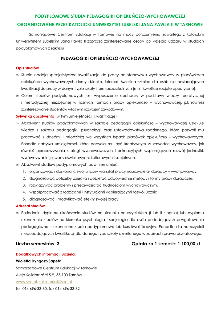 PODYPLOMOWE STUDIA PEDAGOGIKI OPIEKUŃCZO-WYCHOWAWCZEJ ORGANIZOWANE PRZEZ KATOLICKI UNIWERSYTET LUBELSKI JANA PAWŁA II W TARNOWIE Samorządowe Centrum Edukacji w Tarnowie na mocy porozumienia zawartego z Katolickim Uniwersytetem Lubelskim Jana Pawła II zaprasza zainteresowane osoby do wzięcia udziału w studiach podyplomowych z zakresu PEDAGOGIKI OPIEKUŃCZO-WYCHOWAWCZEJ Opis studiów • Studia nadają specjalistyczne kwalifikacje do pracy na stanowisku wychowawcy w placówkach opiekuńczo wychowawczych domy dziecka, internat, świetlica szkolna dla osób nie posiadających kwalifikacji do pracy w danym typie szkoły i form pozaszkolnych (m.in. świetlice socjoterapeutyczne). • Celem studiów podyplomowych jest wyposaŜenie słuchaczy w podstawy wiedzy teoretycznej i metodycznej niezbędnej w róŜnych formach pracy opiekuńczo – wychowawczej, jak równieŜ zainteresowanie studentów własnym rozwojem zawodowym. Sylwetka absolwenta (w tym umiejętności i kwalifikacje) • Absolwent studiów podyplomowych w zakresie pedagogiki opiekuńczo – wychowawczej uzyskuje wiedzę z zakresu pedagogiki, psychologii oraz ustawodawstwa rodzinnego, która pozwoli mu pracować z dziećmi i młodzieŜą we wszystkich typach placówek opiekuńczo – wychowawczych. Ponadto nabywa umiejętności, które pozwolą mu być kreatywnym w zawodzie wychowawcy, jak równieŜ opracowywania strategii wychowawczych i animacyjnych wspierających rozwój jednostki, wyrównywanie jej szans oświatowych, kulturowych i socjalnych. • Absolwent studiów podyplomowych powinien umieć: 1. organizować i doskonalić swój własny warsztat pracy nauczyciela- doradcy – wychowawcy, 2. diagnozować potrzeby dziecka i dobierać odpowiednie metody i formy pracy doradczej, 3. rozwiązywać problemy i przeciwdziałać trudnościom wychowawczym, 4. współpracować z rodzicami i instytucjami wspierającymi rozwój ucznia, 5. diagnozować i modyfikować efekty swojej pracy. Adresat studiów • Posiadanie dyplomu ukończenia studiów na kierunku nauczycielskim (I lub II stopnia) lub dyplomu ukończenia studiów na kierunku psychologia i socjologia dla osób posiadających przygotowanie pedagogiczne – ukończone studia podyplomowe lub kurs kwalifikacyjny. Ponadto dla nauczycieli nieposiadających kwalifikacji dla danego typu szkoły określonego w zapisach prawa oświatowego. Liczba semestrów: 3 Dodatkowych informacji udziela: Wioletta Dyngosz-Sapeta Samorządowe Centrum Edukacji w Tarnowie Aleja Solidarności 5-9, 33-100 Tarnów www.sce.pl, [email protected] tel. 014 696-33-80, fax 014 696-33-82 Opłata za 1 semestr: 1.100,00 zł