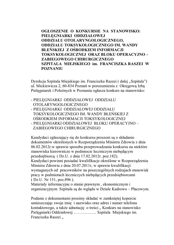 OGŁOSZENIE O KONKURSIE NA STANOWISKO: PIELĘGNIARKI ODDZIAŁOWEJ ODDZIAŁU OTOLARYNGOLOGICZNEGO, ODDZIAŁU TOKSYKOLOGICZNEGO IM. WANDY BŁEŃSKIEJ Z OŚRODKIEM INFORMACJI TOKSYKOLOGICZNEJ ORAZ BLOKU OPERACYJNO – ZABIEGOWEGO CHIRURGICZNEGO SZPITALA MIEJSKIEGO im. FRANCISZKA RASZEI W POZNANIU Dyrekcja Szpitala Miejskiego im. Franciszka Raszei ( dalej „Szpitala”) ul. Mickiewicza 2, 60-834 Poznań w porozumieniu z Okręgową Izbą Pielęgniarek i Położnych w Poznaniu ogłasza konkurs na stanowisko: - PIELĘGNIARKI ODDZIAŁOWEJ ODDZIAŁU OTOLARYNGOLOGICZNEGO - PIELĘGNIARKI ODDZIAŁOWEJ ODDZIAŁU TOKSYKOLOGICZNEGO IM. WANDY BŁEŃSKIEJ Z OŚRODKIEM INFORMACJI TOKSYKOLOGICZNEJ - PIELĘGNIARKI ODDZIAŁOWEJ BLOKU OPERACYJNO – ZABIEGOWEGO CHIRURGICZNEGO Kandydaci zgłaszający się do konkursu proszeni są o składanie dokumentów określonych w Rozporządzeniu Ministra Zdrowia z dnia 06.02.2012r.w sprawie sposobu przeprowadzania konkursu na niektóre stanowiska kierownicze w podmiocie leczniczym niebędącym przedsiębiorcą ( Dz.U. z dnia 17.02.2012r. poz.182). Kandydaci powinni posiadać kwalifikacje określone w Rozporządzeniu Ministra Zdrowia z dnia 20.07.2011r, w sprawie kwalifikacji wymaganych od pracowników na poszczególnych rodzajach stanowisk pracy w podmiotach leczniczych niebędących przedsiębiorcami ( Dz.U. Nr 151, poz.896 ). Materiały informacyjne o stanie prawnym , ekonomicznym i organizacyjnym Szpitala są do wglądu w Dziale Kadrowo – Płacowym. Podanie z dokumentami prosimy składać w zamkniętej kopercie umieszczając swoje imię i nazwisko oraz adres i numer telefonu kontaktowego, a także adnotację o treści „ Konkurs na stanowisko Pielęgniarki Oddziałowej …………….. Szpitala Miejskiego im. Franciszka Raszei „ w terminie 30 dni od daty ukazania się ogłoszenia w Dzienniku Ogólnopolskim „Rzeczpospolita ” pod adresem: Szpital Miejski im. Franciszka Raszei ul. Mickiewicza 2, 60-834 Poznań. Konkurs odbędzie się w okresie 30dni od daty upływu terminu składania ofert. O terminie i miejscu przeprowadzenia konkursu kandydaci zostaną powiadomieni indywidualnie. Wynagrodzenie według Zakładowego Układu Zbiorowego Pracy dla Pracowników Szpitala Miejskiego im. Franciszka Raszei. Mieszkania nie zapewniamy.