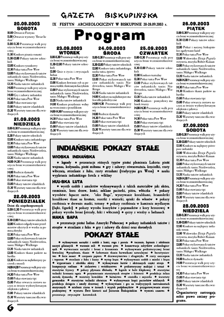 20.09.2003 SOBOTA 10.00 Otwarcie Festynu 11.00 Otwarcie wystawy "Świat In− dian” 11.00−11.30 Prezentacje walk przy użyciu broni wczesnośredniowie− cznej 11.30 Konkurs pisania runami 11.30−12.00 Pokazy tańców szkoc− kich 12.00 Konkurs rysunkowy 12.30 Pokaz tańca Pow Wow 13.00 Pokaz stylizowanych tańców indiańskich: taniec Niedźwiedzia, taniec Małego i Wielkiego 13.20 Nauka tańców indiańskich 14.00 Prezentacje walk przy użyciu broni wczesnośredniowiecznej 14.00 Gry i zabawy indiańskie 14.30 Pokaz tańca Pow Wow 15.00 Pokaz stawiania tipi 15.00 Pokazy tańców irlandzkich 15.30 Warsztaty taneczne dla zwie− dzających 21.09.2003 NIEDZIELA 11.00−11.30 Prezentacje walk przy uży− ciu broni wczesnośredniowiecznej 11.30 Pokazy tańców szkockich 12.00 Konkurs tańca indiańskiego 12.30 Pokaz tańca Pow Wow 13.00 Pokaz stylizowanych tańców indiańskich: taniec Niedźwiedzia, taniec Małego i Wielkiego 13.20 Nauka tańców indiańskich 14 .00−14.30 Prezentacje walk przy 14.00−14.30 użyciu broni wczesnośredniowie− cznej 14.00 Rozbicie dymarki 14.30 Pokaz tańca Pow Wow 15.00 Pokaz stawiania tipi 15.00 Pokazy tańców irlandzkich 15.30 Warsztaty taneczne dla zwie− dzających 22.09.2003 PONIEDZIAŁEK Dzień dla niepełnosprawnych 11 .00−11.30 Prezentacje walk przy 11.00−11.30 użyciu broni wczesnośredniowie− cznej 11.30−12.00 Pokazy tańców szkockich 12.00 Konkurs odgadywanie przed− miotów ukrytych w worku za po− mocą dotyku 12.30 Pokaz tańca Pow Wow 13.00 Pokaz stylizowanych tańców indiańskich: taniec Niedźwiedzia, taniec Małego i Wielkiego 13.20 Nauka tańców indiańskich 13.00 Konkurs tkanie pasków na bardku 13.30 Konkurs na najładniejszy pa− ciorek z muszli 14.00−14.30 Prezentacje walk przy uży− ciu broni wczesnośredniowiecznej 14.30 Pokaz tańca Pow Wow 15.00 Pokaz stawiania tipi 15.00 Pokaz otwarcia zestawu na− czyń ze świeżo wydestylowanym olejkiem z jałowca 15.00 Pokazy tańców irlandzkich 15.30 Warsztaty taneczne dla zwie− dzających IX FESTYN ARCHEOLOGICZNY W BISKUPINIE 20−28.09.2003 r. Program 23.09.2003 WTOREK 11.00−11.30 Prezentacje walk przy uży− ciu broni wczesnośredniowiecznej 11.30−12.00 Pokazy tańców szkoc− kich 12.00 Quiz o życiu i zwyczajach Indian 12.30 Pokaz tańca Pow Wow 13.00 Konkurs łowienie ryb za po− mocą wędek z kościanym haczykiem 13.00 Pokaz stylizowanych tańców indiańskich: taniec Niedźwiedzia, taniec Małego i Wielkiego 13.20 Nauka tańców indiańskich 14.00 Konkurs przędzenie wełny na wrzecionie z przęślikiem 14.00−14.30 Prezentacje walk przy uży− ciu broni wczesnośredniowiecznej 14.30 Pokaz tańca Pow Wow 15.00 Pokaz stawiania tipi 15.00 Pokazy tańców irlandzkich 5.30 Warsztaty taneczne dla zwie− 15.30 dzających 24.09.2003 ŚRODA 25.09.2003 CZWARTEK 11.00−11.30 Prezentacje walk przy uży− ciu broni wczesnośredniowiecznej 11.30−12.00 Pokazy tańców szkockich 12.00 Konkurs tańca indiańskiego, nauka tańca, śpiewu 12.30 Pokaz tańca Pow Wow 13.00 Pokaz stylizowanych tań− ców indiańskich: taniec Nie− dźwiedzia, taniec Małego i Wie− lkiego 13.20 Nauka tańców indiańskich 14.00 Konkurs na najładniejsze ma− lowidło paleolityczne 14.00−14.30 Prezentacje walk przy użyciu broni wczesnośredniowiecz− nej 14.00 Rozbicie dymarki 14.30 Pokaz tańca Pow Wow 15.00 Pokaz stawiania tipi 15.00 Pokazy tańców irlandzkich 15.30 Warsztaty taneczne dla zwie− dzających 26.09.2003 PIĄTEK 11.00−11.30 Prezentacje walk przy uży− ciu broni wczesnośredniowiecznej 11.30−12.00 Pokazy tańców szkoc− kich 12.00 Pokaż i narysuj biskupińs− kie zgadywanie haseł 12.30 Pokaz tańca Pow Wow 13.00 Widowisko Dzieje Popiela reżyseria, muzyka Robert Kanaan 13.00 Pokaz stylizowanych tańców indiańskich: taniec Niedźwiedzia, taniec Małego i Wielkiego 13.20 Nauka tańców indiańskich 14.00−14.30 Prezentacje walk przy uży− ciu broni wczesnośredniowiecznej 14.30 Pokaz tańca Pow Wow 14.30 Konkurs tkanie pasków na bardku 15.00 Pokaz stawiania tipi 15.00 Pokaz otwarcia zestawu na− czyń ze świeżo wydestylowanym olejkiem z jałowca 15.00 Pokazy tańców irlandzkich 15.30 Warsztaty taneczne dla zwie− dzających 11.00−11.30 Prezentacje walk przy użyciu broni wczesnośredniowie− cznej 11.30−12.00 Pokazy tańców szkoc− kich 12.00 Konkurs teatralny 12.30 Pokaz tańca Pow Wow 13.00 Pokaz stylizowanych tań− ców indiańskich: taniec Nie− dźwiedzia, taniec Małego i Wie− lkiego 13.20 Nauka tańców indiańskich 14.00 Konkurs − pomysłowy ma− lunek twarzy 14.00−14.30 Prezentacje walk przy użyciu broni wczesnośredniowie− cznej 14.30 Pokaz tańca Pow Wow 15.00 Pokaz stawiania tipi 27.09.2003 15. 00 Pokazy tańców irlandzkich 15.00 15.30 Warsztaty taneczne dla zwie− SOBOTA dzających 11.00−11.30 Prezentacje walk przy uży− ciu broni wczesnośredniowiecznej 11.30−12.00 Pokazy tańców szkockich 12.00 Konkurs na najlepszy pióro− pusz indiański 12.00 Widowisko Dzieje Popiela reżyseria, muzyka Robert Kanaan WIOSKA INDIAŃSKA 12.30 Pokaz tańca Pow Wow l legendy l prezentacje różnych typów pieśni plemienia Lakota: pieśń 13.00 Pokaz stylizowanych tańców wojenna, kołysanka, pieśń miłosna l gry i zabawy: równoważnia, kręciołki, rzuty indiańskich: taniec Niedźwiedzia, taniec Małego i Wielkiego włócznią, strzelanie z łuku, rzuty strzałami (tradycyjna gra Wron) l nauka 13.20 Nauka tańców indiańskich wyplatania indiańskiego fotela z wikliny 14.00−14.30 Prezentacje walk przy uży− ciu broni wczesnośredniowiecznej HUU−SKA LUTA 14.30 Pokaz tańca Pow Wow l wyrób ozdób i amuletów wykonywanych z takich materiałów jak: skóra, 15.00 Pokaz stawiania tipi rzemienie, kora drzew, kości, szklane paciorki, pióra, włóczka l pokazy 15.00 Pokazy tańców irlandzkich wyrobów: łapacze snów, "oko Boga”, wyszywanie koralikami, bransoletki 15.30 Warsztaty taneczne dla zw