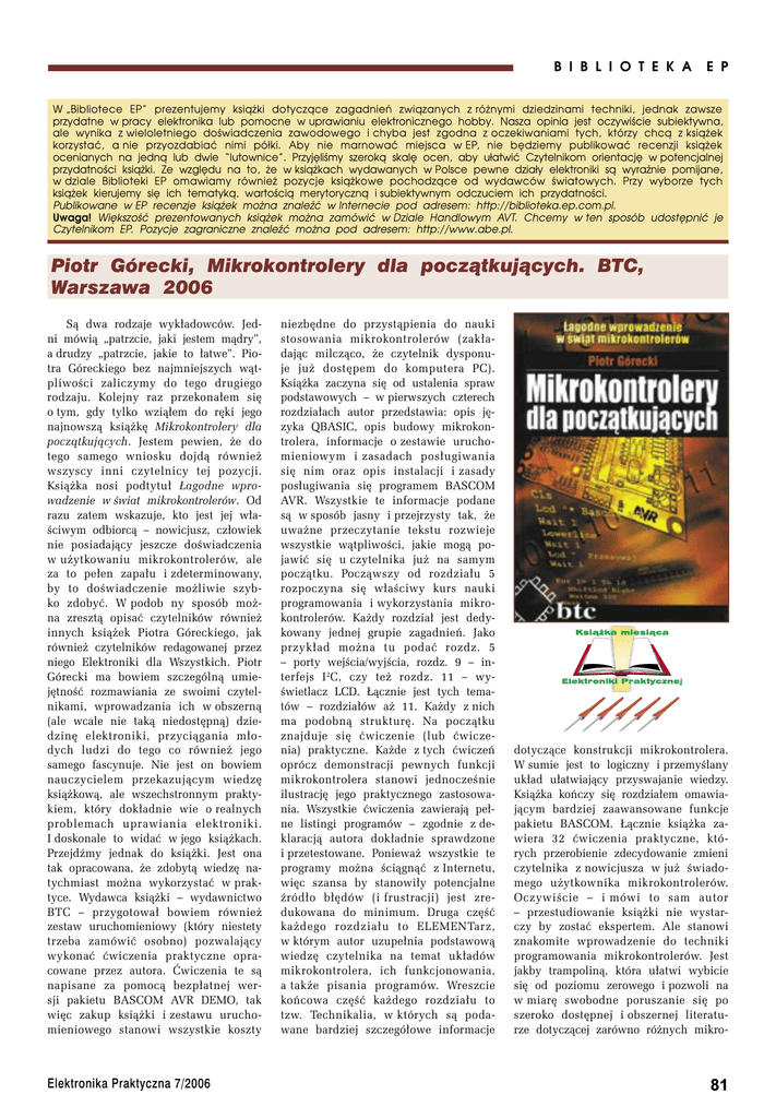 B I B L I O T E K A E P W „Bibliotece EP” prezentujemy książki dotyczące zagadnień związanych z różnymi dziedzinami techniki, jednak zawsze przydatne w pracy elektronika lub pomocne w uprawianiu elektronicznego hobby. Nasza opinia jest oczywiście subiektywna, ale wynika z wieloletniego doświadczenia zawodowego i chyba jest zgodna z oczekiwaniami tych, którzy chcą z książek korzystać, a nie przyozdabiać nimi półki. Aby nie marnować miejsca w EP, nie będziemy publikować recenzji książek ocenianych na jedną lub dwie “lutownice”. Przyjęliśmy szeroką skalę ocen, aby ułatwić Czytelnikom orientację w potencjalnej przydatności książki. Ze względu na to, że w książkach wydawanych w Polsce pewne działy elektroniki są wyraźnie pomijane, w dziale Biblioteki EP omawiamy również pozycje książkowe pochodzące od wydawców światowych. Przy wyborze tych książek kierujemy się ich tematyką, wartością merytoryczną i subiektywnym odczuciem ich przydatności. Publikowane w EP recenzje książek można znaleźć w Internecie pod adresem: http://biblioteka.ep.com.pl. Uwaga! Większość prezentowanych książek można zamówić w Dziale Handlowym AVT. Chcemy w ten sposób udostępnić je Czytelnikom EP. Pozycje zagraniczne znaleźć można pod adresem: http://www.abe.pl. Piotr Górecki, Mikrokontrolery dla początkujących. BTC, Warszawa 2006 Są dwa rodzaje wykładowców. Jedni mówią „patrzcie, jaki jestem mądry”, a drudzy „patrzcie, jakie to łatwe”. Piotra Góreckiego bez najmniejszych wątpliwości zaliczymy do tego drugiego rodzaju. Kolejny raz przekonałem się o tym, gdy tylko wziąłem do ręki jego najnowszą książkę Mikrokontrolery dla początkujących. Jestem pewien, że do tego samego wniosku dojdą również wszyscy inni czytelnicy tej pozycji. Książka nosi podtytuł Łagodne wprowadzenie w świat mikrokontrolerów. Od razu zatem wskazuje, kto jest jej właściwym odbiorcą – nowicjusz, człowiek nie posiadający jeszcze doświadczenia w użytkowaniu mikrokontrolerów, ale za to pełen zapału i zdeterminowany, by to doświadczenie możliwie szybko zdobyć. W podob ny sposób można zresztą opisać czytelników również innych książek Piotra Góreckiego, jak również czytelników redagowanej przez niego Elektroniki dla Wszystkich. Piotr Górecki ma bowiem szczególną umiejętność rozmawiania ze swoimi czytelnikami, wprowadzania ich w obszerną (ale wcale nie taką niedostępną) dziedzinę elektroniki, przyciągania młodych ludzi do tego co również jego samego fascynuje. Nie jest on bowiem nauczycielem przekazującym wiedzę książkową, ale wszechstronnym praktykiem, który dokładnie wie o realnych problemach uprawiania elektroniki. I doskonale to widać w jego książkach. Przejdźmy jednak do książki. Jest ona tak opracowana, że zdobytą wiedzę natychmiast można wykorzystać w praktyce. Wydawca książki – wydawnictwo BTC – przygotował bowiem również zestaw uruchomieniowy (który niestety trzeba zamówić osobno) pozwalający wykonać ćwiczenia praktyczne opracowane przez autora. Ćwiczenia te są napisane za pomocą bezpłatnej wersji pakietu BASCOM AVR DEMO, tak więc zakup książki i zestawu uruchomieniowego stanowi wszystkie koszty Elektronika Praktyczna 7/2006 niezbędne do przystąpienia do nauki stosowania mikrokontrolerów (zakładając milcząco, że czytelnik dysponuje już dostępem do komputera PC). Książka zaczyna się od ustalenia spraw podstawowych – w pierwszych czterech rozdziałach autor przedstawia: opis języka QBASIC, opis budowy mikrokontrolera, informacje o zestawie uruchomieniowym i zasadach posługiwania się nim oraz opis instalacji i zasady posługiwania się programem BASCOM AVR. Wszystkie te informacje podane są w sposób jasny i przejrzysty tak, że uważne przeczytanie tekstu rozwieje wszystkie wątpliwości, jakie mogą pojawić się u czytelnika już na samym początku. Począwszy od rozdziału 5 rozpoczyna się właściwy kurs nauki programowania i wykorzystania mikrokontrolerów. Każdy rozdział jest dedykowany jednej grupie zagadnień. Jako przykład można tu podać rozdz. 5 – porty wejścia/wyjścia, rozdz. 9 – interfejs I 2C, czy też rozdz. 11 – wyświetlacz LCD. Łącznie jest tych tematów – rozdziałów aż 11. Każdy z nich ma podobną strukturę. Na początku znajduje się ćwiczenie (lub ćwiczenia) praktyczne. Każde z tych ćwiczeń oprócz demonstracji pewnych funkcji mikrokontrolera stanowi jednocześnie ilustrację jego praktycznego zastosowania. Wszystkie ćwiczenia zawierają pełne listingi programów – zgodnie z deklaracją autora dokładnie sprawdzone i przetestowane. Ponieważ wszystkie te programy można ściągnąć z Internetu, więc szansa by stanowiły potencjalne źródło błędów (i frustracji) jest zredukowana do minimum. Druga część każdego rozdziału to ELEMENTarz, w którym autor uzupełnia podstawową wiedzę czytelnika na temat układów mikrokontrolera, ich funkcjonowania, a także pisania programów. Wreszcie końcowa część każdego rozdziału to tzw. Technikalia, w których są podawane bardziej szczegółowe informacje dotyczące konstrukcji mikrokontrolera. W sumie jest to logiczny i przemyślany układ ułatwiający przyswajanie wiedzy. Książka kończy się rozdziałem omawiającym bardziej zaawansowane funkcje pakietu BASCOM. Łącznie książka zawiera 32 ćwiczenia praktyczne, których przerobienie zdecydowanie zmieni czytelnika z nowicjusza w już świadomego użytkownika mikrokontrolerów. Oczywiście – i mówi to sam autor – przestudiowanie książki nie wystarczy by zostać ekspertem. Ale stanowi znakomite wprowadzenie do techniki programowania mikrokontrolerów. Jest jakby trampoliną, która ułatwi wybicie się od poziomu zerowego i pozwoli na w miarę swobodne poruszanie się po szeroko dostępnej i obszernej literaturze dotyczącej zarówno różnych mikro- 81 B I B L I O T E