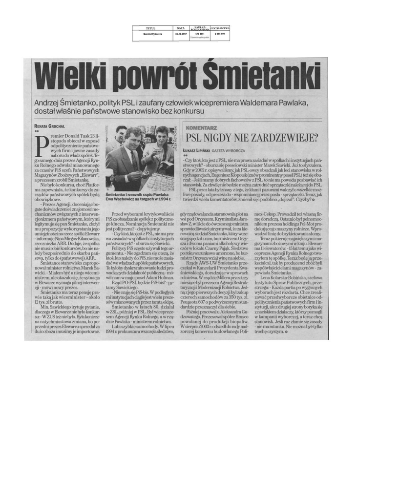 TYTUŁ Gazeta Wyborcza NAKŁAD CZYTELNICTWO RODZAJ PISMA DATA 05-12-2007 573 000 Dziennik ogólnopolski 2 005 500 WielKl powrót SmietanKi Andrzej Śmietanko, polityk PSL i zaufany człowiek wicepremiera Waldemara Pawlaka, dostał właśnie państwowe stanowisko bez konkursu RENATA GROCHAL KOMENTARZ »• remier Donald Tusk 23 li stopada obiecał w expose odpolitycznienie państwo wych firm i jawne zasady naboru do władz spółek. Te go samego dnia prezes Agencji Ryn ku Rolnego odwołał mianowanego za czasów PiS szefa Państwowych Magazynów Zbożowych „Elewarr", a prezesem zrobił Śmietankę. Nie było konkursu, choć Platfor ma zapewniała, że konkursy do za rządów państwowych spółek będą obowiązkowe. - Prezes Agencji, doceniając bo gate doświadczenie i znajomość me chanizmów związanych z interwencjonizmem państwowym, którymi legitymuje się pan Śmietanko, złożył mu propozycję wykorzystania jego umiejętności na rzecz spółki Elewarr - informuje Nina Mirgos-Kilanowska, rzeczniczka ARR. Dodaje, że spółka nie musi robić konkursów, bo nie na leży bezpośrednio do skarbu pań stwa, tylko do (państwowej) ARR. Śmietance stanowisko zapropo nował minister rolnictwa Marek Sawicki. - Miałem być u niego wicemi nistrem, ale okazało się, że sytuacja w Elewarze wymaga pilnej interwen cji - mówi nowy prezes. Śmietanko ma teraz pensję pra wie taką jak wiceminister - około 12 tys.zl brutto. Min. Sawickiego irytuje pytanie, dlaczego w Elewarze nie było konkui^ su: - W ZUS też nie było. Była koniecz na natychmiastowa zmiana, bo po przedni prezes Ełewarru sprzedał za dużo zboża i musimyje importować. PSL NIGDY NIE ZARDZEWIEJE? P ŁUKASZ LIPIŃSKI GAZETA WYBORCZA »• Śmietanko i rzecznik rządu Pawlaka Ewa Wacliowicz na targacli w 1994 r. Przed wyborami krytykowaliście PiS za obsadzanie spółek z polityczne go klucza. Nominacja Śmietanki nie jest polityczna? - dopytujemy. - Czy ktoś, kto jest z PSL, nie ma pra wa zasiadać w spółkach i instytucjach państwowych? - oburza się Sawicki. Politycy PiS często używali tego ar gumentu. - Nie zgadzam się z tezą, że ktoś, kto należy do PiS, nie może zasia dać we władzach spółek państwowych. To byłoby dyskryminowanie ludzi pro wadzących działalność publiczną - mó wił nam w maju poseł Adam Hofman. Rząd PO-PSL będzie PiS-bis? - py tamy Sawickiego. - Nie czuję się IHS-bis. W podległych mi instytucjach ciąglejest wielu preze sów mianowanych przez tamtą ekipę. Śmietanko w latach 80. działał w ZSL, później w PSL. Był wicepreze sem Agencji Rynku Rolnego, a w rzą dzie Pawlaka - ministrem rolnictwa. Lubi szybkie samochody. W lipcu 1994 r. prokuratura wszczęła śledztwo. - Czy ktoś, kto jest z PSL, nie ma prawa zasiadać w spółkach i instytucjach pań stwowych? - oburza się peeselowski minister Marek Sawicki. Już to słyszałem. Gdy w 2002 r. opisywaliśmy, jak PSL-owcy obsadzali jak leci stanowiska w rol nych agencjach, Eugeniusz Klopotek (znów prominentny poseł PSL) też się obu rzał: - Jeśli mamy dobrych fachowców z PSL, to nie ma powodu pozbawiać ich stanowisk. Za chwilę nie będzie można zatrudnić sprzątaczki należącej do PSL. PSL przez łata był znany z tego, że kłami i pazurami walczył o wszelkie moż liwe posady, od prezesa do - wspomnianej przez posła - sprzątaczki. Teraz, jak twierdzi wielu komentatorów, zmienił się i podobno „dojrzał". Czyżby? o gdy rządowa lancia staranowała płot na wsi pod Orzyszem. Kryminalista Jaro sław Z. w liście do ówczesnego ministra sprawiedliwości utrzymywał, że za kie rownicą siedział Śmietanko, który wcze śniej spędził z nim, burmistrzem Orzy sza i dwoma paniami alkoholowy wie czór w lokalu Czarny Paj ąk. Śledztwo po roku warunkowo umorzono, bo bur mistrz Orzysza wziął winę na siebie. Rządy AWS-UW Śmietanko prze czekał w Kancelarii Prezydenta Kwa śniewskiego, doradzając w sprawach rolnictwa. W rządzie Millera przez trzy miesiące był prezesem Agencji Restruk turyzacji i Modernizacji Rolnictwa Jed ną zjego pierwszych decyzji był zakup czterech samochodów za 350 tys. zł. Peugeota 607 o podwyższonjTn stan dardzie przeznaczył dla siebie. Później pracował u Aleksandra Gudzowatego. Prezesował spółce Brasco powołanej do produkcji biopaliw. W sierpniu 2003 n odszedł do rady nad zorczej koncernu budowlanego Poli- mex-Cekop. Prowadził też własną fir mę doradczą. Ostatnio był pełnomoc nikiem prezesa holdingu Pol-Mot pro dukującego maszyny rolnicze. Wpro wadzał linię do brykietowania słomy. Teraz pokieruje największymi ma gazynami zbożowymi w kraju. Elewarr ma U elewatorów. -15 lat temu jako wi ceprezes Agencji Rynku Rolnego two rzyłem tę spółkę. Teraz będę ją prze kształcał, tak by producenci zbóż byli współwłaścicielami magazjmów - za powiada Śmietanko. Lena Kolarska-Bobińska, szefowa Instytutu Spraw Publicznych, prze strzega: - Każda partia po wygranych wyborach jest rozdarta. Chce zreali zować przedwyborcze obietnice od politycznienia państwowychfirmi in stytucji, ale z drugiej strony boryka się z naciskiem działaczy, którzy pomogli w kampanii wyborczej, a teraz chcą stanowisk. Jeśli raz złamie się zasady - nie ma ratunku. Nie można być tylko trochę czystym, o