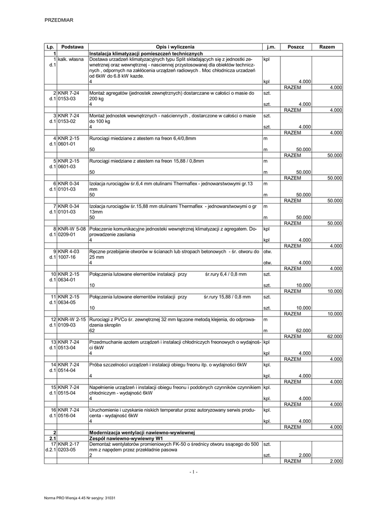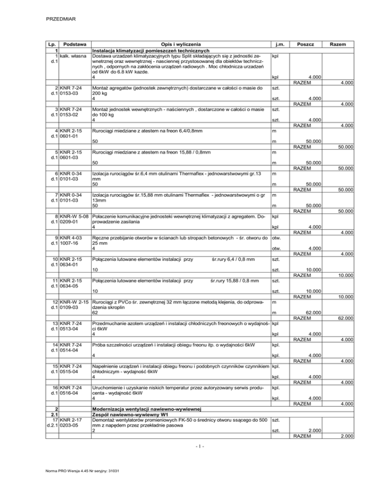 PRZEDMIAR Lp. Podstawa 1 1 kalk. własna d.1 2 KNR 7-24 d.1 0153-03 3 KNR 7-24 d.1 0153-02 4 KNR 2-15 d.1 0601-01 5 KNR 2-15 d.1 0601-03 6 KNR 0-34 d.1 0101-03 7 KNR 0-34 d.1 0101-03 Opis i wyliczenia Instalacja klimatyzacji pomieszczeń technicznych Dostawa urzadzeń klimatyzacyjnych typu Split składających się z jednostki zewnetrznej oraz wewnętrznej - nasciennej przystosowanej dla obiektów technicznych , odpornych na zakłócenia urządzeń radiowych . Moc chłodnicza urzadzeń od 6kW do 6.8 kW kazde. 4 10 KNR 2-15 d.1 0634-01 Montaż jednostek wewnętrznych - naściennych , dostarczone w całości o masie do 100 kg 4 szt. Rurociągi miedziane z atestem na freon 6,4/0,8mm m 50 m Rurociągi miedziane z atestem na freon 15,88 / 0,8mm m 50 m Izolacja rurociągów śr.6,4 mm otulinami Thermaflex - jednowarstwowymi gr.13 mm 50 m Izolacja rurociągów śr.15,88 mm otulinami Thermaflex - jednowarstwowymi o gr 13mm 50 m śr.rury 6,4 / 0,8 mm Połączenia lutowane elementów instalacji przy śr.rury 15,88 / 0,8 mm 15 KNR 7-24 d.1 0515-04 16 KNR 7-24 d.1 0516-04 2 2.1 17 KNR 2-17 d.2.1 0203-05 m m kpl 4.000 RAZEM 4.000 4.000 RAZEM 4.000 50.000 RAZEM 50.000 50.000 RAZEM 50.000 50.000 RAZEM 50.000 50.000 RAZEM 50.000 4.000 RAZEM 4.000 4.000 RAZEM 4.000 10.000 RAZEM 10.000 10.000 RAZEM 10.000 62.000 RAZEM 62.000 4.000 RAZEM 4.000 4.000 RAZEM 4.000 4.000 RAZEM 4.000 4.000 RAZEM 4.000 2.000 RAZEM 2.000 m m kpl. 4 kpl. Napełnienie urządzeń i instalacji obiegu freonu i podobnych czynników czynnikiem kpl. chłodniczym - wydajność 6kW 4 kpl. kpl. kpl. Modernizacja wentylacji nawiewno-wywiewnej Zespół nawiewno-wywiewny W1 Demontaż wentylatorów promieniowych FK-50 o średnicy otworu ssącego do 500 szt. mm z napędem przez przekładnie pasowa 2 szt. Norma PRO Wersja 4.45 Nr seryjny: 31031 4.000 szt. Próba szczelności urządzeń i instalacji obiegu freonu itp. o wydajności 6kW -1- 4.000 RAZEM szt. Przedmuchanie azotem urządzeń i instalacji chłodniczych freonowych o wydajnoś- kpl ci 6kW 4 kpl Uruchomienie i uzyskanie niskich temperatur przez autoryzowany serwis producenta - wydajność 6kW 4 Razem kpl szt. 12 KNR-W 2-15 Rurociągi z PVCo śr. zewnętrznej 32 mm łączone metodą klejenia, do odprowad.1 0109-03 dzenia skroplin 62 14 KNR 7-24 d.1 0514-04 szt. szt. 10 13 KNR 7-24 d.1 0513-04 szt. Ręczne przebijanie otworów w ścianach lub stropach betonowych - śr. otworu do otw. 25 mm 4 otw. 10 11 KNR 2-15 d.1 0634-05 kpl szt. Połączenia lutowane elementów instalacji przy Poszcz kpl Montaż agregatów (jednostek zewnętrznych) dostarczane w całości o masie do 200 kg 4 8 KNR-W 5-08 Połaczenie komunikacyjne jednosteki wewnętrznej klimatyzacji z agregatem. Dod.1 0209-01 prowadzenie zasilania 4 9 KNR 4-03 d.1 1007-16 j.m. PRZEDMIAR Lp. Podstawa 18 KNR 2-17 d.2.1 0203-05 19 KNR 2-17 d.2.1 0154-06 Opis i wyliczenia j.m. Dostawa i montaż wentylatorów promieniowych FK-50 o średnicy otworu ssącego szt. do 500 mm z napędem bezpośrednim (rama amortyzacyjna, króciec wlotu/wylotu, falownik) 2 szt. szt. 20 KNR-W 2-17 Przeróbka kanałów zwiazana z wymianą wentylatorów i montażem tłumika d.2.1 0103-06 15 22 KNR 2-17 d.2.2 0203-05 Wyciąg W2 Demontaż wentylatorów promieniowych FK-31,5 o średnicy otworu ssącego do 315 mm z napędem przez przekładnie pasowa 2 25 KNR 2-17 d.2.3 0203-05 Wyciąg W3 Demontaż wentylatorów promieniowych FK-31,5 o średnicy otworu ssącego do 315 mm z napędem przez przekładnie pasowa 2 28 KNR 2-17 d.2.4 0203-05 29 KNR 2-17 d.2.4 0154-06 Nawiew W4 Demontaż wentylatorów promieniowych FK-31,5 o średnicy otworu ssącego do 315 mm z napędem przez przekładnie pasowa 2 33 KNR 2-17 d.2.5 0154-06 1.000 RAZEM 1.000 15.000 RAZEM 15.000 szt. 2.000 RAZEM 2.000 2.000 RAZEM 2.000 15.000 RAZEM 15.000 2.000 RAZEM 2.000 2.000 RAZEM 2.000 15.000 RAZEM 15.000 2.000 RAZEM 2.000 2.000 RAZEM 2.000 1.000 RAZEM 1.000 15.000 RAZEM 15.000 2.000 RAZEM 2.000 2.000 RAZEM 2.000 1.000 RAZEM 1.000 m2 m2 szt. szt. m2 m2 szt. szt. Dostawa i montaż tlumika akustycznego na kanale nawiewnym 400x250 L=1500 szt. szt. 30 KNR-W 2-17 Przeróbka kanałów zwiazana z wymianą wentylatorów i montażem tłumika d.2.4 0123-03 15 32 KNR 2-17 d.2.5 0203-05 2.000 szt. Dostawa i montaż wentylatorów promieniowych WWOaxx -22,4 o średnicy otworu szt. ssącego do 224 mm z napędem bezpośrednim (rama amortyzacyjna, króciec wlotu/wylotu, falownik) 2 szt. 1 2.5 31 KNR 2-17 d.2.5 0203-03 m2 Dostawa i montaż wentylatorów promieniowych WWOaxx -31,5 o średnicy otworu szt. ssącego do 315 mm z napędem bezpośrednim (rama amortyzacyjna, króciec wlotu/wylotu, falownik) 2 szt. 26 KNR-W 2-17 Przeróbka kanałów zwiazana z wymianą wentylatorów d.2.3 0123-03 15 2.4 27 KNR 2-17 d.2.4 0203-03 2.000 RAZEM m2 Dostawa i montaż wentylatorów promieniowych FK-31,5 o średnicy otworu ssące- szt. go do 315 mm z napędem bezpośrednim (rama amortyzacyjna, króciec wlotu/wylotu, falownik) 2 szt. 23 KNR-W 2-17 Przeróbka kanałów zwiazana z wymianą wentylatorów d.2.2 0123-03 15 2.3 24 KNR 2-17 d.2.3 0203-03 Razem Dostawa i montaż tlumika akustycznego na kanale nawiewnym 800x500 L=1250 szt. 1 2.2 21 KNR 2-17 d.2.2 0203-03 Poszcz Nawiew W5 Demontaż wentylatorów promieniowych FK-31,5 o średnicy otworu ssącego do 315 mm z napędem przez przekładnie pasowa 2 m2 m2 szt. szt. Dostawa i montaż wentylatorów promieniowych FK-31,5 o średnicy otworu ssące- szt. go do 315 mm z napędem bezpośrednim (rama amortyzacyjna, króciec wlotu/wylotu, falownik) 2 szt. Dostawa i montaż tlumika akustycznego na kanale nawiewnym fi 315 L=900 szt. 1 szt. -2- Norma PRO Wersja 4.45 Nr seryjny: 31031 PRZEDMIAR Lp. Podstawa Opis i wyliczenia j.m. 34 KNR-W 2-17 Przeróbka kanałów zwiazana z wymianą wentylatorów i montażem tłumika i zmianą m2 d.2.5 0123-03 lokaiizacji przepustnicy 15 m2 2.6 35 kalk własna d.2.6 2.8 37 kalk. własna d.2.8 Razem 15.000 RAZEM 15.000 3.000 RAZEM 3.000 335.000 RAZEM 335.000 84.000 RAZEM 84.
