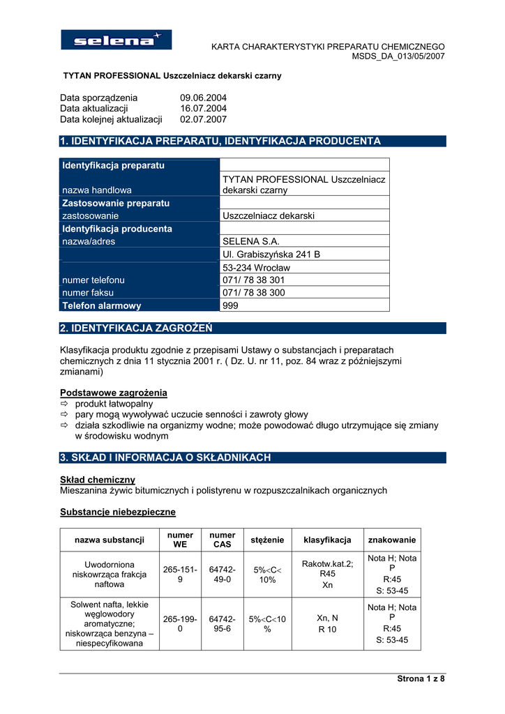 KARTA CHARAKTERYSTYKI PREPARATU CHEMICZNEGO MSDS_DA_013/05/2007 TYTAN PROFESSIONAL Uszczelniacz dekarski czarny Data sporządzenia Data aktualizacji Data kolejnej aktualizacji 09.06.2004 16.07.2004 02.07.2007 1. IDENTYFIKACJA PREPARATU, IDENTYFIKACJA PRODUCENTA Identyfikacja preparatu TYTAN PROFESSIONAL Uszczelniacz dekarski czarny nazwa handlowa Zastosowanie preparatu zastosowanie Identyfikacja producenta nazwa/adres Uszczelniacz dekarski SELENA S.A. Ul. Grabiszyńska 241 B 53-234 Wrocław 071/ 78 38 301 071/ 78 38 300 999 numer telefonu numer faksu Telefon alarmowy 2. IDENTYFIKACJA ZAGROśEŃ Klasyfikacja produktu zgodnie z przepisami Ustawy o substancjach i preparatach chemicznych z dnia 11 stycznia 2001 r. ( Dz. U. nr 11, poz. 84 wraz z późniejszymi zmianami) Podstawowe zagroŜenia produkt łatwopalny pary mogą wywoływać uczucie senności i zawroty głowy działa szkodliwie na organizmy wodne; moŜe powodować długo utrzymujące się zmiany w środowisku wodnym 3. SKŁAD I INFORMACJA O SKŁADNIKACH Skład chemiczny Mieszanina Ŝywic bitumicznych i polistyrenu w rozpuszczalnikach organicznych Substancje niebezpieczne nazwa substancji numer WE numer CAS stęŜenie klasyfikacja znakowanie Uwodorniona niskowrząca frakcja naftowa 265-1519 6474249-0 5%<C< 10% Rakotw.kat.2; R45 Xn Nota H; Nota P R:45 S: 53-45 Solwent nafta, lekkie węglowodory aromatyczne; niskowrząca benzyna – niespecyfikowana 265-1990 6474295-6 5%<C<10 % Xn, N R 10 Nota H; Nota P R:45 S: 53-45 Strona 1 z 8 KARTA CHARAKTERYSTYKI PREPARATU CHEMICZNEGO MSDS_DA_013/05/2007 TYTAN PROFESSIONAL Uszczelniacz dekarski czarny 4. PIERWSZA POMOC W przypadku wdychania substancji Przenieść poszkodowanego na świeŜe powietrze, ułoŜyć w pozycji półleŜącej i w razie potrzeby skontaktować się z lekarzem. Jeśli to konieczne – zastosować sztuczne oddychanie. W przypadku kontaktu ze skórą Usunąć zabrudzoną odzieŜ. Zmyć skórę dokładnie przy uŜyciu mydła i wody lub stosując odpowiedni środek myjący. Nie stosować rozpuszczalników i rozcieńczalników. W przypadku kontaktu z oczami Natychmiast przemyć duŜą ilością wody i skontaktować się z lekarzem. Po spoŜyciu Nie prowokować wymiotów. Przepłukać usta, nie podawać nic do picia. Niezwłocznie udać się do lekarza lub szpitala. Informacje dodatkowe W razie jakichkolwiek wątpliwości, gdy objawy zatrucia nie ustępują, naleŜy natychmiast skontaktować się z lekarzem. Nigdy nie podawać niczego doustnie osobie nieprzytomnej. 5. POSTĘPOWANIE W PRZYPADKU POśARU Odpowiednie środki gaśnicze Piana odporna na alkohol, CO2 , proszek. Nieodpowiednie środki gaśnicze Nie stosować zwartego strumienia wody. Szczególne zagroŜenia w trakcie gaszenia poŜaru i niebezpieczne produkty spalania Przy spalaniu wydziela się gęsty, czarny dym. Produkty rozkładu mogą być szkodliwe dla zdrowia. W razie potrzeby stosować aparat tlenowy. Zamknięte opakowania wystawione na działanie ognia schłodzić zimną wodą. Nie dopuścić do przedostania się ścieków przy gaszeniu poŜaru do kanalizacji i cieków wodnych. Środki indywidualnej ochrony dla straŜaków Stosować samodzielny aparat tlenowy i ubranie ochronne. 6. POSTĘPOWANIE W PRZYPADKU NIEZAMIERZONEGO UWOLNIENIA DO ŚRODOWISKA Indywidualne środki ostroŜności Zapewnić odpowiednią wentylację. Trzymać z dala od źródeł ognia. Środki ostroŜności w zakresie ochrony środowiska JeŜeli to moŜliwe, bez zbędnego ryzyka, to naleŜy natychmiast zlikwidować wyciek lub otoczyć wyciek wałami. Nie dopuścić do przedostania się produktu di kanalizacji lub Strona 2 z 8 KARTA CHARAKTERYSTYKI PREPARATU CHEMICZNEGO MSDS_DA_013/05/2007 TYTAN PROFESSIONAL Uszczelniacz dekarski czarny wodociągów, gdyŜ moŜe to spowodować niebezpieczeństwo wybuchu. Odnośnie składowania odpadów – patrz pkt. 13. Metody oczyszczania Zebrać i zgromadzić rozlany produkt stosując niepalne środki absorpcyjne, np. piasek, ziemię. Zebrane odpady umieścić w odpowiednim pojemniku i usunąć zgodnie z obowiązującymi przepisami ( patrz pkt. 13 ). Umyć zabrudzoną posadzkę przy pomocy detergentu – unikać stosowania rozpuszczalników. 7. POSTĘPOWANIE Z PREPARATEM I JEGO MAGAZYNOWANIE Postępowanie z preparatem Opary produktu mogą tworzyć z powietrzem mieszankę palną. Zabezpieczyć produkt przed tworzeniem palnych lub wybuchowych mieszanek, o stęŜeniu przekraczającym dolną granicę wybuchowości. Unikać kontaktu ze skórą i oczami.Podczas stosowania produktu nie jeść, nie pić i nie palić.Stosować tylko nieiskrzące narzędzia. Produkt moŜna stosować tylko w miejscach, gdzie nie występują Ŝadne źródła zapalne. Ochrona osobista – patrz pkt. 8. Magazynowanie Przechowywać w szczelnie zamkniętym opakowaniu, w wyznaczonym miejscu. Pracownicy powinni być odpowiednio przeszkoleni. Unikać źródeł ciepła, iskrzenia i otwartego ognia. Pomieszczenie powinno być suche, dobrze wentylowane i zacienione. Wymagania szczególne Przy pracy z produktem moŜe gromadzić się elektryczność statyczna. Zapewnić odpowiednie uziemienie. NIE STOSOWAĆ spręŜonego powietrza do napełniania, rozładunku lub innych prac z produktem. Produkt moŜna stosować tylko w miejscach, gdzie nie występują Ŝadne źródła zapalne. Nie przechowywać z utleniaczami, mocnymi zasadami i mocnymi kwasami. 8. KONTROLA NARAśENIA I ŚRODKI OCHRONY INDYWIDUALNEJ Kontrola naraŜenia Zapewnić odpowiednią wentylację na stanowisku pracy i ogólną w pomieszczeniu. Przy niewystarczającej wentylacji naleŜy stosować aparat tlenowy. Parametry kontroli naraŜenia składników niebezpiecznych Rozporządzenie MPiPS z dnia 29 listopada 2002 r. w sprawie najwyŜszych dopuszczalnych stęŜeń i natęŜeń czynników szkodliwych dla zdrowia w środowisku pracy ( Dz. U. 2002r. nr 217, poz. 1833} Patrz punkt 2 Zalecenia dotyczące procedury monitoringu – metodyka pomiarów Rozporządzenie MZiOS z dnia 9 lipca 1996 r. w spr