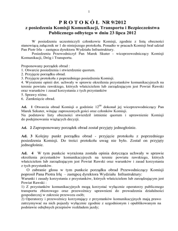 1 P R O T O K Ó Ł NR 9/2012 z posiedzenia Komisji Komunikacji, Transportu i Bezpieczeństwa Publicznego odbytego w dniu 23 lipca 2012 W posiedzeniu uczestniczyli członkowie Komisji, zgodnie z listą obecności stanowiącą załącznik nr 1 do niniejszego protokołu. Ponadto w pracach Komisji brał udział Pan Piotr Irla – zastępca dyrektora Wydziału Infrastruktury. Posiedzeniu Przewodniczył Pan Marek Skuter - wiceprzewodniczący Komisji Komunikacji, Dróg i Transportu. Proponowany porządek obrad : 1. Otwarcie posiedzenia i stwierdzenie quorum. 2. Przyjęcie porządku obrad. 3. Przyjęcie protokołu z poprzedniego posiedzenia Komisji. 4. Wyrażenie opinii dot. uchwały w sprawie określenia przystanków komunikacyjnych na terenie powiatu rawskiego, których właścicielem lub zarządzającym jest Powiat Rawski oraz warunków i zasad korzystania z tych przystanków 5. Sprawy różne. 6. Zamknięcie obrad. Ad. 1 Otwarcia obrad Komisji o godzinie 1200 dokonał jej wiceprzewodniczący Pan Marek Sekuter, witając zaproszonych gości oraz członków Komisji. Na podstawie listy obecności stwierdził istnienie quorum i uprawnienie Komisji do podejmowania wiążących decyzji. Ad. 2 Zaproponowany porządek obrad został przyjęty jednogłośnie. Ad. 3 Kolejny punkt porządku obrad - przyjęcie protokołu z poprzedniego posiedzenia Komisji. Do treści protokołu uwag nie było. Został on przyjęty jednogłośnie. Ad. 4 W tym punkcie wyrażona została opinia dotycząca uchwały w sprawie określenia przystanków komunikacyjnych na terenie powiatu rawskiego, których właścicielem lub zarządzającym jest Powiat Rawski oraz warunków i zasad korzystania z tych przystanków. O zabranie głosu w tym punkcie porządku obrad Przewodniczący Komisji poprosił Pana Piotra Irlę – zastępcę dyrektora Wydziału Infrastruktury: Warunki i zasady korzystania z przystanków, których właścicielem lub zarządzającym jest Powiat Rawski : 1) Z przystanków komunikacyjnych mogą korzystać wyłącznie operatorzy publicznego transportu zbiorowego oraz przewoźnicy uprawnieni do prowadzenia działalności gospodarczej w zakresie przewozu osób; 2) Operatorzy i przewoźnicy korzystający z przystanków komunikacyjnych mają prawo zatrzymywać na nich pojazdy wyłącznie zgodnie z uzgodnionym i opublikowanym na podstawie odrębnych przepisów rozkładem jazdy; 2 3) Zabrania się korzystania z przystanków komunikacyjnych w innych celach niż realizacja przewozów tj. wsiadanie i wysiadanie pasażerów; W szczególności zabrania się : a) korzystania z przystanków w celu wykonywania przerw technicznych lub wynikających z czasu pracy kierowców, b) umieszczania bez zgody właściciela lub zarządzającego przystankiem wszelkiego rodzaju plakatów i ogłoszeń niezwiązanych z wykonywaniem przewozów pasażerskich, c) prowadzenia w obrębie przystanków komunikacyjnych innej działalności gospodarczej: 4) Pojazdy, które mogą korzystać z przystanków powinny zatrzymywać się w odległości nie większej niż 15 m od słupka ze znakiem D15 lub tablicy oznaczającej przystanek, a w przypadku przystanku z zatoką - w tej zatoce, w taki sposób aby umożliwić pasażerom dogodne i bezpieczne wsiadanie oraz wysiadanie. Zatrzymywanie pojazdów powinno odbywać się tak aby zapewnić innym użytkownikom korzystanie z przystanków na równych prawach; 5) W przypadkach koniecznych, wynikających z czasowego zamknięcia drogi lub zmiany organizacji ruchu, korzystanie z przystanków komunikacyjnych może zostać ograniczone. Ograniczenie mogą polegać na wyłączeniu przystanku z użytkowania lub zmianie jego lokalizacji; 6) Zarząd Powiatu Rawskiego poinformuje w ciągu 5 dni roboczych operatora lub przewoźnika o ograniczeniach o których mowa w pkt 5; 7) Operator lub przewoźnik powinien uzgodnić z Zarządem Powiatu Rawskiego, sposób prezentacji i umieszczania na przystankach rozkładów jazdy oraz innych ogłoszeń związanych z prowadzeniem przewozów osób; 8) Udostępnianie i korzystanie z przystanków komunikacyjnych przez operatorów i przewoźników jest płatne i odbywa się na podstawie odrębnej umowy zawartej pomiędzy Zarządem Powiatu Rawskiego a właściwym operatorem lub przewoźnikiem. Przystanki mogą powstawać z zależności od potrzeb ludności. Jeżeli grupa mieszkańców zwróci się do Zarządy Powiatu z prośbą o wydzielenie miejsca na przystanek , wniosek zostanie rozpatrzony. Do przedstawionego projektu uchwały uwag nie było Komisja Komunikacji, Dróg i Transportu, jednogłośnie wyraziła pozytywną opinię w zakresie omawianego projektu uchwały. Ad. 5 W sprawach różnych głosów nie było. Ad. 6. Wobec wyczerpania przyjętego porządku obrad, Przewodniczący dokonał zamknięcia posiedzenie komisji. w załączeniu: - załączniki wymienione w treści protokołu Protokół sporządził: Tomasz Góraj Przewodniczący Komisji: