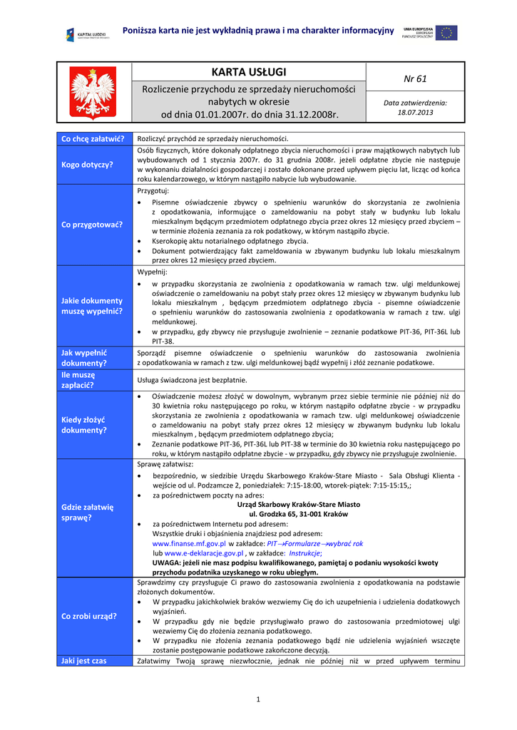 Poniższa karta nie jest wykładnią prawa i ma charakter informacyjny KARTA USŁUGI Rozliczenie przychodu ze sprzedaży nieruchomości nabytych w okresie od dnia 01.01.2007r. do dnia 31.12.2008r. Co chcę załatwić? Kogo dotyczy? Nr 61 Data zatwierdzenia: 18.07.2013 Rozliczyć przychód ze sprzedaży nieruchomości. Osób fizycznych, które dokonały odpłatnego zbycia nieruchomości i praw majątkowych nabytych lub wybudowanych od 1 stycznia 2007r. do 31 grudnia 2008r. jeżeli odpłatne zbycie nie następuje w wykonaniu działalności gospodarczej i zostało dokonane przed upływem pięciu lat, licząc od końca roku kalendarzowego, w którym nastąpiło nabycie lub wybudowanie. Przygotuj: Co przygotować? Pisemne oświadczenie zbywcy o spełnieniu warunków do skorzystania ze zwolnienia z opodatkowania, informujące o zameldowaniu na pobyt stały w budynku lub lokalu mieszkalnym będącym przedmiotem odpłatnego zbycia przez okres 12 miesięcy przed zbyciem – w terminie złożenia zeznania za rok podatkowy, w którym nastąpiło zbycie. Kserokopię aktu notarialnego odpłatnego zbycia. Dokument potwierdzający fakt zameldowania w zbywanym budynku lub lokalu mieszkalnym przez okres 12 miesięcy przed zbyciem. Wypełnij: Jakie dokumenty muszę wypełnić? Jak wypełnić dokumenty? Ile muszę zapłacić? w przypadku skorzystania ze zwolnienia z opodatkowania w ramach tzw. ulgi meldunkowej oświadczenie o zameldowaniu na pobyt stały przez okres 12 miesięcy w zbywanym budynku lub lokalu mieszkalnym , będącym przedmiotem odpłatnego zbycia - pisemne oświadczenie o spełnieniu warunków do zastosowania zwolnienia z opodatkowania w ramach z tzw. ulgi meldunkowej. w przypadku, gdy zbywcy nie przysługuje zwolnienie – zeznanie podatkowe PIT-36, PIT-36L lub PIT-38. Sporządź pisemne oświadczenie o spełnieniu warunków do zastosowania zwolnienia z opodatkowania w ramach z tzw. ulgi meldunkowej bądź wypełnij i złóż zeznanie podatkowe. Usługa świadczona jest bezpłatnie. Kiedy złożyć dokumenty? Oświadczenie możesz złożyć w dowolnym, wybranym przez siebie terminie nie później niż do 30 kwietnia roku następującego po roku, w którym nastąpiło odpłatne zbycie - w przypadku skorzystania ze zwolnienia z opodatkowania w ramach tzw. ulgi meldunkowej oświadczenie o zameldowaniu na pobyt stały przez okres 12 miesięcy w zbywanym budynku lub lokalu mieszkalnym , będącym przedmiotem odpłatnego zbycia; Zeznanie podatkowe PIT-36, PIT-36L lub PIT-38 w terminie do 30 kwietnia roku następującego po roku, w którym nastąpiło odpłatne zbycie - w przypadku, gdy zbywcy nie przysługuje zwolnienie. Sprawę załatwisz: Gdzie załatwię sprawę? Co zrobi urząd? Jaki jest czas bezpośrednio, w siedzibie Urzędu Skarbowego Kraków-Stare Miasto - Sala Obsługi Klienta wejście od ul. Podzamcze 2, poniedziałek: 7:15-18:00, wtorek-piątek: 7:15-15:15,; za pośrednictwem poczty na adres: Urząd Skarbowy Kraków-Stare Miasto ul. Grodzka 65, 31-001 Kraków za pośrednictwem Internetu pod adresem: Wszystkie druki i objaśnienia znajdziesz pod adresem: www.finanse.mf.gov.pl w zakładce: PITFormularzewybrać rok lub www.e-deklaracje.gov.pl , w zakładce: Instrukcje; UWAGA: jeżeli nie masz podpisu kwalifikowanego, pamiętaj o podaniu wysokości kwoty przychodu podatnika uzyskanego w roku ubiegłym. Sprawdzimy czy przysługuje Ci prawo do zastosowania zwolnienia z opodatkowania na podstawie złożonych dokumentów. W przypadku jakichkolwiek braków wezwiemy Cię do ich uzupełnienia i udzielenia dodatkowych wyjaśnień. W przypadku gdy nie będzie przysługiwało prawo do zastosowania przedmiotowej ulgi wezwiemy Cię do złożenia zeznania podatkowego. W przypadku nie złożenia zeznania podatkowego bądź nie udzielenia wyjaśnień wszczęte zostanie postępowanie podatkowe zakończone decyzją. Załatwimy Twoją sprawę niezwłocznie, jednak nie później niż w przed upływem terminu 1 Poniższa karta nie jest wykładnią prawa i ma charakter informacyjny realizacji? Jak się odwołać? Informacje dodatkowe Podstawa prawna przedawnienia. Od decyzji przysługuje odwołanie do Dyrektora Izby Skarbowej w Krakowie za pośrednictwem Naczelnika Urzędu Skarbowego Kraków-Stare Miasto w terminie 14 dni od dnia jej doręczenia. W przypadku, gdy zbywcy nie przysługuje zwolnienie z opodatkowania w ramach tzw. ulgi meldunkowej należy złożyć zeznanie podatkowe PIT-36, PIT-36L lub PIT-38 za rok podatkowy, w którym nastąpiło odpłatne zbycie nieruchomości lub praw majątkowych w terminie do 30 kwietnia roku następującego po roku, w którym nastąpiło przedmiotowe zbycie. W zeznaniu podatkowym należy określić należny podatek z tytułu zbycia nieruchomości. Podatek wynosi 19% podstawy opodatkowania (tj. przychód z odpłatnego zbycia pomniejszony o koszty nabycia lub wytworzenia ustalonymi zgodnie z art.22 ust.6c i 6d, powiększonymi o sumę odpisów amortyzacyjnych, o których mowa w art.22h ust.1 pkt 1, dokonanymi od zbywanych nieruchomości lub praw) i płatny jest w terminie do złożenia zeznania podatkowego za dany rok podatkowy. Zgodnie z art. 8 ust.1 ustawy z dnia 6 listopada 2008r. o zmianie ustawy o podatku dochodowym od osób fizycznych oraz o zmianie niektórych innych ustaw (Dz. U. Nr 209, poz. 1316) do przychodu (dochodu) z odpłatnego zbycia nieruchomości i praw określonych w art.10 ust.1 pkt 8 lit. a)-c) ustawy o podatku dochodowym od osób fizycznych, nabytych lub wybudowanych (oddanych do użytkowania) w okresie od 1 stycznia 2007r. do dnia 31 grudnia 2008r. stosuje się zasady określone w ustawie o podatku dochodowym od osób fizycznych w brzmieniu obowiązującym na dzień 31 grudnia 2008r. Ustawa z dnia 29 sierpnia 1997r. - Ordynacja Podatkowa (tekst jednolity (Dz. U. z 2012r., poz.749 ze zm.) Ustawa z dnia 26 lipca 1991r. o podatku dochodowym od osób fizycznych (t.j. Dz. U. z 2012r.,poz. 361 ze zm.) w związku z art.8 ust.1 ustawy z dnia 6 listopada 2008r