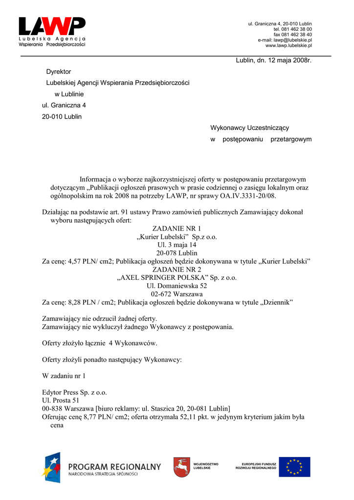 ul. Graniczna 4, 20-010 Lublin tel. 081 462 38 00 fax 081 462 38 40 e-mail: [email protected] www.lawp.lubelskie.pl Lublin, dn. 12 maja 2008r. Dyrektor Lubelskiej Agencji Wspierania Przedsiębiorczości w Lublinie ul. Graniczna 4 20-010 Lublin Wykonawcy Uczestniczący w postępowaniu przetargowym Informacja o wyborze najkorzystniejszej oferty w postępowaniu przetargowym dotyczącym „Publikacji ogłoszeń prasowych w prasie codziennej o zasięgu lokalnym oraz ogólnopolskim na rok 2008 na potrzeby LAWP, nr sprawy OA.IV.3331-20/08. Działając na podstawie art. 91 ustawy Prawo zamówień publicznych Zamawiający dokonał wyboru następujących ofert: ZADANIE NR 1 „Kurier Lubelski” Sp.z o.o. Ul. 3 maja 14 20-078 Lublin Za cenę: 4,57 PLN/ cm2; Publikacja ogłoszeń będzie dokonywana w tytule „Kurier Lubelski” ZADANIE NR 2 „AXEL SPRINGER POLSKA” Sp. z o.o. Ul. Domaniewska 52 02-672 Warszawa Za cenę: 8,28 PLN / cm2; Publikacja ogłoszeń będzie dokonywana w tytule „Dziennik” Zamawiający nie odrzucił Ŝadnej oferty. Zamawiający nie wykluczył Ŝadnego Wykonawcy z postępowania. Oferty złoŜyło łącznie 4 Wykonawców. Oferty złoŜyli ponadto następujący Wykonawcy: W zadaniu nr 1 Edytor Press Sp. z o.o. Ul. Prosta 51 00-838 Warszawa [biuro reklamy: ul. Staszica 20, 20-081 Lublin] Oferując cenę 8,77 PLN/ cm2; oferta otrzymała 52,11 pkt. w jedynym kryterium jakim była cena WOJEWÓDZTWO LUBELSKIE EUROPEJSKI FUNDUSZ ROZWOJU REGIONALNEGO ul. Graniczna 4, 20-010 Lublin tel. 081 462 38 00 fax 081 462 38 40 e-mail: [email protected] www.lawp.lubelskie.pl W zadaniu nr 2 AGORA S.A. z siedzibą w Warszawie Oddział w Lublinie Ul. Krakowskie Przedmieście 21 20-002 Lublin Oferując cenę 15,15 PLN/ cm2; oferta otrzymała 54,65 pkt. w jedynym kryterium jakim była cena. UZASADNIENIE: Wybrane oferty nie podlegały odrzuceniu, wybrani Wykonawcy nie podlegali wykluczeniu. Oferty wybrano na podstawie jedynego kryterium, jakie ustalił Zamawiający- 100% cena. Ponadto Zamawiający informuje, iŜ dokonał badania ofert zachowując przesłanki wynikające z art. 90 ustawy. Jednocześnie ustalono, iŜ Ŝaden z Wykonawców nie zastosował raŜąco niskiej ceny. Dyrektor Lubelskiej Agencji Wspierania Przedsiębiorczości w Lublinie /-/ Renata Siwiec WOJEWÓDZTWO LUBELSKIE EUROPEJSKI FUNDUSZ ROZWOJU REGIONALNEGO