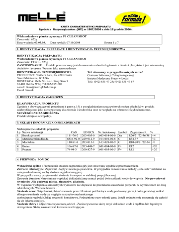 Wielozadaniowa pianka czyszcząca F1 CLEAN SHOT Zawartość: 623g Data wydania:03.03.03. Data rewizji: 07.10.2008 Strona 1 z 7 1. IDENTYFIKACJA PREPARATU I IDENTYFIKACJA PRZEDSIĘBIORSTWA IDENTYFIKACJA PREPARATU: Wielozadaniowa pianka czyszcząca F1 CLEAN SHOT Zawartość: F1391 – 623g ZASTOSOWANIE : : Produkt przeznaczony jest do usuwania zabrudzeń głownie z tkanin i plastyków i jest mieszaniną dodatków i propanu / butanu jako gazu pędnego. IDENTYFIKACJA PRZEDSIĘBIORSTWA Tel. alarmowy w przypadku ostrych zatruć PRODUCENT: Northern Labs, Inc 4701 Custer Centrum Informacji Toksykologicznej Street Maintowoc, WI USA Instytut Medycyny Pracy w Łodzi DOSTAWCA: Melle Sp. z.o.o. Stary Staw 9 Tel.: (042) 631 47 25; (042) 631 47 67 63-400 Ostrów Wlkp Tel:062-7351600 e-mail: [email protected] Paweł Nowak 2. IDENTYFIKACJA ZAGROśEŃ KLASYFIKACJA PRODUKTU Zgodnie z obowiązującymi przepisami ( patrz p.15) z uwzględnieniem rzeczywistych stęŜeń składników, produkt zaklasyfikowano jako niebezpieczny dla zdrowia i środowiska oraz ze względu na własności fizykochemiczne. SZCZEGÓLNE ZAGROśENIA Produkt skrajnie łatwopalny. 3. SKŁAD I INFORMACJA O SKŁADNIKACH Niebezpieczne składniki preparatu: Lp Nazwa substancji 1. Butoksyetanol 2. Metakrzemian disodu 3. Morfolina CAS EINECS 111-76-2 203-905-0 6834-92-0 229-912-9 110-91-8 203-815-1 4. 5. 106-97-8 74-98-3 Butan Propan 203-448-7 200-827-9 Nr. Indeksowy 603-014-00-0 014-010-00-8 613-028-00-9 Symbol ZagroŜenie R % Xn R20/21/22-36/38 <4 C R34-37 <3 C R10-20/21/22-34 <1 601-004-00-0 F+ 601-003-00-5 F+ R12 R12 <20 <20 4. PIERWSZA POMOC Wskazówki ogólne : Preparat nie stwarza zagroŜenia gdy jest stosowany zgodnie z przeznaczeniem. Zatrucie inhalacyjne: Zapewnić dopływ świeŜego powietrza. W przypadku zastosowania metody „usta-usta” nakładać na usta poszkodowanej osoby złoŜona wyjałowioną gazę. W przypadku utraty przytomności ułoŜenie i transport w stabilnej pozycji bocznej. Zatrucie doustne: Natychmiast wypłukać dokładnie jamę ustną i podać dwie szklanki wody do wypicia . Nie powodować wymiotów .Nie podawać mleka , tłuszczów, alkoholu. W wypadku wystąpienia samoistnych wymiotów nie dopuścić do przenikania zawartości preparatu w wymiocinach do dróg oddechowych .Wezwać lekarza . SkaŜenie oczu: Natychmiast płukać starannie przez 10 minut pod bieŜąca wodą podnosząc górną i dolną powiekę( unikać silnego strumienia wody ze względu na ryzyko mechanicznego uszkodzenia rogówki).Zdjąć soczewki kontaktowe. PodraŜnione oczy osłonić gazą. JeŜeli podraŜnienie utrzymuje się zgłosić się do lekarza okulisty. SkaŜenie skóry : Zdjąć zanieczyszczoną odzieŜ . Zanieczyszczona skórę zmyć dokładnie woda i mydłem lub łagodnym detergentem. Skórę nasmarować kremem nawilŜającym. Wielozadaniowa pianka czyszcząca F1 CLEAN SHOT Zawartość: 623g strona 2 z 7 5. POSTĘPOWANIE W PRZYPADKU POśARU ZagroŜenia specjalne: Produkt rozpuszcza się w wodzie. Pary są cięŜsze od powietrza , tworzą z nim mieszaniny wybuchowe. Zalecenia ogólne: Usunąć niepowołane osoby z miejsca poŜaru. Odpowiednie środki gaśnicze: Woda – prądy rozproszone .Suche środki gaśnicze, piana odporna na działanie alkoholu, dwutlenek węgla . Środki których nie wolno uŜywać ze względów bezpieczeństwa: Gaszenie pełnym strumieniem wody. Środki ochrony indywidualnej dla straŜaków: UŜywać zabezpieczeń dla górnych dróg oddechowych , sprzęt ochronny dróg oddechowych –taki jak na wyposaŜeniu straŜaków oraz ubranie ochronne. Gaszenie poŜaru: Małe poŜary gasić gaśnica proszkową lub śniegową: DuŜe poŜary Gasić pianą. Preparaty naraŜone na działanie ognia lub wysokiej temperatury chłodzić wodą z bezpiecznej odległości poŜaru prysznicem wodnym , o ile to moŜliwe usunąć je z obszaru zagroŜenia. W przypadku poŜaru nie przebywać w strefie zagroŜenia bez ubrania ognioodpornego i aparatu tlenowego. ZagroŜenia związane ze spalaniem: Tlenek węgla oraz moŜliwe powstawanie niebezpiecznych palnych gazów lub par. MoŜliwe tworzenie wybuchowych mieszanin z powietrzem. Przegrzane pojemniki ( powyŜej 50 stop C) mogą eksplodować. Inne wskazówki: W przypadku poŜaru nie przebywać w strefie zagroŜenia bez ubrania ognioodpornego i aparatu tlenowego. Zanieczyszczoną wodę zebrać do zbiorników. Nie moŜna jej usuwać do kanalizacji. 6. POSTĘPOWANIE W PRZYPADKU NIEZAMIERZONEGO UWOLNIENIA DO ŚRODOWISKA Środki ochrony indywidualnej: Przy duŜych uwolnieniach wentylować przestrzeń. Izolować od źródeł ognia. Nie palić tytoniu. Ewakuować osoby niezwiązane z usuwaniem awarii. Nie wdychać par. Stosować ubranie ochronne i zabezpieczenia oczu i dróg oddechowych. Unikać zanieczyszczenia substancją. Rozpuszczalniki i gazy mogą tworzyć mieszaninę wybuchową przy kontakcie z powietrzem. Gazy są cięŜsze od powietrza i mogą poruszać się przy powierzchni posadzki. Uszkodzone opakowania usunąć z miejsca awarii na dwór jeŜeli nie stanowi to ryzyka. Przestrzegać przepisów bezpieczeństwa pkt 7 i8. Środki ostroŜności w zakresie ochrony środowiska: Zapobiec przedostaniu się do wód bez uprzedniej neutralizacji w oczyszczalni ścieków. Metody oczyszczania: Ciecz pozostałą po opróŜnieniu pojemnika aerozolowego zebrać przy pomocy materiałów absorbujących do szczelnych opakowań metalowych i przekazać do zlikwidowania wg pkt 13 7. POSTĘPOWANIE Z PREPARATEM I JEGO MAGAZYNOWANIE Posługiwanie się: Zapobieganie zatruciom: podczas stosowania nie jeść , nie pić , unikać kontaktu z cieczą. przestrzegać zasad higieny osobistej , stosować odzieŜ i sprzęt ochronny , unikać wdychania Zapobieganie poŜarom i wybuchom: wyeliminować źródła zapłonu – nie uŜywać otwartego ognia ,nie uŜywać narzędzi iskrzących i odzieŜy z tkanin podatnych na elektryzację zachować środki ostroŜności dla uniknięcia wyładowań elektrostatycznych. Chronić