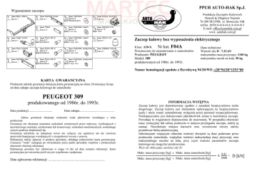 PPUH AUTO-HAK Sp.J. WyposaŜenie zaczepu: Produkcja Zaczepów Kulowych Henryk & Zbigniew Nejman 76-200 SŁUPSK ul. Słoneczna 16K tel/fax (059) 8-414-414; 8-414-413 E-mail: [email protected] www. autohak.com.pl Zaczep kulowy bez wyposaŜenia elektrycznego F04A Klasa: A50-X Nr kat. Przeznaczony do zamontowania w samochodzie: Producent: PEUGEOT Model: 309 produkowanym od 1986r. do 1993r. Dane techniczne: Wartość siły D : 7,22 kN maksymalna masa przyczepy: 1100 kg maksymalny nacisk na kulę: 50 kg Numer homologacji zgodnie z Dyrektywą 94/20/WE: e20*94/20*1351*00 KARTA GWARANCYJNA Producent udziela gwarancji niniejszą kartą gwarancyjną na okres 24 miesięcy licząc od dnia zakupu zaczepu kulowego do samochodu: PEUGEOT 309 produkowanego od 1986r. do 1993r. Data produkcji .............................. Data zakupu............................................. INFORMACJA WSTĘPNA Zaczep kulowy jest skonstruowany zgodnie z zasadami bezpieczeństwa ruchu drogowego. Zaczep kulowy jest elementem wpływającym na bezpieczeństwo jazdy i moŜe zostać zainstalowany wyłącznie przez personel wyspecjalizowany. Niedopuszczalne jest dokonywanie jakichkolwiek zmian w konstrukcji zaczepu. Powoduje to wygaśniecie dopuszczenia do stosowania. W przypadku obecności masy izolacyjnej lub osłony podwozia w miejscu przylegania zaczepu, naleŜy ją usunąć. Nieosłonięte miejsca karoserii oraz wywiercone otwory naleŜy pomalować farbą antykorozyjną. Informacjami wiąŜącymi odnośnie wartości obciąŜeń są dane podawane przez producenta samochodu, względnie wartości maksymalnej masy przyczepy oraz maksymalnego nacisku na kulę, przy czym wartości parametrów zaczepu kulowego nie mogą być przekroczone. Wzór do obliczania wartości siły D: Zakres gwarancji obejmuje wyłącznie wady jakościowe wynikające z winy producenta. Gwarancja nie obejmuje natomiast uszkodzeń zawinionych przez nabywcę, wynikających z niewłaściwego montaŜu, uŜytkowania lub konserwacji, uszkodzeń mechanicznych, normalnego zuŜycia podczas eksploatacji itp. Gwarancja udzielona na zakupiony towar nie wyłącza, nie ogranicza ani nie zawiesza uprawnień kupującego wynikających z niezgodności towaru z umową. Reklamacje naleŜy zgłaszać w punkcie sprzedaŜy, składając jednocześnie kartę gwarancyjną. Usunięcie "wady" następuje po stwierdzeniu przez punkt sprzedaŜy wspólnie z producentem słuszności złoŜonej reklamacji. Reklamacja powinna być załatwiona w ciągu 14 dni od dnia uznania reklamacji. Karta gwarancyjna jest niewaŜna jeŜeli nie jest wypełniona i podpisana. Maks. masa przyczepy [kg] x Maks. masa samochodu [kg] Data zgłoszenia reklamacji: ................................................................... Maks. masa przyczepy [kg] + Maks. masa samochodu [kg] X 9,81 = 1000 D [kN] Kolejność czynności przy montaŜu INSTRUKCJA montaŜu i eksploatacji zaczepu kulowego Oznaczenie zacisku wg ISO PN 1 L 2 + 3 31 4 R 5 58R 6 54 7 58L 1. 2. B Łączenie przewodów 3. C Kierunkowskazy lewe Tylne światła przeciwmgłowe Masa Kierunkowskazy prawe Światła pozycyjne prawe Światła hamowania Światła pozycyjne lewe 8 5 10 4. 9 5. 6. A 7. D 9 9 8. 9. 7 4 W celu zamontowania zaczepu naleŜy zdemontować zderzak. Roznitować od karoserii uchwyty podtrzymujące zderzak (3 szt.) oraz odkręcić odsłonę Ŝaroodporną tylnego tłumika. Z lewej i prawej strony przyłoŜyć do podłuŜnicy samochodu wsporniki (poz. 4 i 5), tak aby podłuŜny otwór wspornika nałoŜył się na wystający z podłogi plastikowy kołek, a następnie poprzez otwory (poz. A, B, C) wywiercić otwory wiertłem ø11mm. Poprzez otwór (poz. C) wspornika (poz. 5) oraz odpowiedni otwór i poprzez podkładkę okrągłą (poz. 10) skręcić śrubą M10x30mm (poz.9). PrzyłoŜyć belkę główną zaczepu (poz. 1) do umocowanych juŜ wsporników (poz. 4 i 5) i poprzez otwory (poz. A i B) oraz płytki (poz. 6) skręcić z podłuŜnicą śrubami M10x50mm (poz. 8) z wyposaŜenia zaczepu. Poprzez otwory zaczepu (poz. D) przewiercić otwory wiertłem ø11mm, a następnie skręcić śrubami M10x30mm – poz. 9 (wykorzystać podkładki ø35xø12x3mm – poz. 10). Przykręcić korpus automatu (poz. 15) śrubami M12x25mm (poz. 7) wraz z blachą pod gniazdo (poz. 3). Zamocować kulę zgodnie z instrukcją dołączaną do zaczepu z końcówką szybkodemontowalną. Dokręcić wszystkie śruby z momentem, jak pokazano w tabeli. W centralnym punkcie zderzaka wyciąć od spodu fragment o wymiarach 50x70 jak pokazano na rysunku. 80 Wyciąć 1 6 8 3 Rys. 1 15 2 Zaczep kulowy przeznaczony jest do zamontowania w samochodzie: PEUGEOT 309, produkowanym od 1986r. do 1993r., numer katalogowy F04A i słuŜy do ciągnięcia przyczep o masie całkowitej do 1100 kg i nacisku na kulę max 50 kg. OD PRODUCENTA Dziękujemy za wybór produkowanego przez naszą firmę zaczepu kulowego. Jego niezawodność została potwierdzona licznymi testami oraz opiniami zadowolonych klientów. JednakŜe niezawodność zaczepów kulowych jest zaleŜna równieŜ od prawidłowego montaŜu oraz prawidłowej eksploatacji. Z tego powodu prosimy Państwa o staranne przeczytanie niniejszej instrukcji montaŜu oraz przestrzeganie zawartych wskazówek. Zaczep naleŜy zamontować w miejscach do tego celu przeznaczonych przez producenta samochodu. Rys. 2 10. Zamontować osłonę Ŝaroodporną tłumika oraz zderzak. 11. W roznitowanych uprzednio od karoserii uchwytach naleŜy rozwiercić górny otwór wiertłem ø11mm i tak przygotowany przykręcić do zaczepu poprzez otwory zaczepu (poz. A), a następnie skręcić ze zderzakiem jak było pierwotnie. 12. Podłączyć przewody z gniazdka 7- bieg. do instalacji elektrycznej zgodnie z instrukcją fabryczną samochodu (zaleca się wykonanie w ASO). 13. Uzupełnić ewentualne ubytki powłoki malarskiej zaczepu powstałe w trakcie montaŜu. Zalecany moment skręcający dla śrub i nakrętek 8,8: M6 - 11 Nm M8 - 25 Nm M10 - 50 Nm M12 - 87 Nm M14 