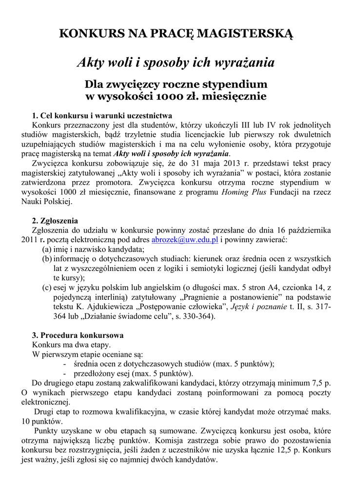 KONKURS NA PRACĘ MAGISTERSKĄ Akty woli i sposoby ich wyrażania Dla zwycięzcy roczne stypendium w wysokości 1000 zł. miesięcznie 1. Cel konkursu i warunki uczestnictwa Konkurs przeznaczony jest dla studentów, którzy ukończyli III lub IV rok jednolitych studiów magisterskich, bądź trzyletnie studia licencjackie lub pierwszy rok dwuletnich uzupełniających studiów magisterskich i ma na celu wyłonienie osoby, która przygotuje pracę magisterską na temat Akty woli i sposoby ich wyrażania. Zwycięzca konkursu zobowiązuje się, że do 31 maja 2013 r. przedstawi tekst pracy magisterskiej zatytułowanej „Akty woli i sposoby ich wyrażania” w postaci, która zostanie zatwierdzona przez promotora. Zwycięzca konkursu otrzyma roczne stypendium w wysokości 1000 zł miesięcznie, finansowane z programu Homing Plus Fundacji na rzecz Nauki Polskiej. 2. Zgłoszenia Zgłoszenia do udziału w konkursie powinny zostać przesłane do dnia 16 października 2011 r. pocztą elektroniczną pod adres [email protected] i powinny zawierać: (a) imię i nazwisko kandydata; (b) informację o dotychczasowych studiach: kierunek oraz średnia ocen z wszystkich lat z wyszczególnieniem ocen z logiki i semiotyki logicznej (jeśli kandydat odbył te kursy); (c) esej w języku polskim lub angielskim (o długości max. 5 stron A4, czcionka 14, z pojedynczą interlinią) zatytułowany „Pragnienie a postanowienie” na podstawie tekstu K. Ajdukiewicza „Postępowanie człowieka”, Język i poznanie t. II, s. 317364 lub „Działanie świadome celu”, s. 330-364). 3. Procedura konkursowa Konkurs ma dwa etapy. W pierwszym etapie oceniane są: - średnia ocen z dotychczasowych studiów (max. 5 punktów); - przedłożony esej (max. 5 punktów). Do drugiego etapu zostaną zakwalifikowani kandydaci, którzy otrzymają minimum 7,5 p. O wynikach pierwszego etapu kandydaci zostaną poinformowani za pomocą poczty elektronicznej. Drugi etap to rozmowa kwalifikacyjna, w czasie której kandydat może otrzymać maks. 10 punktów. Punkty uzyskane w obu etapach są sumowane. Zwycięzcą konkursu jest osoba, które otrzyma największą liczbę punktów. Komisja zastrzega sobie prawo do pozostawienia konkursu bez rozstrzygnięcia, jeśli żaden z uczestników nie uzyska łącznie 12,5 p. Konkurs jest ważny, jeśli zgłosi się co najmniej dwóch kandydatów.