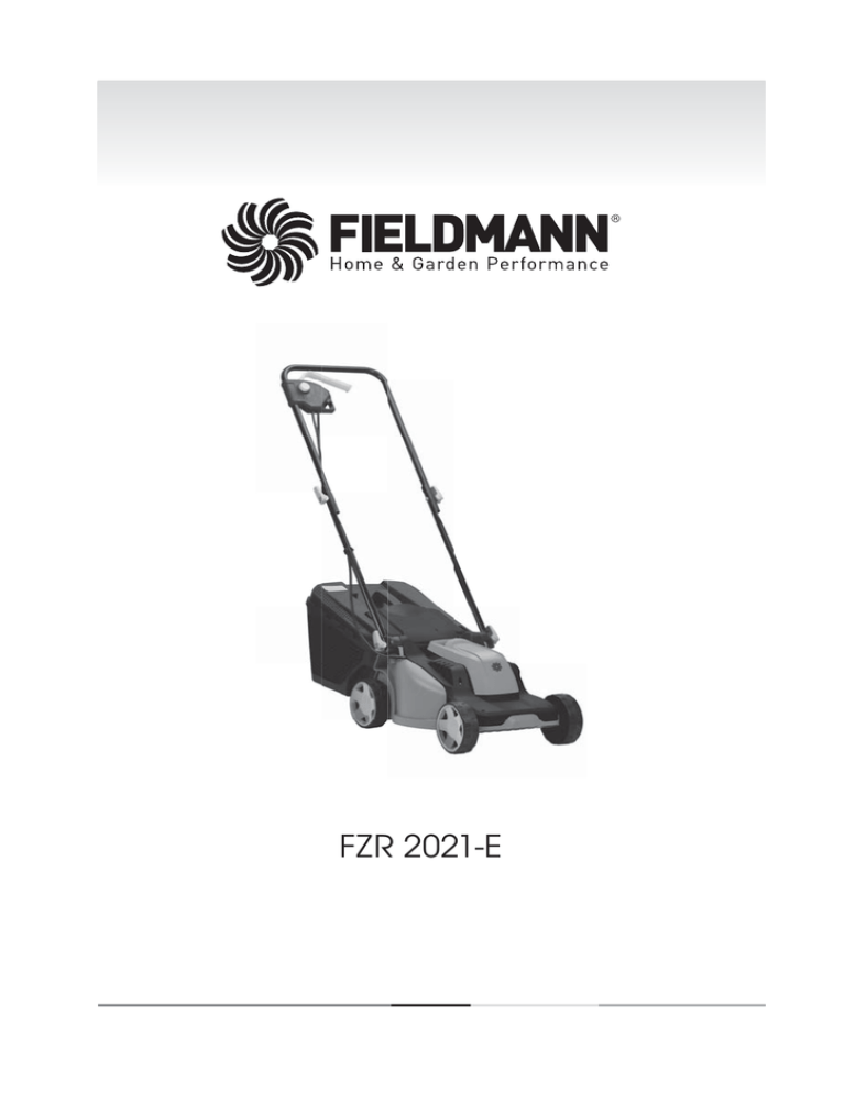 FZR 2021-E Spis treści 67 PL Elektryczna kosiarka ogrodowa INSTRUKCJA OBSŁUGI Dziękujemy za zakupienie tej ogrodowej elektrycznej kosiarki rotacyjnej. Zanim zaczniesz z niej korzystać, przeczytaj uważnie niniejszą instrukcję obsługi i zachowaj ją do wglądu. SPIS TREŚCI 1. OGÓLNE ZASADY BEZPIECZEŃSTWA .............................................................................................................. 68 Ważne ostrzeżenia dotyczące bezpieczeństwa .................................................................................... 68 Opakowanie............................................................................................................................................................... 68 Instrukcja obsługi...................................................................................................................................................... 68 2. SYMBOLE ....................................................................................................................................................................... 69 3. OPIS (OBR 1) ............................................................................................................................................................... 70 4. ZASADY BEZPIECZNEJ PRACY ..............................................................................................................................71 Pozostałe ryzyka .........................................................................................................................................................71 Zanim zaczniesz korzystać z kosiarki.............................................................................................................. 72 Przygotowanie do eksploatacji ........................................................................................................................ 72 Obsługa ........................................................................................................................................................................ 73 Konserwacja i przechowywanie ..................................................................................................................... 73 5. MONTAŻ..........................................................................................................................................................................74 5.1 Montaż mechanizmu uruchamiającego do górnej części uchwytu ...................................74 5.2 Instalacja uchwytu............................................................................................................................................74 5.3 Instalacja kosza, założenie pokrywy kół ............................................................................................... 75 6. EKSPLOATACJA............................................................................................................................................................76 6.1 Ustawienia wysokości koszenia ..................................................................................................................76 6.2 Podłączanie do sieci elektrycznej............................................................................................................76 6.3 Włączanie / wyłączanie kosiarki ...............................................................................................................76 6.4 Koszenie ..................................................................................................................................................................77 7. DANE TECHNICZNE .................................................................................................................................................. 78 8. KONSERWACJA.......................................................................................................................................................... 79 8.1 Wymiana noża ................................................................................................................................................... 79 9. DEKLARACJA ZGODNOŚCI CE...........................................................................................................................81 10. LIKWIDACJA................................................................................................................................................................. 82 ELEKTRYCZNA KOSIARKA OGRODOWA INSTRUKCJA OBSŁUGI PL 68 Ogólne zasady bezpieczeństwa 1. OGÓLNE ZASADY BEZPIECZEŃSTWA WAŻNE OSTRZEŻENIA DOTYCZĄCE BEZPIECZEŃSTWA Starannie rozpakuj wyrób, zwracając uwagę, by nie wyrzucić żadnej części materiału opakowaniowego, zanim nie znajdziesz wszystkich elementów produktu. Przechowuj wyrób w suchym miejscu z dala od dzieci. Przeczytaj wszystkie uwagi i wskazówki. Nieprzestrzeganie ostrzeżeń i wskazówek może spowodować porażenie prądem elektrycznym, pożar lub ciężkie obrażenia. OPAKOWANIE Wyrób został umieszczony w opakowaniu chroniącym je przed uszkodzeniem podczas transportu. Opakowanie to jest surowcem i dlatego podlega recyklingowi. INSTRUKCJA OBSŁUGI Przed rozpoczęciem pracy z urządzeniem przeczytaj następujące zasady bezpieczeństwa i wskazówki dotyczące użytkowania. Zapoznaj się z elementami sterowania i prawidłowym użyciem urządzenia. Instrukcję należy ze starannością zachować do wglądu. Przynajmniej w czasie okresu gwarancyjnego zaleca się zachować oryginalne opakowanie włącznie z wewnętrznym materiałem pakowym, paragon i kartę gwarancyjną. W razie transportu zapakuj maszynę z powrotem do oryginalnego pudełka dostarczonego przez producenta, zapewniając w ten sposób maksymalną ochronę produktu podczas ewentualnego transportu (np. przeprowadzki lub wysyłki do serwisu). Uwaga: Jeśli przekazujesz maszynę innym osobom, przekaż ją wraz z instrukcją. Przestrzeganie załączonej i
