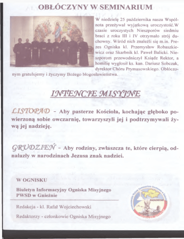 OBŁÓCZYNY W SEMINARIUM W niedzielę 25 października nasza Wspól nota przeżywał wyjątkową uroczystość.W czasie uroczystych Nieszporów siedmiu braci z roku III i IV otrzymało strój du chowny. Wśród nich znaleźli się m.in. Pre zes Ogniska kl. Przemysław Robaszkiewicz oraz Skarbnik kl. Paweł Balicki. Nie szporom przewodniczył Ksiądz Rektor, a homilię wygłosił ks. kan. Dariusz Sobczak, dyrektor Chóru Prymasowskiego. Obłóczonym gratulujemy i życzymy Bożego błogosławieństwa. um kN cm w so b n e - Aby pasterze Kościoła, kochając głęboko po wierzoną sobie owczarnię, towarzyszyli jej i podtrzymywali ży wą jej nadzieję. - Aby rodziny, zwłaszcza te, które cierpią, od nalazły w narodzinach Jezusa znak nadziei. W OGNISKU Biuletyn Informacyjny Ogniska Misyjnego PWSD w Gnieźnie R edakcja - kl. R afał W ojciechow ski R edaktorzy - członkow ie O gniska M isyjnego % 23 listopada 2015 r OGNlWlI wuuTrNiMOBM»crji<roei<ifi«iMfVjMe(>PwtDWGNic*Nis 2015/04(06) TYDZIEŃ MISYJNY W NASZYM SEMINARIUM W dniach 18-24 października przeżywaliśmy w Kościele kolejny już Tydzień Misyjny. Jak co roku, również nasze seminarium włączyło się ak tywnie w jego przeżywanie. We wtorek 20 października przeżywaliśmy Eucharystię, której przewodniczył ks. kan. Franciszek Jabłoński, opiekun Ogniska Misyjnego. Koncele browali ją nasi Moderatorzy oraz o. Kazimierz Szymczych SVD, sekretarz Komisji Episkopatu Polski ds. Misji, który wygłosił także homilię. Zaznaczył, że każdy kleryk, a później ksiądz, bez względu na to, czy pragnie wyjechać na misje czy nie, musi w sobie troskę o te misje wykształcić i pielęgnować. Ważne jest, aby przy wielu formach wsparcia, wspierać je przede wszystkim duchowo. Zauważył także, że każdy z nas w swoim przyszłym kapłaństwie, może zaangażować się w animację misyjną, aby jak największą liczbę ludzi zainteresować misjami. W czasie Mszy świętej zebrane zostały ofiary na rzecz misji, które wynio sły 250 zł. Tego samego dnia członkowie Ogniska poprowadzili różaniec w różnych językach. Po rozważa niach, przygotowanych przez Pre zesa Ogniska kl. Przemysława Robaszkiewicza, następowały dziesiątki w językach: angielskim (kl. Tomasz Subocz), hiszpańskim (kl. Paweł Balicki), swahili (kl. Rafał Wojciechow ski), włoskim (kl. Adam Piechowiak) i rosyjskim (kl. Radosław Czerwonka). Śpiew w czasie wystawienia Najświętszego Sakramentu i Adoracji poprowadził nowopowstający zespół muzyczny kleryków naszego seminarium. PIERWSZE SPOTKANIE W NOWYM ROKU W poniedziałek 12 października odbyło się pierwsze w nowym roku akademickim spotkanie naszego Ogniska Misyjnego. Gościliśmy na nim ks. kan. Franciszka Jabłońskie go oraz Wicerektora Seminarium ks. kan. Macieja Olczyka. W czasie spotkania poruszone zostały kwe stie organizacyjne, m.in. przygoto wania Tygodnia Misyjnego w Se minarium. Prezes Ogniska kl. Prze mysław Robaszkiewicz podsumował także miniony rok akademicki, Skarbnik kl. Paweł Balicki przedstawił stan finansów, a Kronikarz kl. Michał Owczarczak zaprezentował kronikę Ogniska. Przedstawiona została także papieska intencja misyjna na październik (kl. Rafał Wojciechowski) oraz relacja ze Szkoły Animatora Misyjnego w Warszawie (kl. Hubert Staszak), która odby wała się w Iipcu. W spotkaniu Ogniska po raz pierwszy uczest niczyli także bracia z roku I, któ rzy zostali szczególnie powitani i zachęceni, aby aktywnie włączyć się w jego działalność. Na koniec jednogłośnie podjęto decyzję o podtrzymaniu dotychczasowego składu Zarządu Ogniska. STR. 2 W OGNISKU 23 listopada 2015 roku MISYJNE SPOTKANIE RADIA MARYJA W GNIEŹNIE Modlitwa w intencji misji zgromadziła 19 października w parafii pw. bł. Jolenty w Gnieźnie licznych parafian i Ro dzinę Radia Maryja z archidiecezji gnieźnieńskiej. Eucharystii transmito wanej przez TV Trwam przewodniczył ks. kan. Franciszek Jabłoński. Mszę poprzedziły świadectwa misyjne m.in. proboszcza wspólnoty ks. kan. Ryszar da Balika oraz byłego Prezesa naszego Ogniska ks. Juliana Wawrzyniaka. Zgromadzeni obejrzeli również krótki spektakl misyjny pt. „List”, przygoto wany przez dzieci ze Szkolnego Ogni ska Misyjnego z SP nr 9. Kilka słów do wiernych skierował także o. Marcin Krupa CSsR oraz telefonicznie o. Tadeusz Rydzyk CSsR, który przypomniał, że Gnie zno to gniazdo, z którego wywodzi się Kościół w Polsce i nasza Ojczyzna. Przed Mszą świętą wierni prowadzeni przez dzieci z Ogniska Misyjnego działającego w SP nr 8 odmówili dziesiątkę Różańca w intencji misjonarzy z archidiecezji gnieźnieńskiej i z całej Polski. Wysłuchali również świadectwa misjonarzy świeckich - państwa Grzechowiaków, dziś rodziców piątki adoptowanych dzieci oraz katechetki czynnie zaanga żowanej w dzieło misyjne Kościoła. Swoim świadectwem podzieliły się również dzieci z Ogniska Misyjnego, kleryk z seminarium Misjonarzy Świętej Rodziny w Kazimierzu Biskupim oraz pochodzący ze Strzyżewa Kościelnego brat Tomasz ze zgromadzenia misyjnego kombonianów. Mszy świętej, która stanowiła centralny punkt spotkania, przewodniczył i homilię wygłosił ks. kan. Franciszek Jabłoński - dyrektor diecezjalny ds. misji i konsultor Komisji Episkopatu Polski ds. Misji. Asystę Liturgii zapewnili klerycy z Wyższego Seminarium Misjonarzy Świętej Rodziny z Kazimierza Biskupie go. Niestety, z przyczyn niezależnych od nas nie mogliśmy uczestniczyć w tej uroczy stości. Na podstawie www.archidiecezja.pl 2015/04(06) W OGNISKU STR. 3
