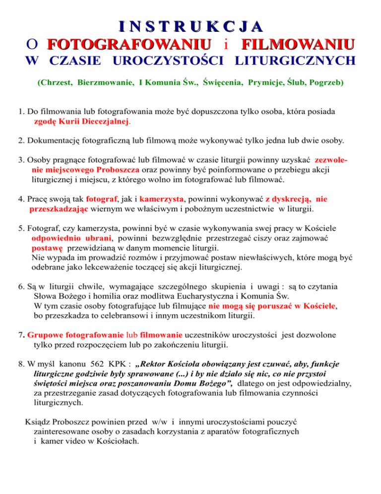 INSTRUKCJA O FOTOGRAFOWANIU i FILMOWANIU W CZASIE UROCZYSTOŚCI LITURGICZNYCH (Chrzest, Bierzmowanie, I Komunia Św., Święcenia, Prymicje, Ślub, Pogrzeb) 1. Do filmowania lub fotografowania może być dopuszczona tylko osoba, która posiada zgodę Kurii Diecezjalnej. 2. Dokumentację fotograficzną lub filmową może wykonywać tylko jedna lub dwie osoby. 3. Osoby pragnące fotografować lub filmować w czasie liturgii powinny uzyskać zezwolenie miejscowego Proboszcza oraz powinny być poinformowane o przebiegu akcji liturgicznej i miejscu, z którego wolno im fotografować lub filmować. 4. Pracę swoją tak fotograf, jak i kamerzysta, powinni wykonywać z dyskrecją, nie przeszkadzając wiernym we właściwym i pobożnym uczestnictwie w liturgii. 5. Fotograf, czy kamerzysta, powinni być w czasie wykonywania swej pracy w Kościele odpowiednio ubrani, powinni bezwzględnie przestrzegać ciszy oraz zajmować postawę przewidzianą w danym momencie liturgii. Nie wypada im prowadzić rozmów i przyjmować postaw niewłaściwych, które mogą być odebrane jako lekceważenie toczącej się akcji liturgicznej. 6. Są w liturgii chwile, wymagające szczególnego skupienia i uwagi : są to czytania Słowa Bożego i homilia oraz modlitwa Eucharystyczna i Komunia Św. W tym czasie osoby fotografujące lub filmujące nie mogą się poruszać w Kościele, bo przeszkadza to celebransowi i innym uczestnikom liturgii. 7. Grupowe fotografowanie lub filmowanie uczestników uroczystości jest dozwolone tylko przed rozpoczęciem lub po zakończeniu liturgii. 8. W myśl kanonu 562 KPK : „Rektor Kościoła obowiązany jest czuwać, aby, funkcje liturgiczne godziwie były sprawowane (...) i by nie działo się nic, co nie przystoi świętości miejsca oraz poszanowaniu Domu Bożego”, dlatego on jest odpowiedzialny, za przestrzeganie zasad dotyczących fotografowania lub filmowania czynności liturgicznych. Ksiądz Proboszcz powinien przed w/w i innymi uroczystościami pouczyć zainteresowane osoby o zasadach korzystania z aparatów fotograficznych i kamer video w Kościołach.