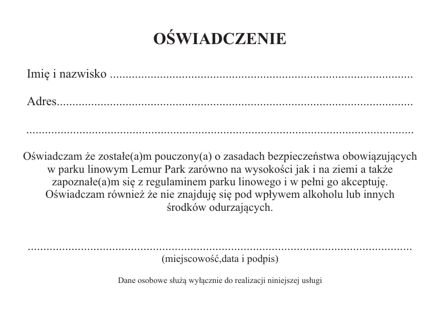 OŒWIADCZENIE Imiê i nazwisko ................................................................................................. Adres.................................................................................................................. ............................................................................................................................ Oœwiadczam ¿e zosta³e(a)m pouczony(a) o zasadach bezpieczeñstwa obowi¹zuj¹cych w parku linowym Lemur Park zarówno na wysokoœci jak i na ziemi a tak¿e zapozna³e(a)m siê z regulaminem parku linowego i w pe³ni go akceptujê. Oœwiadczam równie¿ ¿e nie znajdujê siê pod wp³ywem alkoholu lub innych œrodków odurzaj¹cych. ........................................................................................................................... (miejscowoœæ,data i podpis) Dane osobowe s³u¿¹ wy³¹cznie do realizacji niniejszej us³ugi