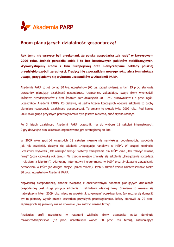Boom planujących działalność gospodarczą! Rok temu nie wszyscy byli przekonani, Ŝe polska gospodarka „da radę” w kryzysowym 2009 roku. Jednak poradziła sobie i to bez kosztownych pakietów stabilizacyjnych. Wykorzystujemy środki z Unii Europejskiej oraz niewyczerpane pokłady polskiej przedsiębiorczości i zaradności. Tradycyjnie z początkiem nowego roku, ale z tym większą uwagą, przyglądamy się wyborom uczestników w Akademii PARP. Akademia PARP to juŜ ponad 80 tys. uczestników (60 tys. przed rokiem), w tym 15 proc. stanowią uczestnicy planujący działalność gospodarczą. Uczestnicy, zakładający swoje firmy wyprzedzili ilościowo przedsiębiorców z firm średnich zatrudniających 50 – 249 pracowników (14 proc. ogółu uczestników Akademii PARP). Co ciekawe, aŜ jedna trzecia kończących obecnie szkolenia to osoby planujące rozpoczęcie działalności gospodarczej. Te zmiany to skutek tylko 2009 roku. Pod koniec 2008 roku grupa przyszłych przedsiębiorców była jeszcze nieliczna, choć szybko rosnąca. Po 3 latach działalności Akademii PARP uczestnik ma do wyboru 18 szkoleń internetowych, 2 gry decyzyjne oraz okresowo organizowaną grę strategiczną on-line. W 2009 roku spośród wszystkich 18 szkoleń niezmiennie największą popularnością, podobnie jak rok wcześniej, cieszyło się szkolenie „Negocjacje handlowe w MŚP”. W drugiej kolejności uczestnicy wybierali „Jak rozwijać firmę? Systemy zarządzania dla MŚP” oraz „Jak załoŜyć własną firmę” (poza czołówką rok temu). Na trzecim miejscu znalazły się szkolenia „Zarządzanie sprzedaŜą i relacjami z klientem”, „Marketing internetowy i e-commerce w MŚP” oraz „Praktyczne zarządzanie personelem w MŚP” (na drugim miejscu przed rokiem). Tych 6 szkoleń zbiera zainteresowanie blisko 80 proc. uczestników Akademii PARP. Największą niespodzianką, chociaŜ związaną z obserwowanym boomem planujących działalność gospodarczą, jest druga pozycja szkolenia z zakładania własnej firmy. Szkolenie to okazało się największym hitem 2009 roku, nieco na przekór „kryzysowym” oczekiwaniom. Jak moŜna się domyślić był to pierwszy wybór przede wszystkim przyszłych przedsiębiorców, którzy stanowili aŜ 72 proc. zapisujących się pierwszy raz na szkolenie „Jak załoŜyć własną firmę”. Analizując profil uczestnika mikroprzedsiębiorstwa (52 w proc. kategorii wielkości uczestników wobec firmy 60 uczestnika proc. rok nadal temu), dominują zatrudniające do 9 pracowników. Najwięcej uczestników pochodzi z województw: mazowieckiego (25 proc. wobec 23 proc. przed rokiem), dolnośląskiego (ponad 10 proc.), śląskiego (prawie 10 proc.) i wielkopolskiego (9 proc.). Czołówka pozostaje bez zmian, choć powiększa się róŜnica pomiędzy Mazowszem a pozostałymi województwami. Podobnie jak na koniec 2008 roku najmniej uczestników pochodzi z województwa świętokrzyskiego (niecałe 2 proc.). Udział kobiet w ogóle uczestników Akademii PARP nadal się powiększa i wynosi juŜ 54 proc (53 proc. przed rokiem) wśród noworejestrujących się oraz aŜ 58 proc. wśród kończących szkolenia. Uczestnicy zamieszkali na wsi stanowią zdecydowaną mniejszość: 13 proc. wśród rozpoczynających szkolenia, 17 proc. wśród kończących. Uczestnik Akademii PARP nadal młodnieje. Na koniec 2009 roku średnia wieku uczestnika to 31 lat (mediana: 29 lat), wobec 32 lat przed rokiem i 34 lat na koniec 2007 roku. Wykształcenie wyŜsze zadeklarowało 67 proc. (nieznaczny spadek z ponad 70 proc. przed rokiem). Wynika z tego, Ŝe przeciętny uczestnik (uczestniczka) Akademii PARP to młoda, wykształcona osoba, właściciel firmy lub jego pracownik, prowadzący (lub planujący) swoją działalność gospodarczą w mieście. Serdecznie zapraszamy do korzystania z bezpłatnych, biznesowych szkoleń internetowych i licznych moŜliwości Akademii PARP w 2009 roku. W portalu znaleźć moŜna najwyŜszej jakości nowoczesne rozwiązania szkoleniowe, opracowane specjalnie dla polskich małych i średnich firm. Do dyspozycji naszych uczestników pozostają opiekunowie, przez 6 dni w tygodniu. Więcej informacji: www.akademiaparp.gov.pl [email protected] Infolinia 0-801 444 MSP (czyli 0-801 444 677)