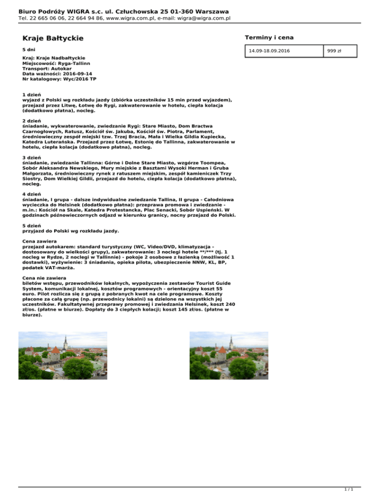 Biuro Podróży WIGRA s.c. ul. Człuchowska 25 01-360 Warszawa Tel. 22 665 06 06, 22 664 94 86, www.wigra.com.pl, e-mail: [email protected] Kraje Bałtyckie 5 dni Terminy i cena 14.09-18.09.2016 999 zł Kraj: Kraje Nadbałtyckie Miejscowość: Ryga-Tallinn Transport: Autokar Data ważności: 2016-09-14 Nr katalogowy: Wyc/2016 TP 1 dzień wyjazd z Polski wg rozkładu jazdy (zbiórka uczestników 15 min przed wyjazdem), przejazd przez Litwę, Łotwę do Rygi, zakwaterowanie w hotelu, ciepła kolacja (dodatkowo płatna), nocleg. 2 dzień śniadanie, wykwaterowanie, zwiedzanie Rygi: Stare Miasto, Dom Bractwa Czarnogłowych, Ratusz, Kościół św. Jakuba, Kościół św. Piotra, Parlament, średniowieczny zespół miejski tzw. Trzej Bracia, Mała i Wielka Gildia Kupiecka, Katedra Luterańska. Przejazd przez Łotwę, Estonię do Tallinna, zakwaterowanie w hotelu, ciepła kolacja (dodatkowo płatna), nocleg. 3 dzień śniadanie, zwiedzanie Tallinna: Górne i Dolne Stare Miasto, wzgórze Toompea, Sobór Aleksandra Newskiego, Mury miejskie z Basztami Wysoki Herman i Gruba Małgorzata, średniowieczny rynek z ratuszem miejskim, zespół kamieniczek Trzy Siostry, Dom Wielkiej Gildii, przejazd do hotelu, ciepła kolacja (dodatkowo płatna), nocleg. 4 dzień śniadanie, I grupa - dalsze indywidualne zwiedzanie Tallina, II grupa - Całodniowa wycieczka do Helsinek (dodatkowo płatna): przeprawa promowa i zwiedzanie m.in.: Kościół na Skale, Katedra Protestancka, Plac Senacki, Sobór Uspieński. W godzinach późnowieczornych odjazd w kierunku granicy, nocny przejazd do Polski. 5 dzień przyjazd do Polski wg rozkładu jazdy. Cena zawiera przejazd autokarem: standard turystyczny (WC, Video/DVD, klimatyzacja dostosowany do wielkości grupy), zakwaterowanie: 3 noclegi hotele **/*** (tj. 1 nocleg w Rydze, 2 noclegi w Tallinnie) - pokoje 2 osobowe z łazienką (możliwość 1 dostawki), wyżywienie: 3 śniadania, opieka pilota, ubezpieczenie NNW, KL, BP, podatek VAT-marża. Cena nie zawiera biletów wstępu, przewodników lokalnych, wypożyczenia zestawów Tourist Guide System, komunikacji lokalnej, kosztów programowych - orientacyjny koszt 55 euro. Pilot rozlicza się z grupą z pobranych kwot na cele programowe. Koszty płacone za całą grupę (np. przewodnicy lokalni) są dzielone na wszystkich jej uczestników. Fakultatywnej przeprawy promowej i zwiedzania Helsinek, koszt 240 zł/os. (płatne w biurze). Dopłaty do 3 ciepłych kolacji; koszt 145 zł/os. (płatne w biurze). 1/1 Powered by TCPDF (www.tcpdf.org)