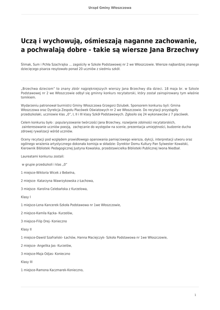 Urząd Gminy Włoszczowa Uczą i wychowują, ośmieszają naganne zachowanie, a pochwalają dobre - takie są wiersze Jana Brzechwy Ślimak, Sum i Pchła Szachrajka … zagościły w Szkole Podstawowej nr 2 we Włoszczowie. Wiersze najbardziej znanego dziecięcego pisarza resytowało ponad 20 uczniów z siedmiu szkół. „Brzechwa dzieciom” to znany zbiór najpiękniejszych wierszy Jana Brzechwy dla dzieci. 18 maja br. w Szkole Podstawowej nr 2 we Włoszczowie odbył się gminny konkurs recytatorski, który został zainspirowany tym właśnie tomikiem. Wydarzeniu patronował burmistrz Gminy Włoszczowa Grzegorz Dziubek. Sponsorem konkursu byli: Gmina Włoszczowa oraz Dyrekcja Zespołu Placówek Oświatowych nr 2 we Włoszczowie. Do recytacji przystąpiły przedszkolaki, uczniowie klas „0”, I, II i III klasy Szkół Podstawowych. Zgłosiło się 24 wykonawców z 7 placówek. Celem konkursu było : popularyzowanie twórczości Jana Brzechwy, rozwijanie zdolności recytatorskich, zainteresowanie uczniów poezją, zachęcanie do występów na scenie, prezentacja umiejętności, budzenie ducha zdrowej rywalizacji wśród uczniów. Oceny recytacji pod względem prawidłowego opanowania pamięciowego wiersza, dykcji, interpretacji utworu oraz ogólnego wrażenia artystycznego dokonała komisja w składzie: Dyrektor Domu Kultury Pan Sylwester Kowalski, Kierownik Biblioteki Pedagogicznej Justyna Kowalska, przedstawicielka Biblioteki Publicznej Iwona Niedbał. Laureatami konkursu zostali: w grupie przedszkoli i klas „0” 1 miejsce-Wiktoria Wicek z Bebelna, 2 miejsce- Katarzyna Wawrzykowska z Łachowa, 3 miejsce- Karolina Celebańska z Kurzelowa, Klasy I 1 miejsce-Lena Kancerek-Szkoła Podstawowa nr 1we Włoszczowie, 2 miejsce-Kamila Kącka- Kurzelów, 3 miejsce-Filip Drej- Konieczno Klasy II 1 miejsce-Dawid Szafrański- Łachów, Hanna Maciejczyk- Szkoła Podstawowa nr 1we Włoszczowie, 2 miejsce- Angelika Jas- Kurzelów, 3 miejsce-Maja Odjas- Konieczno Klasy III 1 miejsce-Ramona Kaczmarek-Konieczno, 1 Urząd Gminy Włoszczowa 2 miejsce-Kalina Toborek- Szkoła Podstawowa nr 2 we Włoszczowie, 3 miejsce-Roksana Rydzek - Szkoła Podstawowa nr 1 we Włoszczowie. Każde dziecko biorące udział w konkursie otrzymało liczne upominki oraz przepiękny, barwny dyplom, który wręczała Naczelnik Spraw Obywatelskich UG Grażyna Albrycht. Miłośnicy twórczości Jana Brzechwy podczas przerwy mieli okazję pobawić się w przygotowanym, specjalnie dla nich, kąciku sportowym i zjeść smaczny poczęstunek. Gratulujemy serdecznie małym artystom i ich opiekunkom. 2