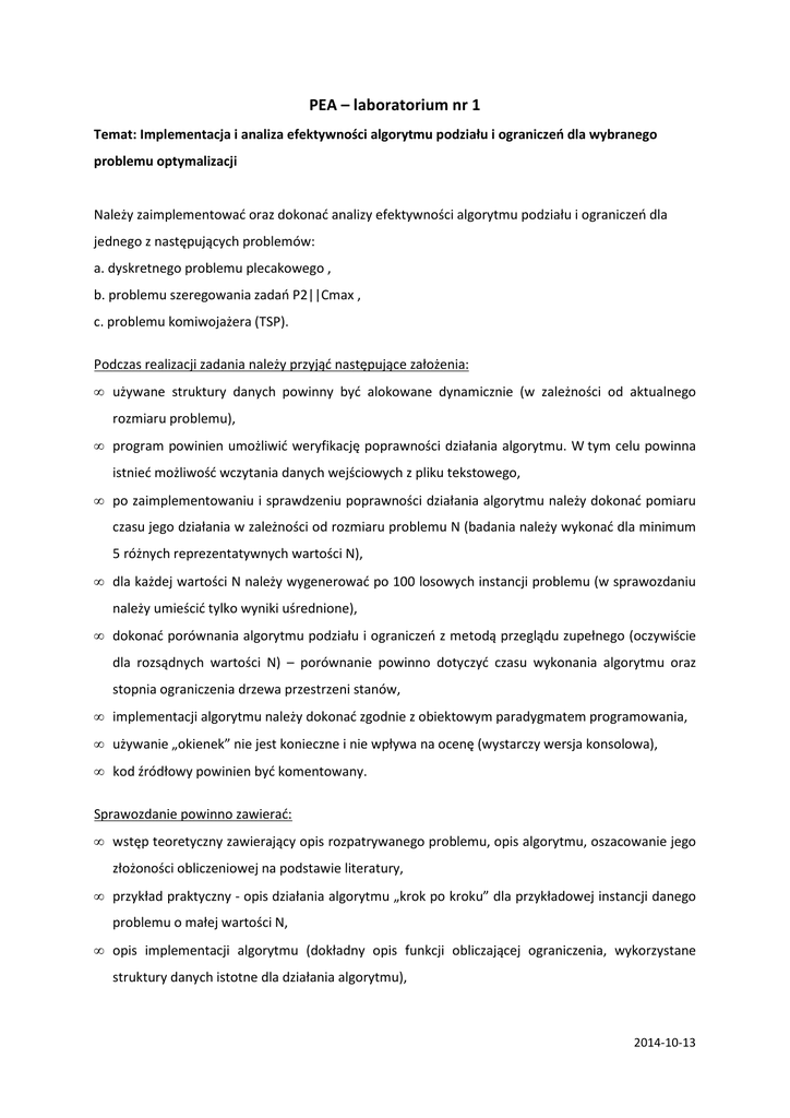 PEA – laboratorium nr 1 Temat: Implementacja i analiza efektywności algorytmu podziału i ograniczeń dla wybranego problemu optymalizacji Należy zaimplementować oraz dokonać analizy efektywności algorytmu podziału i ograniczeń dla jednego z następujących problemów: a. dyskretnego problemu plecakowego , b. problemu szeregowania zadań P2||Cmax , c. problemu komiwojażera (TSP). Podczas realizacji zadania należy przyjąć następujące założenia: • używane struktury danych powinny być alokowane dynamicznie (w zależności od aktualnego rozmiaru problemu), • program powinien umożliwić weryfikację poprawności działania algorytmu. W tym celu powinna istnieć możliwość wczytania danych wejściowych z pliku tekstowego, • po zaimplementowaniu i sprawdzeniu poprawności działania algorytmu należy dokonać pomiaru czasu jego działania w zależności od rozmiaru problemu N (badania należy wykonać dla minimum 5 różnych reprezentatywnych wartości N), • dla każdej wartości N należy wygenerować po 100 losowych instancji problemu (w sprawozdaniu należy umieścić tylko wyniki uśrednione), • dokonać porównania algorytmu podziału i ograniczeń z metodą przeglądu zupełnego (oczywiście dla rozsądnych wartości N) – porównanie powinno dotyczyć czasu wykonania algorytmu oraz stopnia ograniczenia drzewa przestrzeni stanów, • implementacji algorytmu należy dokonać zgodnie z obiektowym paradygmatem programowania, • używanie „okienek” nie jest konieczne i nie wpływa na ocenę (wystarczy wersja konsolowa), • kod źródłowy powinien być komentowany. Sprawozdanie powinno zawierać: • wstęp teoretyczny zawierający opis rozpatrywanego problemu, opis algorytmu, oszacowanie jego złożoności obliczeniowej na podstawie literatury, • przykład praktyczny - opis działania algorytmu „krok po kroku” dla przykładowej instancji danego problemu o małej wartości N, • opis implementacji algorytmu (dokładny opis funkcji obliczającej ograniczenia, wykorzystane struktury danych istotne dla działania algorytmu), 2014-10-13 • plan eksperymentu (rozmiar używanych struktur danych, sposób generowania danych, metoda pomiaru czasu, itp.), • wyniki eksperymentów (w postaci tabel i wykresów), • wnioski dotyczące otrzymanych wyników, • kod źródłowy w formie elektronicznej wraz z wersją wykonywalną programu. Ocena zadania: – pełne i poprawne wykonanie zadania dla problemu plecakowego (ocena 4.0) – pełne i poprawne wykonanie zadania dla problemu P2||Cmax (ocena 4.0) – pełne i poprawne wykonanie zadania dla problemu komiwojażera (ocena 5.0) – pełne i poprawne wykonanie zadania dla problemu komiwojażera + porównanie wyników dla dwóch różnych funkcji ograniczeń (ocena 5.5) Sprawdzenie poprawności zaimplementowanego algorytmu: Aby sprawdzić poprawność działania algorytmu należy zapewnić możliwość wczytania danych z pliku tekstowego i wykonania na nich obliczeń. Format danych w pliku jest następujący: a) dla problemu P2||Cmax - w pierwszej linii należy podać liczbę zadań - w drugiej linii przedzielone spacjami czasy trwania poszczególnych zadań b) dla problemu plecakowego - w pierwszej linii należy podać liczbę przedmiotów i pojemność plecaka (oddzielone spacją) - w kolejnych liniach dane dotyczące przedmiotów tzn. w każdej linii jest para liczb: objętość i wartość danego przedmiotu (oddzielone spacją) c) dla problemu komiwojażera - w pierwszej linii należy podać liczbę miast - w pozostałych liniach macierz kosztów: w każdej linii wiersz macierzy (liczby przedzielone spacją) określający odległości z danego miasta do pozostałych miast - dane na przekątnej mają wartość równą -1 Przykładowe materiały: http://home.agh.edu.pl/~martak/BO_wyklad5.pdf - ogólnie http://www.cs.put.poznan.pl/mkomosinski/materialy/optymalizacja/BB_DP.pdf - ogólnie http://www.cs.put.poznan.pl/mkomosinski/materialy/optymalizacja/BB_DP.pdf - plecakowy i TSP 2014-10-13