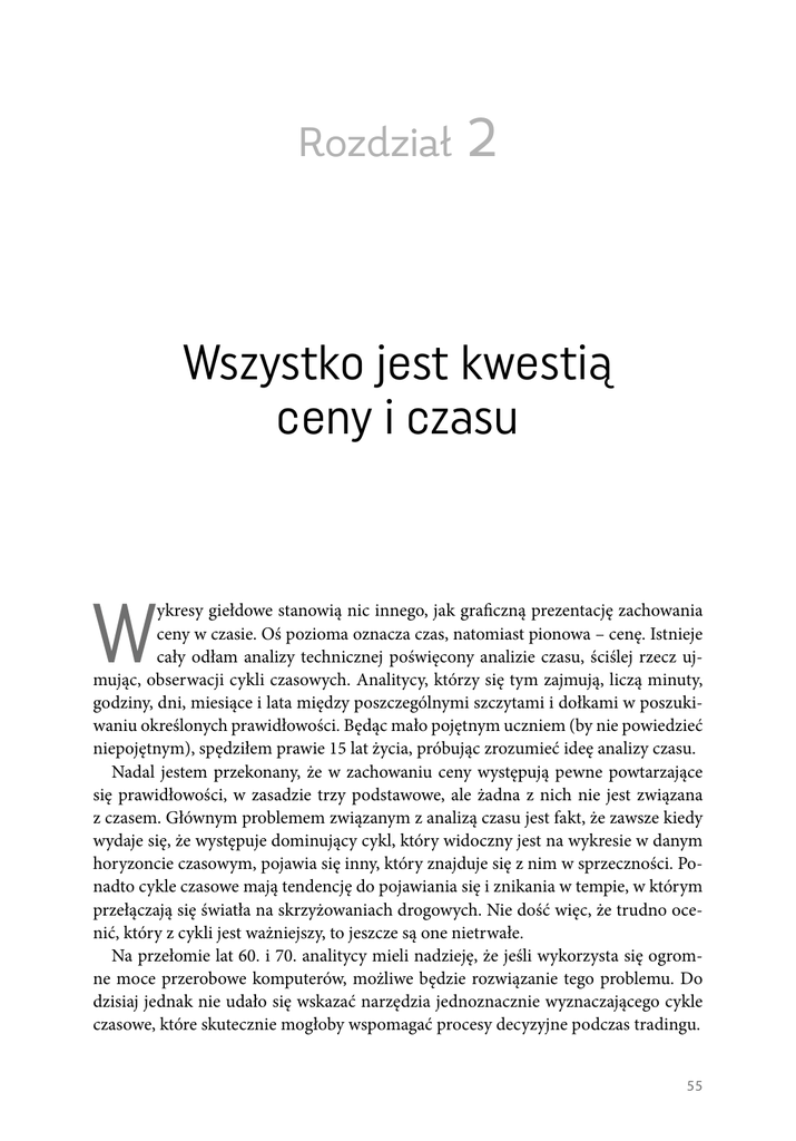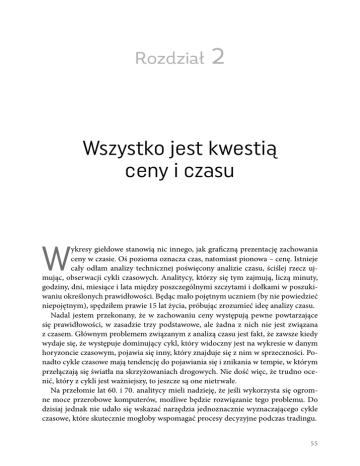 Rozdział 2 Wszystko jest kwestią ceny i czasu W ykresy giełdowe stanowią nic innego, jak graficzną prezentację zachowania ceny w czasie. Oś pozioma oznacza czas, natomiast pionowa – cenę. Istnieje cały odłam analizy technicznej poświęcony analizie czasu, ściślej rzecz ujmując, obserwacji cykli czasowych. Analitycy, którzy się tym zajmują, liczą minuty, godziny, dni, miesiące i lata między poszczególnymi szczytami i dołkami w poszukiwaniu określonych prawidłowości. Będąc mało pojętnym uczniem (by nie powiedzieć niepojętnym), spędziłem prawie 15 lat życia, próbując zrozumieć ideę analizy czasu. Nadal jestem przekonany, że w zachowaniu ceny występują pewne powtarzające się prawidłowości, w zasadzie trzy podstawowe, ale żadna z nich nie jest związana z czasem. Głównym problemem związanym z analizą czasu jest fakt, że zawsze kiedy wydaje się, że występuje dominujący cykl, który widoczny jest na wykresie w danym horyzoncie czasowym, pojawia się inny, który znajduje się z nim w sprzeczności. Ponadto cykle czasowe mają tendencję do pojawiania się i znikania w tempie, w którym przełączają się światła na skrzyżowaniach drogowych. Nie dość więc, że trudno ocenić, który z cykli jest ważniejszy, to jeszcze są one nietrwałe. Na przełomie lat 60. i 70. analitycy mieli nadzieję, że jeśli wykorzysta się ogromne moce przerobowe komputerów, możliwe będzie rozwiązanie tego problemu. Do dzisiaj jednak nie udało się wskazać narzędzia jednoznacznie wyznaczającego cykle czasowe, które skutecznie mogłoby wspomagać procesy decyzyjne podczas tradingu. 55 Sekrety tradingu krótkoterminowego Tabela 2.1. Wyniki systemu dla rynku soi opartego na przecięciu średnich kroczących (5;25) – okres: od 29 kwietnia 1975 do 1 stycznia 1987 Rynek: Soja Okres badania: 29.04.75–01.01.87 67/99 Nr Konw. Wartość c. Prowizja Poślizg Depozyt Format Ścieżka dostępu 17 -1 6,25 $ 50 $ 0$ 3000 $ CSI C:\GD\BACK67\F051.DTA Wszystkie transakcje – Test 1 Zysk 40 075,00 $ Suma transakcji zyskownych 126 212,50 $ Suma transakcji stratnych –86 137,50 $ Liczba transakcji 153 Skuteczność 35% Liczba zyskownych transakcji 54 Liczba stratnych transakcji 99 Największy zysk 13 000,00 $ Największa strata –2362,50 $ Średni zysk w zyskownej transakcji 2337,27 $ Średnia strata w stratnej transakcji –870,08 $ Stosunek śr. zysku do śr. straty 2,68 Wartość oczekiwana na transakcji 261,93 $ Najdłuższa seria zyskownych transakcji 2 Najdłuższa seria stratnych transakcji 8 Przeciętna długość zyskownej transakcji (l. barów) 35 Przeciętna długość stratnej transakcji (l. barów) 10 Największe obsunięcie kapitału liczone po cenach zamknięcia transakcji –13 625,00 $ Największe obsunięcie kapitału –13 687,50 $ Profit factor (suma zysków/suma strat) 1,46 Największy rozmiar otwartej pozycji 1 Wymagany depozyt1 16 687,50 $ Teoretyczna stopa zwrotu2 240% Udowodnię mój punkt widzenia, przedstawiając wyniki konkretnych badań. W tabeli 2.1 znajdują się rezultaty testów przeprowadzonych dla rynku soi. System polega na otwieraniu transakcji długich w momencie, gdy krótkoterminowa średnia ruchoma wybija się powyżej długoterminowej średniej. Jedyną zmienną w proponowanym systemie jest więc czas3, mierzony liczbą dni, z których stworzone są oba wskaźniki. Jeśli rynek poruszałby się cyklicznie, to stworzenie systemu opartego na logice bazującej na czasie byłoby możliwe. Pierwszy test wykonałem na rynku soi. Uwzględniał on dane od 29 kwietnia 1975 do 1 stycznia 1987. Celem badania było znalezienie optymalnej kombinacji krótkoterminowych i długoterminowych średnich ruchomych. Po kilkunastu próbach okazało 12 Liczony jako suma Największego obsunięcia kapitału oraz Depozytu koniecznego do otwarcia wielkości transakcji wyliczonej zgodnie z przyjętą w danym systemie transakcyjnym metodą zarządzania kapitałem (w tym konkretnym przypadku 1 kontraktu) (przyp. red.). 2 Liczona jako stosunek Zysku do wartości Wymaganego depozytu. Teoretyczna stopa zwrotu wskazuje, jaki byłby procentowy zysk przy zainwestowaniu Wymaganego depozytu i otwieraniu pozycji zgodnie z przyjętą w danym systemie transakcyjnym metodą zarządzania kapitałem (w tym przypadku każda transakcja była otwierana 1 kontraktem) (przyp.red.). 3 Średnia ruchoma powstaje poprzez wyciągnięcie średniej arytmetycznej z cen zamknięcia ostatnich X sesji tradingu (przyp. red.). 1 56 Wszystko jest kwestią ceny i czasu Tabela 2.2. Wyniki systemu dla rynku soi opartego na przecięciu średnich kroczących (5;25) – okres: od 1 stycznia 1987 do 23 kwietnia 1998 Rynek: Soja Okres badania: 01.01.87 – 23.04.98 67/99 Nr Konw. Wartość c. Prowizja Poślizg Depozyt Format Ścieżka dostępu 17 -1 6,25 $ 50 $ 0$ 3000 $ CSI C:\GD\BACK67\F051.DTA Wszystkie transakcje – Test 1 Zysk –9100 $ Suma transakcji zyskownych 81 612,50 $ Suma transakcji stratnych –90 712,50 $ Liczba transakcji 163 Skuteczność 31% Liczba zyskownych transakcji 52 Liczba stratnych transakcji 111 Największy zysk 10 062,50 $ Największa strata –2950,00 $ Średni zysk w zyskownej transakcji 1569,47 $ Średnia strata w stratnej transakcji –817,23 $ Stosunek śr. zysku do śr. straty 1,92 Wartość oczekiwana na transakcji –55,83 $ Najdłuższa seria zyskownych transakcji 5 Najdłuższa seria stratnych transakcji 9 Przeciętna długość zyskownej transakcji (l. barów) 30 Przeciętna długość stratnej transakcji (l. barów) 11 Największe obsunięcie kapitału liczone po cenach zamknięcia transakcji –28 612,50 $ Największe obsunięcie kapitału –29 412,50 $ Profit factor (suma zysków/suma strat) 0,89 Największy rozmiar otwartej pozycji 1 Wymagany depozyt 32 412,50 $ Teoretyczna stopa zwrotu –28% się, że w tym okresie najlepiej sprawdziły się pięciodniowa i 25-dniowa średnia. Opierając się na wygenerowanych w ten sposób sygnałach, zaro