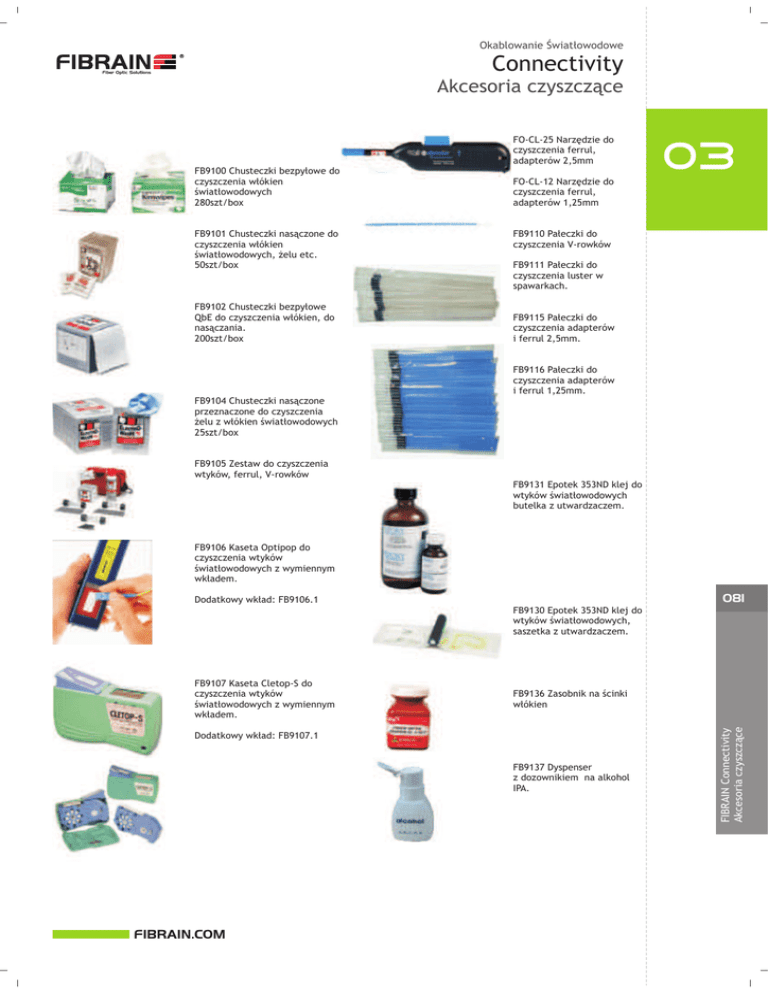 Okablowanie Światłowodowe Connectivity Akcesoria czyszczące FB9100 Chusteczki bezpyłowe do czyszczenia włókien światłowodowych 280szt/box FB9101 Chusteczki nasączone do czyszczenia włókien światłowodowych, żelu etc. 50szt/box FB9102 Chusteczki bezpyłowe QbE do czyszczenia włókien, do nasączania. 200szt/box FB9104 Chusteczki nasączone przeznaczone do czyszczenia żelu z włókien światłowodowych 25szt/box FB9105 Zestaw do czyszczenia wtyków, ferrul, V-rowków FO-CL-25 Narzędzie do czyszczenia ferrul, adapterów 2,5mm FO-CL-12 Narzędzie do czyszczenia ferrul, adapterów 1,25mm 03 FB9110 Pałeczki do czyszczenia V-rowków FB9111 Pałeczki do czyszczenia luster w spawarkach. FB9115 Pałeczki do czyszczenia adapterów i ferrul 2,5mm. FB9116 Pałeczki do czyszczenia adapterów i ferrul 1,25mm. FB9131 Epotek 353ND klej do wtyków światłowodowych butelka z utwardzaczem. FB9106 Kaseta Optipop do czyszczenia wtyków światłowodowych z wymiennym wkładem. FB9107 Kaseta Cletop-S do czyszczenia wtyków światłowodowych z wymiennym wkładem. 081 FB9130 Epotek 353ND klej do wtyków światłowodowych, saszetka z utwardzaczem. FB9136 Zasobnik na ścinki włókien Dodatkowy wkład: FB9107.1 FB9137 Dyspenser z dozownikiem na alkohol IPA. FIBRAIN.COM FIBRAIN Connectivity Akcesoria czyszczące Dodatkowy wkład: FB9106.1