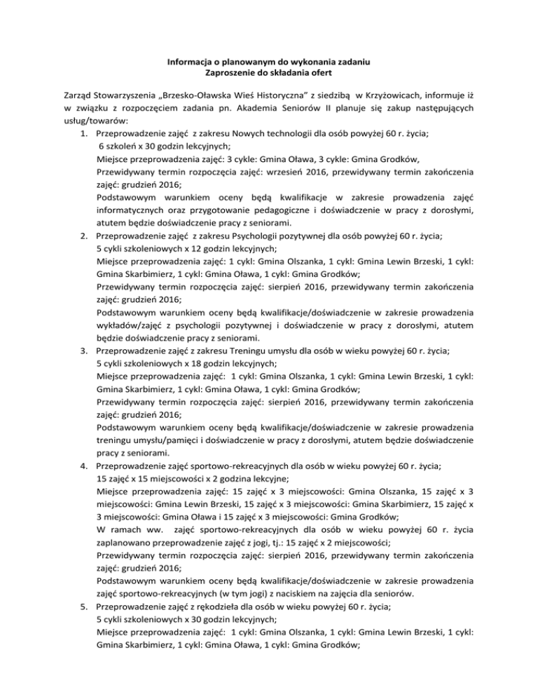 Informacja o planowanym do wykonania zadaniu Zaproszenie do składania ofert Zarząd Stowarzyszenia „Brzesko-Oławska Wieś Historyczna” z siedzibą w Krzyżowicach, informuje iż w związku z rozpoczęciem zadania pn. Akademia Seniorów II planuje się zakup następujących usług/towarów: 1. Przeprowadzenie zajęć z zakresu Nowych technologii dla osób powyżej 60 r. życia; 6 szkoleń x 30 godzin lekcyjnych; Miejsce przeprowadzenia zajęć: 3 cykle: Gmina Oława, 3 cykle: Gmina Grodków, Przewidywany termin rozpoczęcia zajęć: wrzesień 2016, przewidywany termin zakończenia zajęć: grudzień 2016; Podstawowym warunkiem oceny będą kwalifikacje w zakresie prowadzenia zajęć informatycznych oraz przygotowanie pedagogiczne i doświadczenie w pracy z dorosłymi, atutem będzie doświadczenie pracy z seniorami. 2. Przeprowadzenie zajęć z zakresu Psychologii pozytywnej dla osób powyżej 60 r. życia; 5 cykli szkoleniowych x 12 godzin lekcyjnych; Miejsce przeprowadzenia zajęć: 1 cykl: Gmina Olszanka, 1 cykl: Gmina Lewin Brzeski, 1 cykl: Gmina Skarbimierz, 1 cykl: Gmina Oława, 1 cykl: Gmina Grodków; Przewidywany termin rozpoczęcia zajęć: sierpień 2016, przewidywany termin zakończenia zajęć: grudzień 2016; Podstawowym warunkiem oceny będą kwalifikacje/doświadczenie w zakresie prowadzenia wykładów/zajęć z psychologii pozytywnej i doświadczenie w pracy z dorosłymi, atutem będzie doświadczenie pracy z seniorami. 3. Przeprowadzenie zajęć z zakresu Treningu umysłu dla osób w wieku powyżej 60 r. życia; 5 cykli szkoleniowych x 18 godzin lekcyjnych; Miejsce przeprowadzenia zajęć: 1 cykl: Gmina Olszanka, 1 cykl: Gmina Lewin Brzeski, 1 cykl: Gmina Skarbimierz, 1 cykl: Gmina Oława, 1 cykl: Gmina Grodków; Przewidywany termin rozpoczęcia zajęć: sierpień 2016, przewidywany termin zakończenia zajęć: grudzień 2016; Podstawowym warunkiem oceny będą kwalifikacje/doświadczenie w zakresie prowadzenia treningu umysłu/pamięci i doświadczenie w pracy z dorosłymi, atutem będzie doświadczenie pracy z seniorami. 4. Przeprowadzenie zajęć sportowo-rekreacyjnych dla osób w wieku powyżej 60 r. życia; 15 zajęć x 15 miejscowości x 2 godzina lekcyjne; Miejsce przeprowadzenia zajęć: 15 zajęć x 3 miejscowości: Gmina Olszanka, 15 zajęć x 3 miejscowości: Gmina Lewin Brzeski, 15 zajęć x 3 miejscowości: Gmina Skarbimierz, 15 zajęć x 3 miejscowości: Gmina Oława i 15 zajęć x 3 miejscowości: Gmina Grodków; W ramach ww. zajęć sportowo-rekreacyjnych dla osób w wieku powyżej 60 r. życia zaplanowano przeprowadzenie zajęć z jogi, tj.: 15 zajęć x 2 miejscowości; Przewidywany termin rozpoczęcia zajęć: sierpień 2016, przewidywany termin zakończenia zajęć: grudzień 2016; Podstawowym warunkiem oceny będą kwalifikacje/doświadczenie w zakresie prowadzenia zajęć sportowo-rekreacyjnych (w tym jogi) z naciskiem na zajęcia dla seniorów. 5. Przeprowadzenie zajęć z rękodzieła dla osób w wieku powyżej 60 r. życia; 5 cykli szkoleniowych x 30 godzin lekcyjnych; Miejsce przeprowadzenia zajęć: 1 cykl: Gmina Olszanka, 1 cykl: Gmina Lewin Brzeski, 1 cykl: Gmina Skarbimierz, 1 cykl: Gmina Oława, 1 cykl: Gmina Grodków; 6. 7. 8. 9. 10. Przewidywany termin rozpoczęcia zajęć: sierpień 2016, przewidywany termin zakończenia zajęć: grudzień 2016; Podstawowym warunkiem oceny będą kwalifikacje/doświadczenie w zakresie rękodzieła i doświadczenie w pracy z dorosłymi. Przeprowadzenie zajęć z zakresu edukacji kulturalnej (pantomima) dla osób powyżej 60 r. życia; 15 zajęć x 1 miejscowość x 3 godziny zegarowe; Miejsce przeprowadzenia zajęć: 15 zajęć x 1 miejscowość: Gmina Skarbimierz; Przewidywany termin rozpoczęcia zajęć: sierpień 2016, przewidywany termin zakończenia zajęć: grudzień 2016; Podstawowym warunkiem oceny będą kwalifikacje/doświadczenie w zakresie prowadzenia zajęć teatralnych i doświadczenie w pracy z dorosłymi. Zakup materiałów na zajęcia: a) koce, paski, kostki na zajęcia z jogi; b) zakup materiałów do zajęć z rękodzieła; c) zakup rekwizytów i niezbędnych materiałów na zajęcia z pantomimy. Transport: a) 200 seniorów i seniorek do teatru w Opolu (sierpień/wrzesień 2016); b) 200 seniorów i seniorek do kina w Opolu (październik/listopad 2016); c) 200 seniorów i seniorek na Spotkanie integracyjno-kulturalne. Dostarczenie poczęstunku na Spotkanie integracyjno-kulturalne dla 200 seniorów/seniorek. Występ kabaretu/grupy teatralnej/artysty na spotkaniu integracyjno-kulturalnym. Ceny ofert uwzględniać muszą wszystkie zobowiązania, muszą być podane cyfrowo i słownie. Osoby/podmioty zainteresowane realizacją wyżej opisanych zadań mogą złożyć swoje oferty w terminie do 08.07.2016 r. do godz. 12.00 na adres e-mail: [email protected] Składając ofertę należy wziąć pod uwagę realizację zajęć z zachowaniem ich cykliczności, ponadto zajęcia mogą odbywać się w tym samym terminie i czasie w różnych miejscowościach, w poszczególnych gminach, w godzinach dostosowanych do potrzeb uczestników projektu. Zarząd Stowarzyszenia zastrzega sobie prawo do negocjowania ceny z wybranym oferentem oraz do nie podpisania umowy z żadnym wykonawcą. Szczegółowe informacje udzielane będą w biurze LGD, pod numerem telefonu: 77 412 90 21. Zadanie jest współfinansowane ze środków otrzymanych od Ministra Pracy i Polityki Społecznej w ramach Rządowego Programu na rzecz Aktywności Społecznej Osób Starszych na lata 2014-2020.