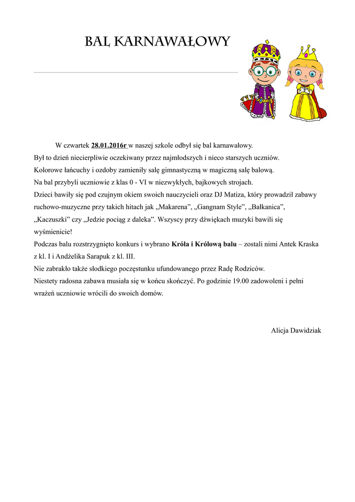 Bal karnawałowy W czwartek 28.01.2016r w naszej szkole odbył się bal karnawałowy. Był to dzień niecierpliwie oczekiwany przez najmłodszych i nieco starszych uczniów. Kolorowe łańcuchy i ozdoby zamieniły salę gimnastyczną w magiczną salę balową. Na bal przybyli uczniowie z klas 0 - VI w niezwykłych, bajkowych strojach. Dzieci bawiły się pod czujnym okiem swoich nauczycieli oraz DJ Matiza, który prowadził zabawy ruchowo-muzyczne przy takich hitach jak „Makarena”, „Gangnam Style”, „Bałkanica”, „Kaczuszki” czy „Jedzie pociąg z daleka”. Wszyscy przy dźwiękach muzyki bawili się wyśmienicie! Podczas balu rozstrzygnięto konkurs i wybrano Króla i Królową balu – zostali nimi Antek Kraska z kl. I i Andżelika Sarapuk z kl. III. Nie zabrakło także słodkiego poczęstunku ufundowanego przez Radę Rodziców. Niestety radosna zabawa musiała się w końcu skończyć. Po godzinie 19.00 zadowoleni i pełni wrażeń uczniowie wrócili do swoich domów. Alicja Dawidziak