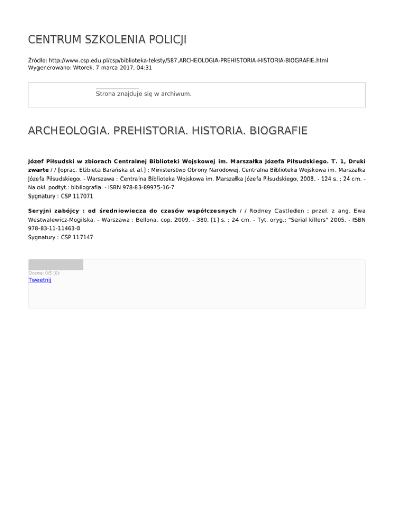 CENTRUM SZKOLENIA POLICJI Źródło: http://www.csp.edu.pl/csp/biblioteka-teksty/587,ARCHEOLOGIA-PREHISTORIA-HISTORIA-BIOGRAFIE.html Wygenerowano: Wtorek, 7 marca 2017, 04:31 Strona znajduje się w archiwum. ARCHEOLOGIA. PREHISTORIA. HISTORIA. BIOGRAFIE Józef Piłsudski w zbiorach Centralnej Biblioteki Wojskowej im. Marszałka Józefa Piłsudskiego. T. 1, Druki zwarte / / [oprac. Elżbieta Barańska et al.] ; Ministerstwo Obrony Narodowej, Centralna Biblioteka Wojskowa im. Marszałka Józefa Piłsudskiego. - Warszawa : Centralna Biblioteka Wojskowa im. Marszałka Józefa Piłsudskiego, 2008. - 124 s. ; 24 cm. Na okł. podtyt.: bibliografia. - ISBN 978-83-89975-16-7 Sygnatury : CSP 117071 Seryjni zabójcy : od średniowiecza do czasów współczesnych / / Rodney Castleden ; przeł. z ang. Ewa Westwalewicz-Mogilska. - Warszawa : Bellona, cop. 2009. - 380, [1] s. ; 24 cm. - Tyt. oryg.: "Serial killers" 2005. - ISBN 978-83-11-11463-0 Sygnatury : CSP 117147 Ocena: 0/5 (0) Tweetnij