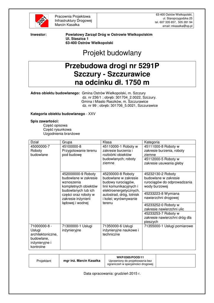 63-400 Ostrów Wielkopolski, ul. Staroprzygodzka 25 tel. 607 335 657, 505 281 94 email: [email protected] Pracownia Projektowa Infrastruktury Drogowej Marcin Kasałka Inwestor: Powiatowy Zarząd Dróg w Ostrowie Wielkopolskim Ul. Staszica 1 63-400 Ostrów Wielkopolski Projekt budowlany Przebudowa drogi nr 5291P Szczury - Szczurawice na odcinku dł. 1750 m Adres obiektu budowlanego: Gmina Ostrów Wielkopolski, m. Szczury dz. nr 236/1 ; obręb: 301704_2.0022, Szczury. Gmina i Miasto Raszków, m. Szczurawice dz. nr 99 ; obręb: 301706_5.0021, Szczurawice Kategoria obiektu budowlanego - XXV Spis zawartości: Część opisowa Część rysunkowa Uzgodnienia branżowe Dział 45000000-7 Roboty budowlane 71000000-8 Usługi architektoniczne, budowlane, inżynieryjne i kontrolne Projektant Grupa 45100000-8 Przygotowanie terenu pod budowę Klasa 45110000-1 Roboty w zakresie burzenia i rozbiórki obiektów budowlanych; roboty ziemne Kategoria 45111000-8 Roboty w zakresie burzenia, roboty ziemne 45112000-5 Roboty w zakresie usuwania gleby 452000000-9 Roboty budowlane w zakresie wznoszenia kompletnych obiektów budowlanych lub ich części oraz roboty w zakresie inżynierii lądowej i wodnej 45230000-8 Roboty budowlane w zakresie budowy rurociągów, linii komunikacyjnych i elektroenergetycznych, autostrad, dróg, lotnisk i kolei; wyrównywanie terenu 45232130-2 Roboty budowlane w zakresie rurociągów do odprowadzania wody burzowej 71300000-1 Usługi inżynieryjne 71350000-6 Usługi inżynieryjne naukowe i techniczne mgr inż. Marcin Kasałka 45233223-8 Wymiana nawierzchni drogowej 45233252-0 Roboty w zakresie nawierzchni ulic 45233253-7 Roboty w zakresie nawierzchni dróg dla pieszych 71355000-1 Usługi pomiarowe WKP/0305/POOD/11 Uprawniony do projektowania bez ograniczeń w specjalności drogowej Data opracowania: grudzień 2015 r. Przebudowa drogi nr 5291P Szczury – Szczurawice na odcinku 1750 m Marcin Kasałka WKP/0305/POOD/11 WKP-7JT-7Z6-LAE Oświadczenie Projektanta lub osoby sprawdzającej projekt budowlany Zgodnie z art. 20 ust. 4 ustawy z dnia 7 lipca 1994r. - Prawo budowlane (tekst jednolity: Dz. U. z 2013 r. poz. 1409) niniejszym oświadczam, że projekt budowlany: Przebudowa drogi nr 5291P Szczury – Szczurawice na odcinku 1750 m sporządzony w dniu: dla: grudzień 2015 r. Powiatowy Zarząd Dróg w Ostrowie Wielkopolskim Ul. Staszica 1 63-400 Ostrów Wielkopolski został wykonany zgodnie z obowiązującymi przepisami oraz zasadami wiedzy technicznej. Ostrów Wielkopolski ……………………………… (miejscowość i data) Projektant: ...................................................... (pieczęć wraz z podpisem) 1 Przebudowa drogi nr 5291P Szczury – Szczurawice na odcinku 1750 m Spis treści 1. 2. 3. Część opisowa 1.1. Przedmiot inwestycji 1.2. Istniejący stan zagospodarowania terenu 1.3. Projektowane zagospodarowanie terenu 1.4. Zestawienie powierzchni 1.5. Rozwiązania budowlane nawiązujące do warunków terenowych 1.6. Układ konstrukcyjny obiektu budowlanego 1.7. Udogodnienia architektoniczne dla osób niepełnosprawnych 1.8. Ochrona zabytków 1.9. Wpływ eksploatacji górniczej 1.10. Informacja o przewidywanych zagrożeniach dla środowiska oraz higieny i ochrony zdrowia 1.11. Informacja o obszarze oddziaływania obiektu 1.12. Informacja BIOZ Część graficzna Plan orientacyjny - skala 1:20 000, rys. nr 1.0 Plan sytuacyjny - skala 1:500, rys. nr 2.1-2.3 Profil podłużny - skala 1:50/500, rys. nr 3.0 Przekroje normalne - skala 1:50, rys. nr 4.0 Uzgodnienia 2 Przebudowa drogi nr 5291P Szczury – Szczurawice na odcinku 1750 m 1. Część opisowa 1.1. Przedmiot inwestycji Opracowanie obejmuje projekt przebudowy drogi nr 5291P na odcinku Szczury – Szczurawice długości 1750 m. Zakres prac związanych z przebudową drogi obejmować będzie: - przebudowę istniejącej nawierzchni bitumicznej jezdni poprzez jej poszerzenie i ułożenie nowej warstwy ścieralnej, - wykonanie chodnika z betonowej kostki brukowej, - renowację istniejącego systemu odwodnienia. 1.2. Istniejący stan zagospodarowania terenu Przebudowywana droga powiatowa znajduje się w miejscowości Szczury i łączy drogę krajową nr 11 z miejscowością Szczurawice. Nawierzchnia drogi powiatowej nr 5291P wykonana jest z betonu asfaltowego a jej stan techniczny jest zły. Szerokość jezdni przebudowywanej drogi powiatowej zawiera się w przedziale od 3,3 m do 4,2 m. Wzdłuż obu krawędzi jezdni znajdują się pobocza gruntowe oraz rowy przydrożne. Na całym odcinku drogi objętym opracowaniem nie występują chodniki. Większość zjazdów na posesje posiada nawierzchnię nieulepszoną (gruntową) a nieliczne są utwardzone betonową kostką brukową. Otoczenie drogi stanowi zabudowa jednorodzinna i niezagospodarowane działki budowlane, łąki i pola uprawne, oraz boisko i świetlica wiejska. W pasie drogowym znajduje się uzbrojenie terenu w postaci: sieci teletechnicznej, sieci energetycznej podziemnej i napowietrznej oraz wodociągu. 1.3. Projektowane zagospodarowanie terenu 1.3.1. Parametry techniczne klasa drogi – L kategoria ruchu – KR2 prędkość projektowa – 50 km/h / 90 km/h przekrój jezdni – 2x2,75m, szerokość chodnika – 2,0 m, szerokość części umocnionej pobocza – 0,75 m, 3 Przebudowa drogi nr 5291P Szczury – Szczurawice na odcinku 1750 m szerokość zjazdów – zmienna, dostosowana indywidualnie dla każdej z posesji. 1.3.2. Rozwiązania sytuacyjne Długość przebudowywanego odcinka drogi nr 5291P wynosi 1750 metrów. Początek kilometracji przyjęty został na skrzyżowaniu (granicy pasa drogowego) drogi krajowej nr 11 w miejscowości Szczury na terenie Gminy Ostrów Wielkopolski. Zakończenie projektowanego odcinka zlokalizowano w miejscowości Szczurawice na terenie Gminy i Miasta Raszków, w miejscu dowiązania do wcześniej wyremontowanego odcinka. Droga powiatowa na projektowanym odcinku odcinku posiadać będzie przekrój typu pół ulicznego na odcinku 
