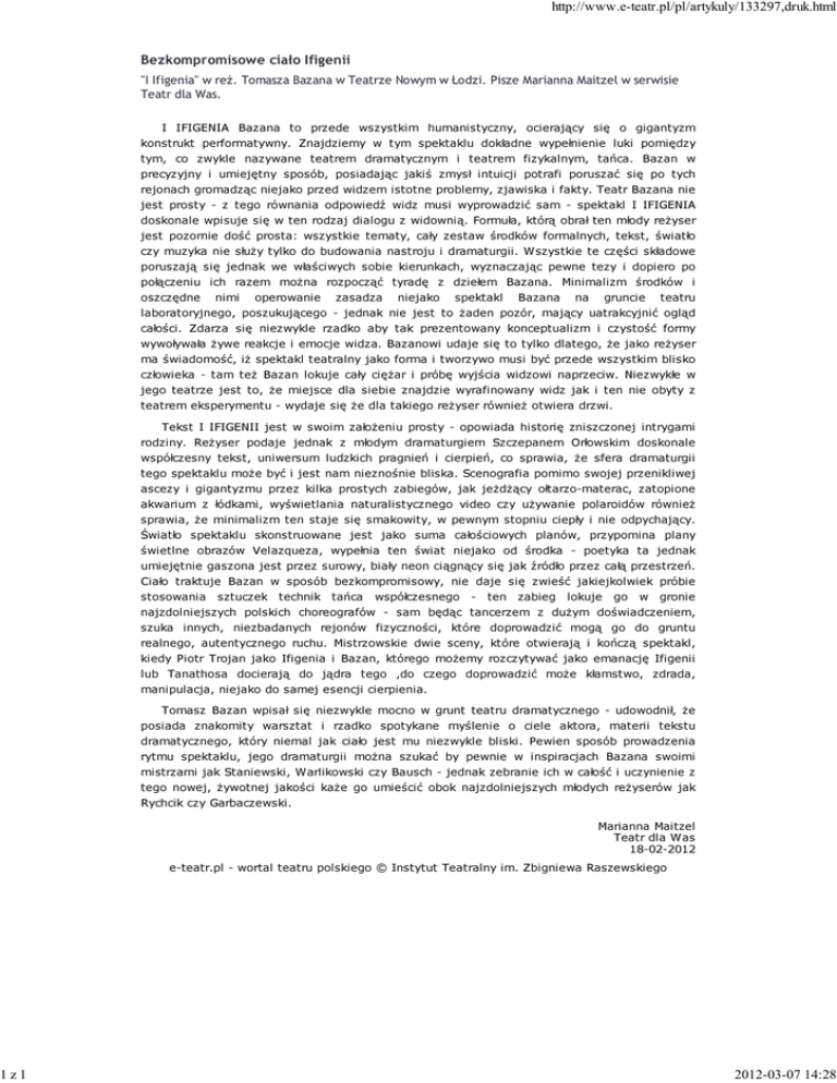 1z1 http://www.e-teatr.pl/pl/artykuly/133297,druk.html Bezkompromisowe ciało Ifigenii "I Ifigenia" w reż. Tomasza Bazana w Teatrze Nowym w Łodzi. Pisze Marianna Maitzel w serwisie Teatr dla Was. I IFIGENIA Bazana to przede wszystkim humanistyczny, ocierający się o gigantyzm konstrukt performatywny. Znajdziemy w tym spektaklu dokładne wypełnienie luki pomiędzy tym, co zwykle nazywane teatrem dramatycznym i teatrem fizykalnym, tańca. Bazan w precyzyjny i umiejętny sposób, posiadając jakiś zmysł intuicji potrafi poruszać się po tych rejonach gromadząc niejako przed widzem istotne problemy, zjawiska i fakty. Teatr Bazana nie jest prosty - z tego równania odpowiedź widz musi wyprowadzić sam - spektakl I IFIGENIA doskonale wpisuje się w ten rodzaj dialogu z widownią. Formuła, którą obrał ten młody reżyser jest pozornie dość prosta: wszystkie tematy, cały zestaw środków formalnych, tekst, światło czy muzyka nie służy tylko do budowania nastroju i dramaturgii. Wszystkie te części składowe poruszają się jednak we właściwych sobie kierunkach, wyznaczając pewne tezy i dopiero po połączeniu ich razem można rozpocząć tyradę z dziełem Bazana. Minimalizm środków i oszczędne nimi operowanie zasadza niejako spektakl Bazana na gruncie teatru laboratoryjnego, poszukującego - jednak nie jest to żaden pozór, mający uatrakcyjnić ogląd całości. Zdarza się niezwykle rzadko aby tak prezentowany konceptualizm i czystość formy wywoływała żywe reakcje i emocje widza. Bazanowi udaje się to tylko dlatego, że jako reżyser ma świadomość, iż spektakl teatralny jako forma i tworzywo musi być przede wszystkim blisko człowieka - tam też Bazan lokuje cały ciężar i próbę wyjścia widzowi naprzeciw. Niezwykłe w jego teatrze jest to, że miejsce dla siebie znajdzie wyrafinowany widz jak i ten nie obyty z teatrem eksperymentu - wydaje się że dla takiego reżyser również otwiera drzwi. Tekst I IFIGENII jest w swoim założeniu prosty - opowiada historię zniszczonej intrygami rodziny. Reżyser podaje jednak z młodym dramaturgiem Szczepanem Orłowskim doskonale współczesny tekst, uniwersum ludzkich pragnień i cierpień, co sprawia, że sfera dramaturgii tego spektaklu może być i jest nam nieznośnie bliska. Scenografia pomimo swojej przenikliwej ascezy i gigantyzmu przez kilka prostych zabiegów, jak jeżdżący ołtarzo-materac, zatopione akwarium z łódkami, wyświetlania naturalistycznego video czy używanie polaroidów również sprawia, że minimalizm ten staje się smakowity, w pewnym stopniu ciepły i nie odpychający. Światło spektaklu skonstruowane jest jako suma całościowych planów, przypomina plany świetlne obrazów Velazqueza, wypełnia ten świat niejako od środka - poetyka ta jednak umiejętnie gaszona jest przez surowy, biały neon ciągnący się jak źródło przez całą przestrzeń. Ciało traktuje Bazan w sposób bezkompromisowy, nie daje się zwieść jakiejkolwiek próbie stosowania sztuczek technik tańca współczesnego - ten zabieg lokuje go w gronie najzdolniejszych polskich choreografów - sam będąc tancerzem z dużym doświadczeniem, szuka innych, niezbadanych rejonów fizyczności, które doprowadzić mogą go do gruntu realnego, autentycznego ruchu. Mistrzowskie dwie sceny, które otwierają i kończą spektakl, kiedy Piotr Trojan jako Ifigenia i Bazan, którego możemy rozczytywać jako emanację Ifigenii lub Tanathosa docierają do jądra tego ,do czego doprowadzić może kłamstwo, zdrada, manipulacja, niejako do samej esencji cierpienia. Tomasz Bazan wpisał się niezwykle mocno w grunt teatru dramatycznego - udowodnił, że posiada znakomity warsztat i rzadko spotykane myślenie o ciele aktora, materii tekstu dramatycznego, który niemal jak ciało jest mu niezwykle bliski. Pewien sposób prowadzenia rytmu spektaklu, jego dramaturgii można szukać by pewnie w inspiracjach Bazana swoimi mistrzami jak Staniewski, Warlikowski czy Bausch - jednak zebranie ich w całość i uczynienie z tego nowej, żywotnej jakości każe go umieścić obok najzdolniejszych młodych reżyserów jak Rychcik czy Garbaczewski. Marianna Maitzel Teatr dla Was 18-02-2012 e-teatr.pl - wortal teatru polskiego © Instytut Teatralny im. Zbigniewa Raszewskiego 2012-03-07 14:28