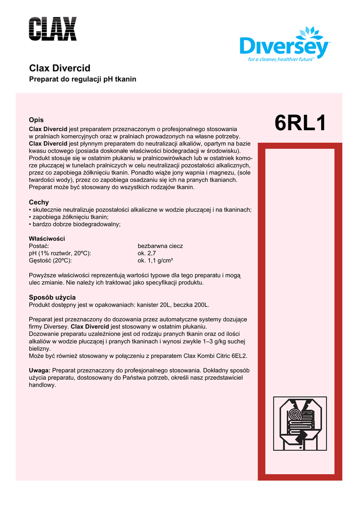 Clax Divercid Preparat do regulacji pH tkanin Opis Clax Divercid jest preparatem przeznaczonym o profesjonalnego stosowania w pralniach komercyjnych oraz w pralniach prowadzonych na własne potrzeby. Clax Divercid jest płynnym preparatem do neutralizacji alkaliów, opartym na bazie kwasu octowego (posiada doskonałe właściwości biodegradacji w środowisku). Produkt stosuje się w ostatnim płukaniu w pralnicowirówkach lub w ostatniek komorze płuczącej w tunelach pralniczych w celu neutralizacji pozostałości alkalicznych, przez co zapobiega żółknięciu tkanin. Ponadto wiąże jony wapnia i magnezu, (sole twardości wody), przez co zapobiega osadzaniu się ich na pranych tkanianch. Preparat może być stosowany do wszystkich rodzajów tkanin. Cechy • skutecznie neutralizuje pozostałości alkaliczne w wodzie płuczącej i na tkaninach; • zapobiega żółknięciu tkanin; • bardzo dobrze biodegradowalny; Właściwości Postać: pH (1% roztwór, 20ºC): Gęstość (20ºC): bezbarwna ciecz ok. 2,7 ok. 1,1 g/cm³ Powyższe właściwości reprezentują wartości typowe dla tego preparatu i mogą ulec zmianie. Nie należy ich traktować jako specyfikacji produktu. Sposób użycia Produkt dostępny jest w opakowaniach: kanister 20L, beczka 200L. Preparat jest przeznaczony do dozowania przez automatyczne systemy dozujące firmy Diversey. Clax Divercid jest stosowany w ostatnim płukaniu. Dozowanie preparatu uzależnione jest od rodzaju pranych tkanin oraz od ilości alkaliów w wodzie płuczącej i pranych tkaninach i wynosi zwykle 1–3 g/kg suchej bielizny. Może być również stosowany w połączeniu z preparatem Clax Kombi Citric 6EL2. Uwaga: Preparat przeznaczony do profesjonalnego stosowania. Dokładny sposób użycia preparatu, dostosowany do Państwa potrzeb, określi nasz przedstawiciel handlowy. 6RL1 Clax Divercid Postępowanie z odpadami Zapobiegać przedostawaniu się nierozcieńczonego produktu do ścieków, wód powierzchniowych i wód gruntowych. Produkt zużyć w całości. Niewielkie ilości niewykorzystanego produktu rozcieńczyć wodą do stężenia najwyżej 1%, odprowadzić do kanalizacji. Większe ilości przekazywać do utylizacji specjalistycznej firmie. Opróżnione opakowania przepłukać dwukrotnie wodą i przeznaczyć do recyklingu. Warunki przechowywania Produkt przechowywać wyłącznie w oryginalnych, szczelnie zamkniętych i właściwie oznakowanych opakowaniach, w suchych i odpowiednio wentylowanych pomieszczeniach. Nie przechowywać poniżej 5ºC i w wysokich temperaturach. Przechowywać z dala od źródeł ciepła, nie wystawiać na bezpośrednie działanie promieni słonecznych. Okres trwałości 24 miesiące od daty produkcji (na opakowaniu). Środki ostrożności Dodatkowe informacje odnośnie środków ostrożności wymaganych przy pracy z preparatem Clax Divercid, ubocznych skutków stosowania, zasad udzielania pierwszej pomocy, bezpiecznego postępowania z odpadami produktu i opakowaniem znajdują się w karcie charakterystyki. Diversey Polska Sp. z o.o. ul. Fabryczna 5 00-446 Warszawa Tel.: 22 328 10 00 Fax: 22 328 10 01 www.diversey.com © Copyright 2011 Diversey 2