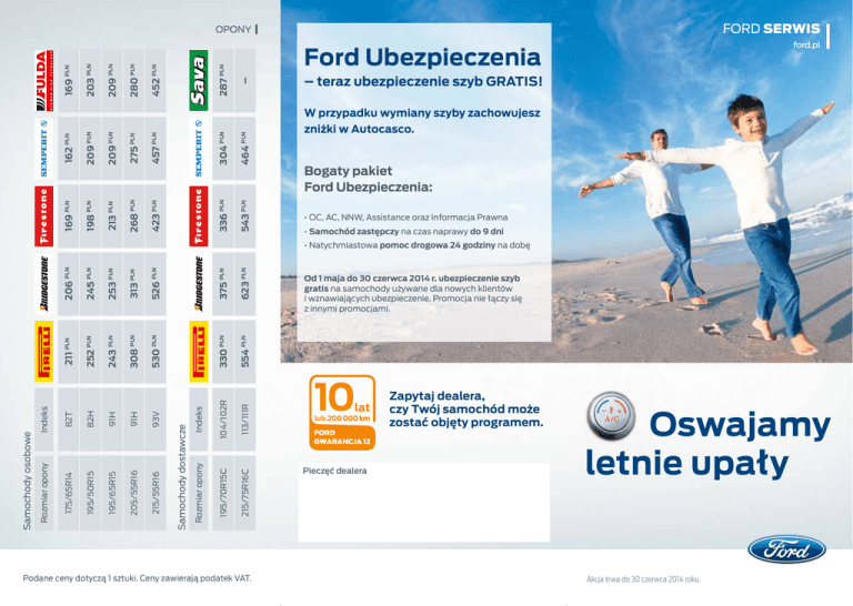 FORD SERWIS Ford Ubezpieczenia – 287 PLN 452 PLN 280 PLN 209 PLN 203 PLN 169 PLN OPONY ford.pl – teraz ubezpieczenie szyb GRATIS! 162 PLN 209 PLN 209 PLN 275 PLN 457 PLN 304 PLN 464 PLN 169 PLN 198 PLN 213 PLN 268 PLN 423 PLN 336 PLN 543 PLN W przypadku wymiany szyby zachowujesz zniżki w Autocasco. Bogaty pakiet Ford Ubezpieczenia: • OC, AC, NNW, Assistance oraz Informacja Prawna • Samochód zastępczy na czas naprawy do 9 dni 623 PLN 554 PLN Od 1 maja do 30 czerwca 2014 r. ubezpieczenie szyb gratis na samochody używane dla nowych klientów i wznawiających ubezpieczenie. Promocja nie łączy się z innymi promocjami. Zapytaj dealera, czy Twój samochód może zostać objęty programem. 215/75R16C 113/111R 375 PLN 330 PLN 104/102R 195/70R15C Indeks Rozmiar opony Samochody dostawcze 526 PLN 530 PLN 215/55R16 93V 313 PLN 308 PLN 205/55R16 91H 253 PLN 243 PLN 195/65R15 91H 245 PLN 252 PLN 195/50R15 82H 206 PLN 211 PLN 82T 175/65R14 Indeks Rozmiar opony Samochody osobowe • Natychmiastowa pomoc drogowa 24 godziny na dobę Podane ceny dotyczą 1 sztuki. Ceny zawierają podatek VAT. Pieczęć dealera Oswajamy letnie upały Akcja trwa do 30 czerwca 2014 roku. KONTROLA I DEZYNFEKCJA UKŁADU KLIMATYZACJI • sprawdzenie działania wszystkich podzespołów układu • oględziny układu pod względem wycieków i uszkodzeń • kontrola szczelności za pomocą promieni ultrafioletowych • próba wydajności układu – pomiar temperatur wewnątrz pojazdu 99PLN • czyszczenie i dezynfekcja układu klimatyzacji za jedyne Układ klimatyzacji a komfort podróżowania i dbałość o zdrowie • Od układu klimatyzacji w Twoim Fordzie zależy utrzymanie komfortowej temperatury wewnątrz pojazdu podczas upałów. • Ułatwia on także usuwanie pary z szyb pojazdu. • Pomaga ograniczyć występowanie dolegliwości alergicznych (spowodowanych rozwojem drobnoustrojów). Należy pamiętać, że ze względu na swoją konstrukcję i specyfikę działania układ ten jest doskonałym środowiskiem do rozwoju grzybów i pleśni, które u wielu osób powodują reakcje alergiczne: kaszel, katar, łzawienie oczu. Dlatego też, aby układ klimatyzacji mógł sprostać wszystkim powyższym zadaniom, musi być poddawany regularnym przeglądom i dezynfekcji w profesjonalnym serwisie. Filtry powietrza Stan i jakość filtrów powietrza przestrzeni pasażerskiej ma niezwykłe znaczenie zwłaszcza dla osób cierpiących na różne rodzaje alergii. Wychwytują z powietrza wywołujący alergie mikropył. Zapobiegają również występowaniu w samochodzie wszelkiego rodzaju kurzu, sadzy, bakterii i wirusów. W związku z rosnącym zanieczyszczeniem powietrza atmosferycznego filtry kabinowe filtrujące powietrze szybko się zużywają, wpływając tym samym na działanie całego układu klimatyzacji. Dlatego tak ważne jest, aby regularnie je wymieniać. Oryginalne filtry kabinowe Ford: • poddawane są regularnym testom • wysoka jakość wykonania • 100% skuteczności usuwania cząstek stałych • idealnie dopasowane do każdego modelu Forda FILTR PRZECIWPYŁKOWY Z WYMIANĄ Jak prawidłowo korzystać z klimatyzacji? • przy skorzystaniu z usługi sprawdzenia i dezynfekcji układu klimatyzacji wymiana filtra przeciwpyłkowego • nie przesadź z bezpośrednim działaniem chłodnego powietrza na twarz i ciało – łatwo wówczas o przeziębienie za jedyne 70PLN Aby w pełni korzystać z dobrodziejstw klimatyzacji, stosuj kilka prostych zasad: • wysoka efektywność pracy • bezpieczeństwo dla osób cierpiących na różne rodzaje alergii • wyższa jakość w porównaniu z podobnymi produktami konkurencji Gazy Cząstki stałe • przy największych upałach dysze nawiewu, skierowane na szybę, otwieraj maksymalnie • temperatura w aucie powinna być niższa od temperatury na zewnątrz nie więcej niż ok. 4°C • na długich trasach, pod koniec jazdy zmniejsz różnicę temperatur wew./zew. – otwierając okno chwilę przed planowanym postojem Filtr wstępny Warstwa węgla aktywnego Warstwa mikrofibry Warstwa osłonowa