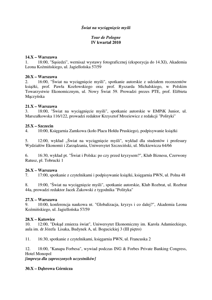 Świat na wyciągnięcie myśli Tour de Pologne IV kwartał 2010 14.X – Warszawa 1. 18:00, "Sąsiedzi", wernisaż wystawy fotograficznej (ekspozycja do 14.XI), Akademia Leona Koźmińskiego, ul. Jagiellońska 57/59 20.X – Warszawa 2. 16:00, "Świat na wyciągnięcie myśli", spotkanie autorskie z udziałem recenzentów książki, prof. Pawła Kozłowskiego oraz prof. Ryszarda Michalskiego, w Polskim Towarzystwie Ekonomicznym, ul. Nowy Świat 59. Prowadzi prezes PTE, prof. Elżbieta Mączyńska 21.X – Warszawa 3. 18:00, "Świat na wyciągnięcie myśli", spotkanie autorskie w EMPiK Junior, ul. Marszałkowska 116/122, prowadzi redaktor Krzysztof Mroziewicz z redakcji "Polityki" 25.X – Szczecin 4. 10:00, Księgarnia Zamkowa (koło Placu Hołdu Pruskiego), podpisywanie książki 5. 12:00, wykład „Świat na wyciągnięcie myśli", wykład dla studentów i profesury Wydziałów Ekonomii i Zarządzania, Uniwersytet Szczeciński, ul. Mickiewicza 64/66 6. 16:30, wykład pt. "Świat i Polska: po czy przed kryzysem?", Klub Biznesu, Czerwony Ratusz, pl. Tobrucki 1 26.X – Warszawa 7. 17:00, spotkanie z czytelnikami i podpisywanie książki, księgarnia PWN, ul. Polna 48 8. 19:00, "Świat na wyciągnięcie myśli", spotkanie autorskie, Klub Rozbrat, ul. Rozbrat 44a, prowadzi redaktor Jacek Żakowski z tygodnika "Polityka" 27.X – Warszawa 9. 10:00, konferencja naukowa nt. "Globalizacja, kryzys i co dalej?", Akademia Leona Koźmińskiego, ul. Jagiellońska 57/59 28.X – Katowice 10. 12:00, "Dokąd zmierza świat", Uniwersytet Ekonomiczny im. Karola Adamieckiego, aula im. dr Józefa Lisaka, Budynek A, ul. Bogucickiej 3 (III piętro) 11. 16:30, spotkanie z czytelnikami, księgarnia PWN, ul. Francuska 2 12. 18:00, "Kanapa Forbesa", wywiad podczas ING & Forbes Private Banking Congress, Hotel Monopol [impreza dla zaproszonych uczestników] 30.X – Dąbrowa Górnicza 13. 12:30, spotkanie z młodzieżą i mieszkańcami, Miejska Biblioteka Publiczna, ul. Kościuszki 31.X – Zgorzelec 14. 14:00, spotkanie w ramach cyklu "Różna historia, wspólna przyszłość" organizowane przez Gminę Miejską Zgorzelec i Muzeum Łużyckie oraz wykład pt. "Dokąd zmierza świat i Polska", Miejski Dom Kultury, ul. Parkowa 1 4.XI – Warszawa 15. 18:00, Szkoła Główna Handlowa, wykład pt. "Po czy przed kryzysem?", sala 2A, gmach "C", al. Niepodległości 128 (róg Madalińskiego) 6.XI – Warszawa 16. 9:00, "Globalizacja, transformacja, rozwój", wykład dla słuchaczy programu MBA Instytutu Nauk Ekonomicznych Polskiej Akademii Nauk, Pałac Staszica [impreza dla zaproszonych uczestników] 8.XI – Bydgoszcz 17. 11:00, wykład pt. "Świat na wyciągnięcie myśli", Dom Ekonomisty, ul. Długa 34 18. 14:00, wykład "Świat na wyciągnięcie myśli", Wyższa Szkoła Gospodarki, ul. Garbary 2 9.XI – Poznań 19. 11:00, "Dokąd zmierza świat i Polska", wykład na Uniwersytecie Ekonomicznym, al. Niepodległości 10, sala amfiteatralna 20. 13:30, "Dokąd zmierza świat i Polska", Wykład Otwarty, Uniwersytet Adama Mickiewicza, ul. Wieniawskiego 1, sala Lubrańskiego 15.XI – Łódź 21. 10:00, "Globalizacja, kryzys – i co dalej?", Politechnika Łódzka, Wydział Organizacji i Zarządzania, Aula Szklana, ul. Piotrkowska 266 22. 13:00, "Polska i świat: po czy przed kryzysem?", spotkanie ze środowiskiem łódzkiego biznesu, Klub Wytwórnia, ul. Łąkowa 29 [impreza dla zaproszonych uczestników] 23. 17:00, spotkanie z czytelnikami i podpisywanie książki, księgarnia PWN, ul. Więckowskiego 13 16.XI – Sopot 24. 10:00, "Świat na wyciągnięcie myśli", Wydział Ekonomiczny Uniwersytetu Gdańskiego, Sopot, ul. Armii Krajowej 119/121 16.XI – Tczew 25. 17:30, "Świat na wyciągnięcie myśli", spotkanie z czytelnikami, Miejska Biblioteka Publiczna im. Aleksandra Skulteta, ul. J. Dąbrowskiego 6 23.XI – Kraków 2 26. 11:00, wykład pt. „Świat i Polska: przed czy po kryzysie?”, Uniwersytet Ekonomiczny w Krakowie, ul. Rakowicka 27, stara aula 27. 14:00, "Dokąd zmierza świat i Polska", Uniwersytet Jagielloński, Wydział Zarządzania i Komunikacji Społecznej, ul. prof. Stanisława Łojasiewicza 4, sala 0.102 28. 17:30, "Sąsiedzi", wernisaż wystawy fotograficznej (ekspozycja do 27.XII), Wojewódzka Biblioteka Publiczna, ul. Rajska 1 24.XI – Warszawa 29. 10:00, "Zanim nadejdzie Jeszcze Większy Kryzys", wykład inauguracyjny na konferencji "Raport o zarządzaniu. Lekcje z kryzysu", Akademia Leona Koźmińskiego i Komitet Nauk Organizacji i Zarządzania PAN, Akademia Leona Koźmińskiego, ul. Jagiellońska 57/59 2.XII – Wrocław 30. 12:00, "Świat na wyciągnięcie myśli", Uniwersytet Ekonomiczny we Wrocławiu, ul Komandorska 118/120, sala P1 31. 16:30, "Wędrujący świat. Postscriptum", Instytut Problemów Ossolineum, sala nr 7 (Refektarz), wejście od ul. Grodzkiej 10/11 Europejskich, 4.XII – Warszawa 32. 10:00, wykład "Świat na wyciągnięcie myśli", Akademia Młodych Dyplomatów, Hotel Polonia, al. Jerozolimskie 6.XII – Warszawa 33. 17:00, wykład "Kryzys – i co dalej", Ogólnopolskie Porozumienie Związków Zawodowych, ul. Kopernika 36/40 7.XII – Kielce 34. 11:00, "Świat i Polska: po czy przed kryzysem?", wykład inauguracyjny na Międzynarodowym Kongresie pt. "Globalna gospodarka w warunkach kryzysu światowego", Wyższa Szkoła Umiejętności, Wydział Nauk Ekonomicznych, ul. Olszewskiego 6 8.XII – Warszawa 35. 13:00, "Dokąd zmierza świat? W poszukiwaniu nowego paradygmatu ekonomii", wykład na posiedzeniu Rady Naukowej Polskiego Towarzystwa Ekonomicznego, ul. Nowy Świat 59 9.XII – Olsztyn 36. 12:00, wykład "Dokąd zmierza świat i Polska", Uniwersytet Warmińsko-Mazurski, Kortowo-1, ul. Oczapowskiego 5, Sala im. Profesora Gotowca 37. 17:00, spotkanie z czytelnikami i podpisywanie książki, Kawiarnia Literacka Książnicy Polskiej, Plac Jana Pawła II 2/3 11.XII – Warszawa 3 38. 12:00, wykład "Polska gospodarka – czy już po kryzysie?", Towarzystwo Inicjatyw Społe