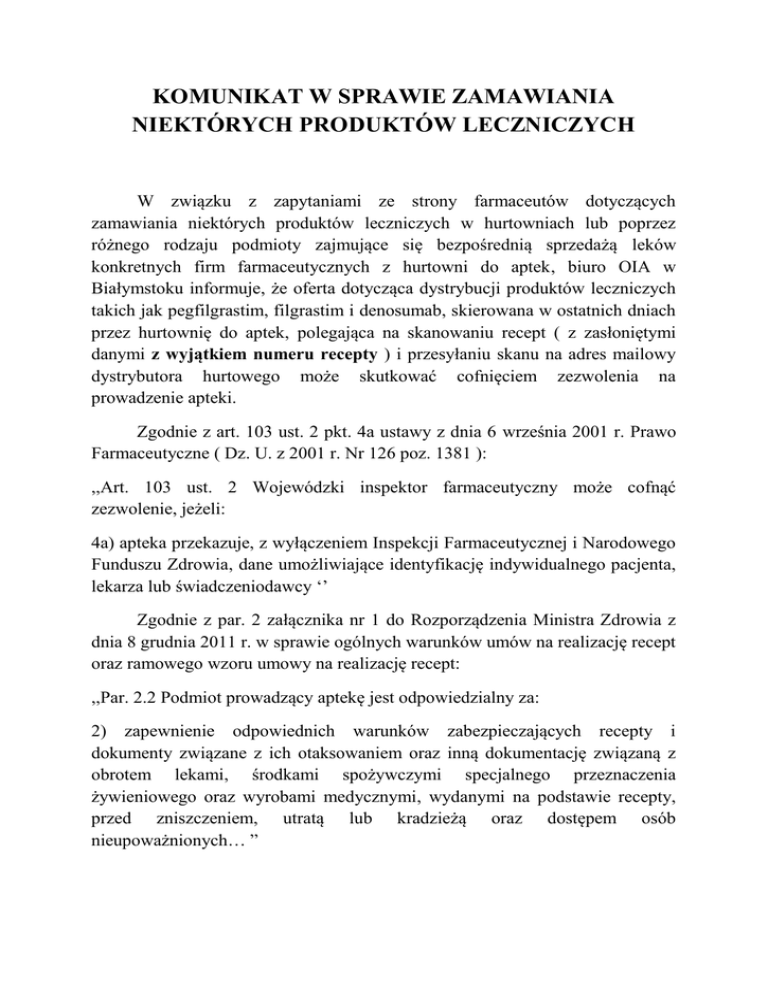 KOMUNIKAT W SPRAWIE ZAMAWIANIA NIEKTÓRYCH PRODUKTÓW LECZNICZYCH W związku z zapytaniami ze strony farmaceutów dotyczących zamawiania niektórych produktów leczniczych w hurtowniach lub poprzez różnego rodzaju podmioty zajmujące się bezpośrednią sprzedażą leków konkretnych firm farmaceutycznych z hurtowni do aptek, biuro OIA w Białymstoku informuje, że oferta dotycząca dystrybucji produktów leczniczych takich jak pegfilgrastim, filgrastim i denosumab, skierowana w ostatnich dniach przez hurtownię do aptek, polegająca na skanowaniu recept ( z zasłoniętymi danymi z wyjątkiem numeru recepty ) i przesyłaniu skanu na adres mailowy dystrybutora hurtowego może skutkować cofnięciem zezwolenia na prowadzenie apteki. Zgodnie z art. 103 ust. 2 pkt. 4a ustawy z dnia 6 września 2001 r. Prawo Farmaceutyczne ( Dz. U. z 2001 r. Nr 126 poz. 1381 ): ,,Art. 103 ust. 2 Wojewódzki inspektor farmaceutyczny może cofnąć zezwolenie, jeżeli: 4a) apteka przekazuje, z wyłączeniem Inspekcji Farmaceutycznej i Narodowego Funduszu Zdrowia, dane umożliwiające identyfikację indywidualnego pacjenta, lekarza lub świadczeniodawcy ‘’ Zgodnie z par. 2 załącznika nr 1 do Rozporządzenia Ministra Zdrowia z dnia 8 grudnia 2011 r. w sprawie ogólnych warunków umów na realizację recept oraz ramowego wzoru umowy na realizację recept: ,,Par. 2.2 Podmiot prowadzący aptekę jest odpowiedzialny za: 2) zapewnienie odpowiednich warunków zabezpieczających recepty i dokumenty związane z ich otaksowaniem oraz inną dokumentację związaną z obrotem lekami, środkami spożywczymi specjalnego przeznaczenia żywieniowego oraz wyrobami medycznymi, wydanymi na podstawie recepty, przed zniszczeniem, utratą lub kradzieżą oraz dostępem osób nieupoważnionych… ” Zgodnie z par. 9 ust. 3 Rozporządzenia Ministra Zdrowia z dnia 8 marca 2012 r. w sprawie recept lekarskich: ,, Oddział Wojewódzki Funduszu na wniosek osoby uprawnionej albo świadczeniodawcy, o którym mowa w par. 3 ust. 1 pkt. 1 przydziela im zakresy liczb, będące unikalnymi numerami identyfikującymi recepty. Świadczeniodawca przydziela wykonującym u niego zawód osobom uprawnionym, o których mowa w art. 2 pkt. 14 lit. a ustawy o refundacji, zakresy liczb będących unikalnymi numerami identyfikującymi recepty. ” Zgodnie z powyższymi przepisami: 1. Unikalny numer recepty w sposób jednoznaczny i bezpośrednio identyfikuje osobę uprawnioną do wystawienia recepty, a pośrednio identyfikuje świadczeniodawcę, jeżeli jest to inny podmiot niż osoba uprawniona. 2. Podmiotami uprawnionymi do zbierania danych identyfikujących lekarza, świadczeniodawcę lub pacjenta są: Inspekcja Farmaceutyczna i Narodowy Fundusz Zdrowia. Zatem wszelkie działania aptek dotyczące zamawiania produktów leczniczych, wbrew cytowanym i obowiązującym przepisom prawa w tym zakresie są nielegalne. Narażają też apteki ze strony NFZ na nałożenie kary umownej wynikającej z umowy na refundację leków a nawet zerwanie tej umowy. Biuro OIA w Białymstoku