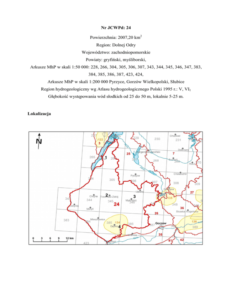 Nr JCWPd: 24 Powierzchnia: 2007,20 km2 Region: Dolnej Odry Województwo: zachodniopomorskie Powiaty: gryfiński, myśliborski, Arkusze MhP w skali 1:50 000: 228, 266, 304, 305, 306, 307, 343, 344, 345, 346, 347, 383, 384, 385, 386, 387, 423, 424, Arkusze MhP w skali 1:200 000 Pyrzyce, Gorzów Wielkopolski, Słubice Region hydrogeologiczny wg Atlasu hydrogeologicznego Polski 1995 r.: V, VI1 Głębokość występowania wód słodkich od 25 do 50 m, lokalnie 5-25 m. Lokalizacja Profile SYMBOL całej JCWPd uwzględniający wszystkie profile: Q(1-3) , (Q-M), (M1-2), (MZ), (Cr3Z) Opis symbolu: W czwartorzędowym piętrze wodonośnym występuje od jednego do trzech poziomów wodonośnych. Lokalnie pod osadami czwartorzędu występuje piętro wodonośne mioceńskie z jednym lub dwoma poziomami, niekiedy pozostającymi w łączności z poziomami wodonośnymi czwartorzędowymi. Poziomy mioceńskie wykazują lokalnie słabe zasolenie ascensyjne. W NW części obszaru w kredowych utworach węglanowych występują zasolone wody szczelinowe. Q, M - wody porowe w utworach piaszczystych Cr3 – wody szczelinowe w utworach węglanowych Cecha szczególna JCWPd (ilościowa, chemiczna): wykorzystanie zasobów dyspozycyjnych 3,7 %, wody w poziomach mioceńskich lokalnie zagroŜone zasoleniem ascensyjnym. Wody piętra kredowego występujące w szczelinowych utworach węglanowych lokalnie są zasolone. GZWP występujące w obrębie JCWPd (symbol i numer): QM,Tr 134, 135