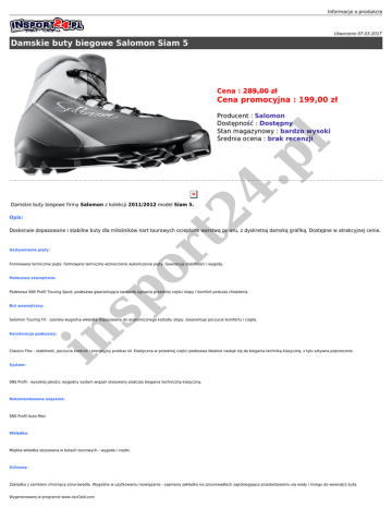 Informacje o produkcie Utworzono 07-03-2017 Damskie buty biegowe Salomon Siam 5 Cena : 289,00 zł Cena promocyjna : 199,00 zł Opis: sp or t2 Damskie buty biegowe firmy Salomon z kolekcji 2011/2012 model Siam 5. 4. p l Producent : Salomon Dostępność : Dostępny Stan magazynowy : bardzo wysoki Średnia ocena : brak recenzji Doskonale dopasowane i stabilne buty dla miłośników nart tourowych ocieplone warstwą polaru, z dyskretną damską grafiką. Dostępne w atrakcyjnej cenie. Usztywnienie pięty: Formowana termicznie pięta formowane termiczne wzmocnione wykończenie pięty. Gwarancja stabilnośći i wygody. Podeszwa zewnętrzna: Podeszwa SNS Profil Touring Sport, podeszwa gwarantująca swobodę zginania przedniej części stopy i komfort podczas chodzenia. But wewnętrzny: in Salomon Touring Fit - szeroka wygodna wkładka dopasowana do anatomicznego kształtu stopy. Gwarantuje poczucie komfortu i ciepła. Konstrukcja podeszwy: Classics Flex - stabilność, poczucie kontroli i precyzyjny przekaz sił. Elastyczna w przedniej części podeszwa idealnie nadaje się do biegania techniką klasyczną, z tyłu sztywna poprzecznie. System: SNS Profil - wysokiej jakości, wygodny system wiązań stosowany podczas biegania techniczną klasyczną. Rekomendowane wiązania: SNS Profil Auto Men Wkładka: Miękka wkładka stosowana w butach tourowych - wygoda i ciepło. Ochrona: Zakladka z zamkiem chroniąca sznurowadła. Wygodne w użytkowaniu rozwiązanie - zapinana zakładka na sznurowadłach zapobiegająca przedostawaniu się wody i śniegu do wewnątrz buta. Wygenerowano w programie www.oscGold.com Rozwiązania stosowane w damskich butach: Salomon Touring Women fit - szeroka, wygodna wkładka dopasowana do anatomicznego kształtu damskiej stopy. Jest węższa w okolicy pięty i łatwiejsza w zakladaniu. Wkładka wykończona polarem - wygodne pwykończenie z polaru stosowane we wkładkach. Stanowi dodatkową warstwę izolacyjną , jest bardzo miękkie i wygodne. Damska rozmiarówka Salomon: FR 5 3.5 22 36 5.5 4 22.5 36 2/3 6 4.5 23 37 1/3 6.5 5 23.5 38 7 5.5 24 38 2/3 7.5 6 24.5 39 1/3 8 6.5 25 40 8.5 7 25.5 40 2/3 9 7.5 26 41 1/3 9.5 8 26.5 42 10 8.5 27 42 2/3 10.5 9 27.5 43 1/3 DE 4 5 l JP 6 7 8 9 4. p UK sp or t2 US Dostępne opcje Damskie buty biegowe Salomon Siam 5 in rozmiar nogi: 38 2/3, 40 2/3.