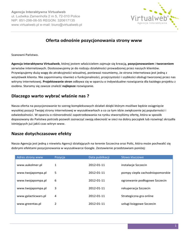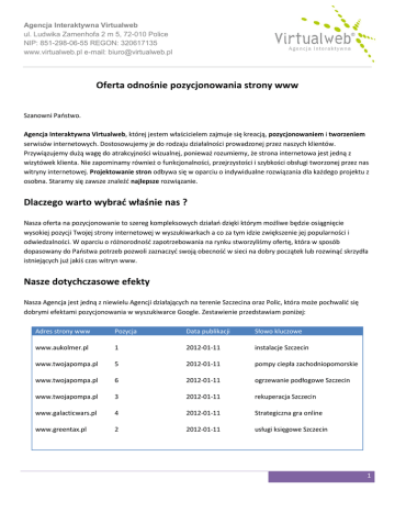 Agencja Interaktywna Virtualweb ul. Ludwika Zamenhofa 2 m 5, 72-010 Police NIP: 851-298-06-55 REGON: 320617135 www.virtualweb.pl e-mail: [email protected] Oferta odnośnie pozycjonowania strony www Szanowni Paostwo. Agencja Interaktywna Virtualweb, której jestem właścicielem zajmuje się kreacją, pozycjonowaniem i tworzeniem serwisów internetowych. Dostosowujemy je do rodzaju działalności prowadzonej przez naszych klientów. Przywiązujemy dużą wagę do atrakcyjności wizualnej, ponieważ rozumiemy, że strona internetowa jest jedną z wizytówek klienta. Nie zapominamy również o funkcjonalności, przejrzystości i szybkości obsługi tworzonej przez nas witryny internetowej. Projektowanie stron odbywa się w oparciu o indywidualne rozwiązania dla każdego projektu z osobna. Staramy się zawsze znaleźd najlepsze rozwiązanie. Dlaczego warto wybrad właśnie nas ? Nasza oferta na pozycjonowanie to szereg kompleksowych działao dzięki którym możliwe będzie osiągnięcie wysokiej pozycji Twojej strony internetowej w wyszukiwarkach a co za tym idzie zwiększenie jej popularności i odwiedzalności. W oparciu o różnorodnośd zapotrzebowania na rynku stworzyliśmy ofertę, która w sposób dopasowany do Paostwa potrzeb pozwoli zaznaczyd swoją obecnośd w sieci na dobry początek lub rozwinąd skrzydła istniejących już jakiś czas witryn www. Nasze dotychczasowe efekty Nasza Agencja jest jedną z niewielu Agencji działających na terenie Szczecina oraz Polic, która może pochwalid się dobrymi efektami pozycjonowania w wyszukiwarce Google. Zestawienie przedstawiam poniżej: Adres strony www Pozycja Data publikacji Słowo kluczowe www.aukolmer.pl 1 2012-01-11 instalacje Szczecin www.twojapompa.pl 5 2012-01-11 pompy ciepła zachodniopomorskie www.twojapompa.pl 6 2012-01-11 ogrzewanie podłogowe Szczecin www.twojapompa.pl 3 2012-01-11 rekuperacja Szczecin www.galacticwars.pl 4 2012-01-11 Strategiczna gra online www.greentax.pl 2 2012-01-11 usługi księgowe Szczecin 1 Agencja Interaktywna Virtualweb ul. Ludwika Zamenhofa 2 m 5, 72-010 Police NIP: 851-298-06-55 REGON: 320617135 www.virtualweb.pl e-mail: [email protected] Warto zauważyd, że wszystkie pozycjonowane przez nas strony, klasyfikują się na pierwszej stronie w wynikach wyszukiwao. Jesteśmy firmą, która zajmuje się marketingiem internetowym od stycznia 2009 roku. Mamy już duże sukcesy w tej branży, a nasi klienci to grupa w 100% usatysfakcjonowanych kontrahentów. Jak naliczamy opłaty za usługę pozycjonowania ? W odróżnieniu od naszej konkurencji, my pobieramy opłaty tylko i wyłącznie za miejsca w pierwszej dziesiątce wyników wyszukiwania. Załóżmy, że podpisujemy umowę na pozycjonowanie strony 20 dnia któregoś miesiąca, wówczas pozycjonowanie rusza 21 dnia tego miesiąca, czyli dzieo po podpisaniu umowy. Ten dzieo moi pracownicy mają na ustawienia i optymalizację Paostwa strony pod wybranymi słowami kluczowymi. Jeżeli np. 21 dnia któregoś miesiąca strona pod słowem kluczowym "xxx " zajmie 5 pozycję cena za dzieo promocji wynosi załóżmy 5,00 zł. Jeżeli 22 dnia któregoś miesiąca strona zajmie 3 pozycję pod tym samym słowem kluczowym cena wynosi załóżmy 6,00 zł. Jeżeli 23 dnia któregoś miesiąca strona spadnie np. na 12 pozycję, wtedy cena wynosi 0 zł. Klient płaci tylko za efekty (pierwsza strona wyników wyszukiwania). Jeżeli strony pod danym słowem kluczowym nie ma na pierwszej stronie w wynikach wyszukiwania w danym dniu, koszt wynosi 0 zł. Rozliczeo dokonujemy co 30 dni (miesiąc kalendarzowy – nazywany jednym okresem rozliczeniowym) sumując ceny za poszczególne słowa kluczowe w poszczególne dni (np. od 1 stycznia do 31 stycznia - faktura jest wystawiana 31 stycznia z tygodniowym terminem płatności). Faktura jest wystawiana i przesyłana drogą elektroniczną lub tradycyjną Pocztą niezależnie od dnia tygodnia (soboty, niedziele, dni świąteczne). Po podpisaniu umowy otrzymają Paostwo również dostęp do specjalnego panelu użytkownika, w którym będziecie Paostwo mogli monitorowad na bieżąco jakie pozycje w danym dniu zajmuje Paoska strona, z dostępem do archiwum wpisów. Jest to gwarancja tego, że ja Paostwa nie oszukam. Od czego zależy cena danej frazy/słowa kluczowego ? Cena pozycjonowania zależy od konkurencyjności danego słowa kluczowego w wynikach wyszukiwania, od zajętej pozycji oraz od wieku domeny internetowej. Im słowo kluczowe ma większa konkurencyjnośd w wynikach wyszukiwania tym cena jest wyższa. Im domena starsza, tym cena niższa. Im pozycja strony wyższa tym cena rośnie. 2 Agencja Interaktywna Virtualweb ul. Ludwika Zamenhofa 2 m 5, 72-010 Police NIP: 851-298-06-55 REGON: 320617135 www.virtualweb.pl e-mail: [email protected] Dane teleadresowe Odsyłam na naszą stronę internetową gdzie zasięgną Paostwo więcej informacji o naszej firmie: strona Agencji: http://www.virtualweb.pl nasza oferta: http://www.virtualweb.pl/oferta.html opinie naszych klientów: http://virtualweb.pl/opinie.html referencje naszych kontrahentów: http://virtualweb.pl/kontrahenci.html Kontakt + formularz: http://virtualweb.pl/kontakt.html Telefon: 508 494 308 E-mail: [email protected] Gadu-Gadu: 6495448 Z poważaniem. Łukasz Rubacki. 3