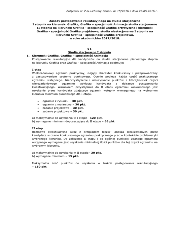Załącznik nr 7 do Uchwały Senatu nr 15/2016 z dnia 25.05.2016 r. Zasady postępowania rekrutacyjnego na studia stacjonarne I stopnia na kierunek: Grafika, Grafika – specjalność Animacja studia stacjonarne II stopnia na kierunek: Grafika - specjalność Grafika artystyczna i kierunek: Grafika - specjalność Grafika projektowa, studia niestacjonarne I stopnia na kierunek: Grafika - specjalność Grafika projektowa, w roku akademickim 2017/2018. §1 Studia stacjonarne I stopnia 1. Kierunek: Grafika, Grafika – specjalność Animacja Postępowanie rekrutacyjne dla kandydatów na studia stacjonarne pierwszego stopnia na kierunku Grafika oraz Grafika – specjalność Animacja obejmuje: I etap Wielozadaniowy egzamin praktyczny, mający charakter konkursowy i przeprowadzany z zastosowaniem systemu punktowego. Ocenie podlega każda część praktycznego egzaminu wstępnego. Nieprzystąpienie i nieuzyskanie punktów z którejkolwiek części wielozadaniowego egzaminu wyklucza kandydata z dalszego postępowania kwalifikacyjnego. Warunkiem przystąpienia do II etapu egzaminu konkursowego jest uzyskanie przez kandydata zdającego egzamin wstępny wymaganego na wybranym kierunku minimum punktowego dla I etapu. egzamin z rysunku – 30 pkt. egzamin z malarstwa – 30 pkt. zadanie projektowe – 30 pkt. zadanie projektowe – 30 pkt. a) maksymalnie do uzyskania w I etapie - 120 pkt. b) wymagane minimum dopuszczające do II etapu – 65 pkt. II etap Rozmowa kwalifikacyjna wraz z przeglądem teczki– analiza zrealizowanych przez kandydata w czasie konkursowego egzaminu praktycznego prac w kontekście problematyki wybranego kierunku. Do zaliczenia II etapu i do ogólnej punktacji zdanego egzaminu wstępnego wymagane jest uzyskanie minimalnej ilości punktów dla tej części egzaminu na wybranym kierunku. a) maksymalnie do uzyskania w II etapie - 30 pkt. b) wymagane minimum – 15 pkt. Maksymalna – 150 pkt. ilość punktów do uzyskania w trakcie postępowania rekrutacyjnego Załącznik nr 7 do Uchwały Senatu nr 15/2016 z dnia 25.05.2016 r. §2 Studia stacjonarne II stopnia 1. Kierunek: Grafika Postępowanie rekrutacyjne na studia drugiego stopnia na kierunku Grafika, w związku ze zmianą wprowadzenia oddzielnej rekrutacji na specjalność grafika artystyczna i specjalność grafika projektowa, obejmuje jeden etap: SPECJALNOŚĆ GRAFIKA ARTYSTYCZNA Rozmowa kwalifikacyjna, przedmiotem której jest przegląd teczki złożonej z prac graficznych, (wybór kandydata spośród technik takich jak: linoryt, serigrafia, litografia, techniki metalowe, techniki cyfrowe), prezentacja dokumentacji pracy licencjackiej – obowiązkowo oryginały prac, opcjonalnie portfolio lub prezentacja CD. a) maksymalnie do uzyskania 50 pkt, wymagane minimum - 25 pkt. b) maksymalna ilość punktów do uzyskania w trakcie postępowania rekrutacyjnego - 50 pkt. SPECJALNOŚĆ GRAFIKA PROJEKTOWA Rozmowa kwalifikacyjna, przedmiotem której jest przegląd teczki złożonej z prac graficznych, (wybór kandydata spośród różnej działalności projektowej takiej jak: plakat, znak, identyfikacja wizualna, liternictwo, ilustracja), prezentacja dokumentacji pracy licencjackiej – obowiązkowo oryginały prac, opcjonalnie portfolio lub prezentacja CD. a) maksymalnie do uzyskania - 50 pkt. b) wymagane minimum - 25 pkt. Maksymalna - 50 pkt. ilość punktów do uzyskania w trakcie postępowania rekrutacyjnego §3 Studia niestacjonarne I stopnia Kierunek: Grafika specjalność – Grafika projektowa Postępowanie rekrutacyjne dla kandydatów na studia niestacjonarne pierwszego stopnia na kierunku Grafika – specjalność Grafika Projektowa obejmuje dwa etapy. I etap Przegląd teczki z pracami plastycznymi kandydata. a) maksymalnie do uzyskania w I etapie - 30 pkt. b) wymagane minimum – 20 pkt. II etap Rozmowę kwalifikacyjną przedmiotem której jest analiza zrealizowanych przez kandydata zadań podanych na stronach internetowych ASP Wydział Grafiki, w kontekście problematyki wybranego kierunku. a) maksymalnie do uzyskania w II etapie - 25 pkt. b) wymagane minimum – 15 pkt. Maksymalna - 55 pkt. ilość punktów do uzyskania w trakcie postępowania rekrutacyjnego