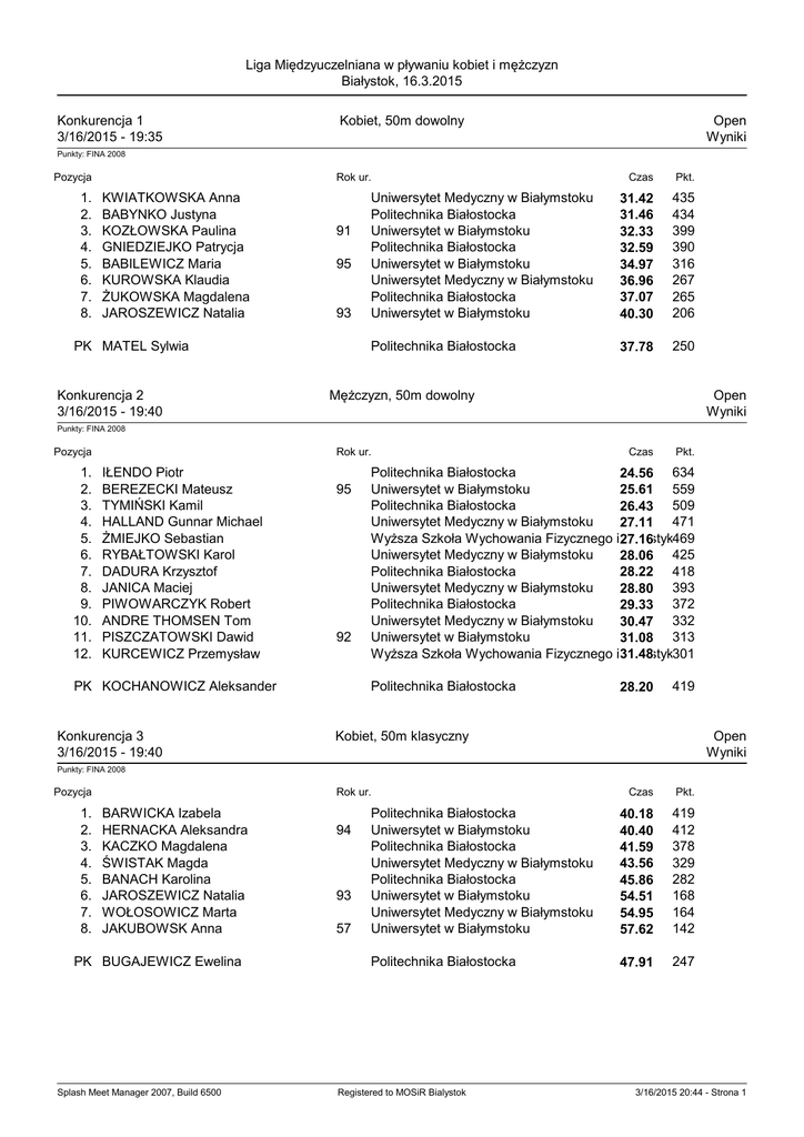 Liga Międzyuczelniana w pływaniu kobiet i mężczyzn Białystok, 16.3.2015 Konkurencja 1 3/16/2015 - 19:35 Kobiet, 50m dowolny Open Wyniki Punkty: FINA 2008 Pozycja 1. 2. 3. 4. 5. 6. 7. 8. Rok ur. KWIATKOWSKA Anna BABYNKO Justyna KOZŁOWSKA Paulina GNIEDZIEJKO Patrycja BABILEWICZ Maria KUROWSKA Klaudia ŻUKOWSKA Magdalena JAROSZEWICZ Natalia 91 95 93 PK MATEL Sylwia Konkurencja 2 3/16/2015 - 19:40 Czas Pkt. Uniwersytet Medyczny w Białymstoku Politechnika Białostocka Uniwersytet w Białymstoku Politechnika Białostocka Uniwersytet w Białymstoku Uniwersytet Medyczny w Białymstoku Politechnika Białostocka Uniwersytet w Białymstoku 31.42 31.46 32.33 32.59 34.97 36.96 37.07 40.30 435 434 399 390 316 267 265 206 Politechnika Białostocka 37.78 250 Mężczyzn, 50m dowolny Open Wyniki Punkty: FINA 2008 Pozycja 1. 2. 3. 4. 5. 6. 7. 8. 9. 10. 11. 12. Rok ur. IŁENDO Piotr BEREZECKI Mateusz TYMIŃSKI Kamil HALLAND Gunnar Michael ŻMIEJKO Sebastian RYBAŁTOWSKI Karol DADURA Krzysztof JANICA Maciej PIWOWARCZYK Robert ANDRE THOMSEN Tom PISZCZATOWSKI Dawid KURCEWICZ Przemysław 95 92 PK KOCHANOWICZ Aleksander Konkurencja 3 3/16/2015 - 19:40 Czas Pkt. Politechnika Białostocka 24.56 634 Uniwersytet w Białymstoku 25.61 559 Politechnika Białostocka 26.43 509 Uniwersytet Medyczny w Białymstoku 27.11 471 Wyższa Szkoła Wychowania Fizycznego i 27.16 Turystyki469 Uniwersytet Medyczny w Białymstoku 28.06 425 Politechnika Białostocka 28.22 418 Uniwersytet Medyczny w Białymstoku 28.80 393 Politechnika Białostocka 29.33 372 Uniwersytet Medyczny w Białymstoku 30.47 332 Uniwersytet w Białymstoku 31.08 313 Wyższa Szkoła Wychowania Fizycznego i 31.48 Turystyki301 Politechnika Białostocka 28.20 419 Kobiet, 50m klasyczny Open Wyniki Punkty: FINA 2008 Pozycja 1. 2. 3. 4. 5. 6. 7. 8. Rok ur. BARWICKA Izabela HERNACKA Aleksandra KACZKO Magdalena ŚWISTAK Magda BANACH Karolina JAROSZEWICZ Natalia WOŁOSOWICZ Marta JAKUBOWSK Anna PK BUGAJEWICZ Ewelina Splash Meet Manager 2007, Build 6500 94 93 57 Czas Pkt. Politechnika Białostocka Uniwersytet w Białymstoku Politechnika Białostocka Uniwersytet Medyczny w Białymstoku Politechnika Białostocka Uniwersytet w Białymstoku Uniwersytet Medyczny w Białymstoku Uniwersytet w Białymstoku 40.18 40.40 41.59 43.56 45.86 54.51 54.95 57.62 419 412 378 329 282 168 164 142 Politechnika Białostocka 47.91 247 Registered to MOSiR Bialystok 3/16/2015 20:44 - Strona 1 Liga Międzyuczelniana w pływaniu kobiet i mężczyzn Białystok, 16.3.2015 Konkurencja 4 3/16/2015 - 19:45 Mężczyzn, 50m klasyczny Open Wyniki Punkty: FINA 2008 Pozycja 1. 2. 3. 4. 5. 6. 7. Rok ur. KLIZA Mateusz PERKOWSKI Rafał KOCHANOWICZ Aleksander PINDEL Daniel BIŁDA Wojciech KELLER Artur ANDRE THOMSEN Tom Konkurencja 5 3/16/2015 - 19:50 Czas Pkt. Politechnika Białostocka 33.27 509 Wyższa Szkoła Wychowania Fizycznego i 34.89 Turystyki441 Politechnika Białostocka 36.18 396 Uniwersytet Medyczny w Białymstoku 37.46 356 Politechnika Białostocka 38.82 320 Uniwersytet Medyczny w Białymstoku 39.40 306 Uniwersytet Medyczny w Białymstoku 40.18 289 Kobiet, 50m motylkowy Open Wyniki Punkty: FINA 2008 Pozycja 1. 2. 3. 4. 5. 6. Rok ur. POPŁAWSKA Justyna WOJSZKO Dominika KWIATKOWSKA Anna KOZŁOWSKA Paulina BARWICKA Izabela GRYCZKA Ewelina Konkurencja 6 3/16/2015 - 19:50 91 91 Politechnika Białostocka Uniwersytet w Białymstoku Uniwersytet Medyczny w Białymstoku Uniwersytet w Białymstoku Politechnika Białostocka Uniwersytet Medyczny w Białymstoku Czas Pkt. 32.68 32.96 35.64 36.42 38.56 40.99 478 466 368 345 291 242 Mężczyzn, 50m motylkowy Open Wyniki Punkty: FINA 2008 Pozycja 1. 2. 3. 4. 5. 6. 7. 8. Rok ur. UŚCIŁKO Michał TYMIŃSKI Kamil KUKLIK Janusz KOWALEWSKI Maciej MILCZUNAS Marcin HALLAND Gunnar Michael KOSESKI Paweł PIWOWARCZYK Robert 78 PK DADURA Krzysztof Konkurencja 7 3/16/2015 - 19:50 Czas Pkt. Politechnika Białostocka 27.06 597 Politechnika Białostocka 28.66 503 Wyższa Szkoła Wychowania Fizycznego i 29.57 Turystyki458 Politechnika Białostocka 29.83 446 Uniwersytet w Białymstoku 30.03 437 Uniwersytet Medyczny w Białymstoku 32.35 350 Wyższa Szkoła Wychowania Fizycznego i 33.37 Turystyki319 Politechnika Białostocka 33.59 312 Politechnika Białostocka 31.28 387 Kobiet, 50m grzbietowy Open Wyniki Punkty: FINA 2008 Pozycja 1. 2. 3. 4. 5. 6. 7. 8. Rok ur. BABYNKO Justyna WOJSZKO Dominika PRZYBYSZEWSKA Katarzyna SZUTKIEWICZ Anna KACZKO Magdalena GRYCZKA Ewelina MATEL Sylwia PIĄTEK Natalia Splash Meet Manager 2007, Build 6500 91 95 Politechnika Białostocka Uniwersytet w Białymstoku Uniwersytet w Białymstoku Uniwersytet Medyczny w Białymstoku Politechnika Białostocka Uniwersytet Medyczny w Białymstoku Politechnika Białostocka Uniwersytet Medyczny w Białymstoku Registered to MOSiR Bialystok Czas Pkt. 34.56 35.06 36.84 37.33 38.91 41.57 45.83 49.12 467 448 386 371 327 269 200 163 3/16/2015 20:44 - Strona 2 Liga Międzyuczelniana w pływaniu kobiet i mężczyzn Białystok, 16.3.2015 Konkurencja 8 3/16/2015 - 19:55 Mężczyzn, 50m grzbietowy Open Wyniki Punkty: FINA 2008 Pozycja 1. 2. 3. 4. 5. 6. 7. Rok ur. UŚCIŁKO Michał WORONOWICZ Paweł KUKLIK Janusz RYBAŁTOWSKI Karol TARASEWICZ Tomasz MATYSIEWICZ Michał MICHAŁOWSKI Piotr 91 Konkurencja 9 3/16/2015 - 20:00 Czas Pkt. Politechnika Białostocka 28.24 573 Politechnika Białostocka 31.17 426 Wyższa Szkoła Wychowania Fizycznego i 31.81 Turystyki401 Uniwersytet Medyczny w Białymstoku 33.65 339 Uniwersytet Medyczny w Białymstoku 35.86 280 Politechnika Białostocka 36.27 271 Uniwersytet w Białymstoku 38.85 220 Kobiet, 100m zmienny Open Wyniki Punkty: FINA 2008 Pozycja 1. 2. 3. 4. 5. Rok ur. POPŁAWSKA Justyna HERNACKA Aleksandra 94 GNIEDZIEJKO Patrycja ŚWISTAK Magda PRZYBYSZEWSKA Katarzyna 95 Czas Pkt. Politechnika Białostocka 1:18.28 Uniwersytet w Białymstoku 1:20.21 Politechnika Białostocka 1:26.95 Uniwersytet Medyczny w Białymstoku1:27.88 Uniwersytet w Białymstoku 1:29.24 445 413 324 314 300 Konkurencja 10 3/16/