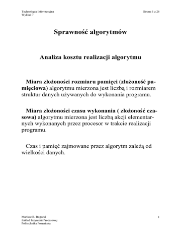 Miara złożoności czasu wykonania ( złożoność czasowa) algorytmu mierzona jest liczbą akcji elementarnych wykonanych przez procesor w trakcie realizacji