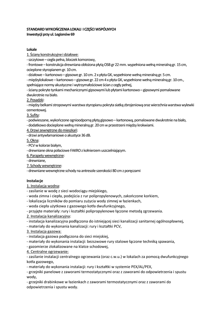 STANDARD WYKOŃCZENIA LOKALI I CZĘŚCI WSPÓLNYCH Inwestycji przy ul. Legionów 69 Lokale 1. Ściany konstrukcyjne i działowe: - szczytowe – cegła pełna, bloczek komorowy, - frontowe – konstrukcja drewniana obłożona płytą OSB gr 22 mm. wypełniona wełną mineralną gr. 15 cm, ocieplone styropianem gr. 10 cm. - działowe – kartonowo – gipsowe gr. 10 cm. 2 x płyta GK, wypełnione wełną mineralną gr. 5 cm. - międzylokalowe – kartonowo – gipsowe gr. 22 cm 4 x płyta GK, wypełnione wełną mineralną gr. 10 cm., spełniające normy akustyczne i wytrzymałościowe ścian z cegły pełnej, - ściany pokryte tynkami mechanicznymi gipsowymi lub płytami kartonowo – gipsowymi pomalowane dwukrotnie na biało. 2. Posadzki: - między belkami stropowymi warstwa styropianu pokryta siatką zbrojeniową oraz wierzchnia warstwa wylewki cementowej. 3. Sufity: - podwieszane, wykończone ognioodporną płytą gipsowo – kartonową, pomalowane dwukrotnie na biało, - dodatkowo docieplone wełną mineralną gr. 20 cm w przestrzeni między krokwiami. 4. Drzwi zewnętrzne do mieszkań: - drzwi antywłamaniowe o akustyce 36 dB. 5. Okna: - PCV w kolorze białym, - drewniane okna połaciowe FAKRO z kołnierzem uszczelniającym. 6. Parapety wewnętrzne: - drewniane, 7. Schody wewnętrzne: - drewniane wewnętrzne schody na antresole szerokości 80 cm z poręczami Instalacje 1. Instalacja wodna: - zasilanie w wodę z sieci wodociągu miejskiego, - woda zimna i ciepła, podejścia z rur polipropylenowych, zakończone korkiem, - lokalizacja liczników do pomiaru zużycia wody zimnej w łazienkach, - woda ciepła użytkowa z gazowego kotła dwufunkcyjnego, - przyjęte materiały: rury i kształtki polipropylenowe łączone metodą zgrzewania. 2. Instalacja kanalizacyjna: - instalacja kanalizacyjna podłączona do istniejącej sieci kanalizacji sanitarnej ogólnospławnej, - materiały do wykonania kanalizacji: rury i kształtki PCV, 3. Instalacja gazowa: - instalacja gazowa podłączona do sieci miejskiej, - materiały do wykonania instalacji: bezszwowe rury stalowe łączone techniką spawania, - gazomierze zlokalizowane na klatce schodowej, 4. Centralne ogrzewanie: - zasilanie instalacji centralnego ogrzewania (oraz c.w.u.) w lokalach za pomocą dwufunkcyjnego kotła gazowego, - materiały do wykonania instalacji: rury i kształtki w systemie PEX/AL/PEX, - grzejniki panelowe z zaworami termostatycznymi oraz z zaworami do odpowietrzenia i spustu wody, - grzejniki drabinkowe w łazienkach z zaworami termostatycznymi oraz z zaworami do odpowietrzenia i spustu wody. 5. Instalacja wentylacji: - wentylacja grawitacyjna. 6. Instalacja elektryczna: - licznik jednofazowy, - możliwość opcji trójfazowej po indywidualnej zmianie warunków z zakładem energetycznym, - umiejscowienie liczników poboru energii w tablicach zlokalizowanych w częściach wspólnych, - wypusty oświetleniowe zakończone kostką, - komplet gniazd i włączników, - tablica mieszkaniowa z zabezpieczeniami obwodów. 7. Instalacja teletechniczna: - instalacja internetowa, - instalacja domofonowa zakończona unifonem, - instalacja RTV, - dzwonek. Budynek 1. Konstrukcja budynku: - istniejąca o konstrukcji tradycyjnej murowanej z cegły pełnej. 2. Stropy: - istniejące stropy międzypiętrowe – drewniane, - nad piwnicami stropy Kleina. 3. Elewacja: - istniejąca – poddana renowacji, - poziom poddasza - ocieplona styropianem gr 10 cm. i otynkowana. 4. Dach: - nowa konstrukcja dachu, poszycie z płyty OSB gr 22 mm, pokryte papą termozgrzewalną, ocieplony wełną mineralną gr. 20 cm. - nowe obróbki blacharskie z blachy ocynkowanej, - nowe orynnowanie z blachy ocynkowanej/ PCV. Części wspólne 1. Ściany: - tynki gipsowe maszynowe, 2. Posadzki: - w korytarzach gres. 3. Balustrady klatki schodowej: - kute. 4. Drzwi wejściowe do budynku: - stalowe 5. Śmietnik: - Osobne wydzielone miejsce na zewnątrz budynku. 6. Okna klatki schodowej - nowe PCV, częściowo uchylne Podwórze - teren zielony, - chodnik wyłożony płytą chodnikową, - nasadzenia, - oświetlenie podwórza, - monitoring.