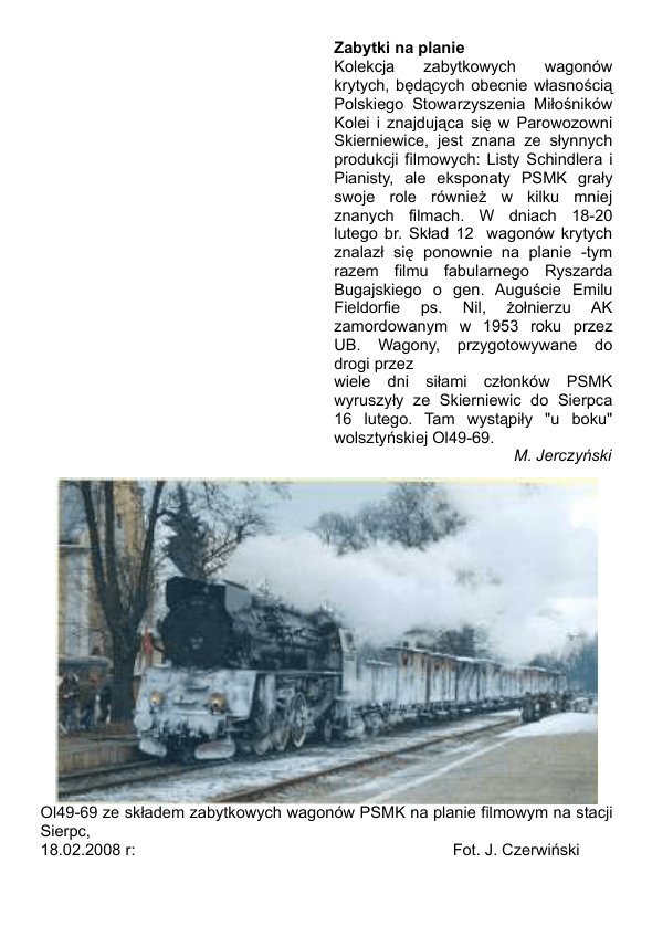 Zabytki na planie Kolekcja zabytkowych wagonów krytych, będących obecnie własnością Polskiego Stowarzyszenia Miłośników Kolei i znajdująca się w Parowozowni Skierniewice, jest znana ze słynnych produkcji filmowych: Listy Schindlera i Pianisty, ale eksponaty PSMK grały swoje role również w kilku mniej znanych filmach. W dniach 18-20 lutego br. Skład 12 wagonów krytych znalazł się ponownie na planie -tym razem filmu fabularnego Ryszarda Bugajskiego o gen. Auguście Emilu Fieldorfie ps. Nil, żołnierzu AK zamordowanym w 1953 roku przez UB. Wagony, przygotowywane do drogi przez wiele dni siłami członków PSMK wyruszyły ze Skierniewic do Sierpca 16 lutego. Tam wystąpiły "u boku" wolsztyńskiej Ol49-69. M. Jerczyński Ol49-69 ze składem zabytkowych wagonów PSMK na planie filmowym na stacji Sierpc, 18.02.2008 r: Fot. J. Czerwiński