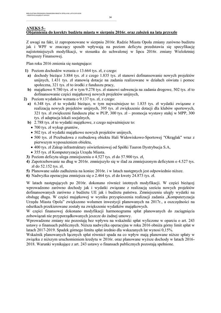 WIELOLETNIA PROGNOZA FINANSOWA MIASTA OPOLA NA LATA 2016-2036 - objaśnienia przyjętych wartości 34 _________________________________________________________________________ ANEKS 5– Objaśnienia do korekty budżetu miasta w sierpniu 2016r. oraz założeń na lata przyszłe Z uwagi na fakt, iż zaproponowane w sierpniu 2016r. Radzie Miasta Opola zmiany zarówno budżetu jak i WPF w znaczący sposób wpływają na poziom deficytu przedstawia się specyfikację najistotniejszych modyfikacji, w stosunku do uchwalonej w lipcu 2016r. zmiany Wieloletniej Prognozy Finansowej. Plan roku 2016 zmienia się następująco: 1) Poziom dochodów wzrasta o 13.664 tys. zł, z czego: a) dochody bieżące 3.884 tys. zł z czego 1.835 tys. zł stanowi dofinansowanie nowych projektów unijnych, 1.431 tys. zł stanowią dotacje na zadania realizowane w działach oświata i pomoc społeczna, 321 tys. zł to środki z funduszu pracy, b) majątkowe 9.780 tys. zł w tym 9.278 tys. zł stanowi subwencja na zadania drogowe, 502 tys. zł to dofinansowanie części majątkowej nowych projektów unijnych, 2) Poziom wydatków wzrasta o 9.137 tys. zł, z czego: a) 6.348 tys. zł to wydatki bieżące, w tym najważniejsze to: 1.835 tys. zł wydatki związane z realizacją nowych projektów unijnych, 395 tys. zł zwiększenie dotacji dla klubów sportowych, 321 tys. zł zwiększeni funduszu płac w PUP, 300 tys. zł – promocja wystawy stałej w MPP, 300 tys. zł adaptacja lokali socjalnych, b) 2.788 tys. zł to wydatki majątkowe, z czego najważniejsze to: 700 tys. zł wykup gruntów, 502 tys. zł wydatki majątkowe nowych projektów unijnych, 500 tys. zł Przebudowa z rozbudową obiektu Hali Widowiskowo-Sportowej "Okrąglak" wraz z pierwszym wyposażeniem obiektu, 400 tys. zł Zakup infrastruktury oświetleniowej od Spółki Tauron Dystrybucja S.A, 355 tys. zł Komputeryzacja Urzędu Miasta. 3) Poziom deficytu ulega zmniejszeniu o 4.527 tys. zł do 57.900 tys. zł, 4) Zapotrzebowanie na dług w 2016r. zmniejszyło się w ślad za zmniejszonym deficytem o 4.527 tys. zł do 52.152 tys. zł, 5) Planowane saldo zadłużenia na koniec 2016r. i w latach następnych jest odpowiednio niższe. 6) Nadwyżka operacyjna zmniejsza się o 2.464 tys. zł do kwoty 24.873 tys. zł. W latach następujących po 2016r. dokonano również istotnych modyfikacji. W części bieżącej wprowadzono zarówno dochody jak i wydatki związane z realizacją sześciu nowych projektów dofinansowanych zarówno z budżetu UE jak i budżetu państwa. Zmniejszeniu uległy wydatki na obsługę długu. W części majątkowej w wyniku przyspieszenia realizacji zadania „Komputeryzacja Urzędu Miasta Opola” zwiększono wolumen inwestycji planowanych na 2017r., a oszczędności na odsetkach przekierowane zostały na zwiększenie wydatków majątkowych. W części finansowej dokonano modyfikacji harmonogramu spłat planowanych do zaciągnięcia zobowiązań nie przyporządkowanych jeszcze do żadnej umowy. Wprowadzone zmiany nie pozostają bez wpływu na wskaźniki spłat wyliczone w oparciu o art. 243 ustawy o finansach publicznych. Niższa nadwyżka operacyjna w roku 2016 obniża górny limit spłat w latach 2017-2019. Spadek górnego limitu spłat średnio dla wskazanych lat wynosi 0,15%. Wskaźnik planowanych łącznych spłat również spada na co wpływ mają planowane niższe spłaty w związku z niższym uruchomieniem kredytu w 2016r. oraz planowane wyższe dochody w latach 20162018. Warunki wynikające z art. 243 ustawy o finansach publicznych pozostają spełnione.
