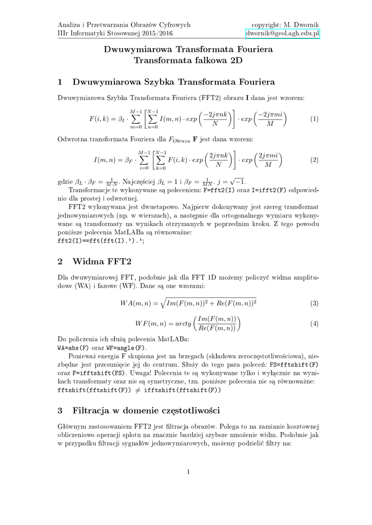 Analiza i Przetwarzania Obrazów Cyfrowych IIIr Informatyki Stosowanej 2015/2016 copyright: M. Dwornik [email protected] Dwuwymiarowa Transformata Fouriera Transformata falkowa 2D 1 Dwuwymiarowa Szybka Transformata Fouriera Dwuwymiarowa Szybka Transformata Fouriera (FFT2) obrazu I dana jest wzorem: M −1 N −1 X X " F (i, k) = βI · m=0 −2jπnk I(m, n) · exp N n=0 Odwrotna transformata Fouriera dla FObrazu M −1 N −1 X X " I(m, n) = βF · i=0 k=0 # −2jπmi · exp M (1) F jest dana wzorem: 2jπnk F (i, k) · exp N # · exp 2jπmi M (2) √ gdzie βL · βF = M1·N . Najcz¦±ciej βL = 1 i βF = M1N . j = −1. Transformacje te wykonywane s¡ poleceniem: F=fft2(I) oraz I=ifft2(F) odpowiednio dla prostej i odwrotnej. FFT2 wykonywana jest dwuetapowo. Najpierw dokonywany jest szereg transformat jednowymiarowych (np. w wierszach), a nast¦pnie dla ortogonalnego wymiaru wykonywane s¡ transformaty na wynikach otrzymanych w poprzednim kroku. Z tego powodu poni»sze polecenia MatLABa s¡ równowa»ne: fft2(I)==fft(fft(I).').'; 2 Widma FFT2 Dla dwuwymiarowej FFT, podobnie jak dla FFT 1D mo»emy policzy¢ widma amplitudowe (WA) i fazowe (WF). Dane s¡ one wzorami: W A(m, n) = q Im(F (m, n))2 + Re(F (m, n))2 W F (m, n) = arctg Im(F (m, n)) Re(F (m, n)) (3) (4) Do policzenia ich sªu»¡ polecenia MatLABa: WA=abs(F) oraz WF=angle(F). Poniewa» energia F skupiona jest na brzegach (skªadowa zerocz¦stotliwo±ciowa), niezb¦dne jest przesuni¦cie jej do centrum. Sªu»y do tego para polece«: FS=fftshift(F) oraz F=ifftshift(FS). Uwaga! Polecenia te s¡ wykonywane tylko i wyª¡cznie na wynikach transformaty oraz nie s¡ symetryczne, tzn. poni»sze polecenia nie s¡ równowa»ne: fftshift(fftshift(F)) 6= ifftshift(fftshift(F)) 3 Filtracja w domenie cz¦stotliwo±ci Gªównym zastosowaniem FFT2 jest ltracja obrazów. Polega to na zamianie kosztownej obliczeniowo operacji splotu na znacznie bardziej szybsze mno»enie widm. Podobnie jak w przypadku ltracji sygnaªów jednowymiarowych, mo»emy podzieli¢ ltry na: 1 Analiza i Przetwarzania Obrazów Cyfrowych IIIr Informatyki Stosowanej 2015/2016 copyright: M. Dwornik [email protected] • dolnoprzepustowe - przepuszczaj¡ce dolne cz¦stotliwo±ci, reprezentowane na ogóª przez trend na obrazie (np. stopniowe zmiany jasno±ci tªa). • górnoprzepustowe - przepuszczaj¡ce wysokie cz¦stotliwo±ci, reprezentuj¡ce na ogóª kraw¦dzie, szum i inne krótkookresowe zmiany jasno±ci na obrazie. • pasmoprzepustowe i pasmowyci¦ciowe - przepuszczaj¡ce lub wycinaj¡ce pewien przedziaª cz¦stotliwo±ci. • wyci¦ciowe - eliminuj¡ce pojedy«cz¡ cz¦stotliwo±¢ z obrazu (np. efekt pochodz¡cy od trakcji elektrycznej). Filtracja obrazu I przy u»yciu ltra M dana jest wzorem: F F = if f t2(|W A(I). ∗ W A(M )| · exp(i(W F (I) + W F (M )))) (5) Jak wynika z tego rozmiar maski ltru musi by¢ taki sam jak obrazu. Istniej¡ dwie metody projektowania ltru: bezpo±rednio w 2D oraz poprzez rozszerzenie ltrów 1D w 2D. 3.1 Projektowanie ltrów 2D Zerofazowy ltr dolnoprzeprzepustowy ma posta¢ centralnie poªo»onego okr¦gu (o warto±ciach 1), gdzie dªugo±¢ promienia koªa reguluje pasmo przepuszczania. Innym przykªadem ltru 2D jest dolnoprzepustowy ltr Butterwortha, dany wzorem: 1 1 + (D(u, v)/D0 )2n (6) (u − M/2)2 + (v − N/2)2 , (7) H(u, v) = D(u, v) = q gdzie D0 odpowiada za cz¦stotliwo±¢ odci¦cia, n jest rz¦dem ltru i odpowiada za krzywizn¦ zbocza ltru, a [M, N ] - rozmiar obrazu. Kolejnym przykªadem ltru dolnoprzepustowego jest ltr gaussowski, dany wzorem: −D2 (u, v) 2 · D02 (8) (u − M/2)2 + (v − N/2)2 (9) H(u, v) = exp D(u, v) = q 3.2 Okna Poniewa» ltry o przekroju prostok¡tnym powoduj¡ oscylacje, niezb¦dne jest okienkowanie ltru. W tym celu istnieje wiele odmian okien (wersja 1D): • bartlett(M). M-punktowe okno Bartletta dane jest wzorem: ( w(n) = 2n N, 2− 2n N, 0 ¬ n ¬ N/2 N/2 ¬ n ¬ N gdzie N=M-1; • blackman(M) - M-punktowe okno Blackmana dane jest wzorem: w(n) = 0.42 − 0.5 · cos(2π dla n<N i N=M-1; 2 n n ) + 0.08 · cos(4π ), N N (10) Analiza i Przetwarzania Obrazów Cyfrowych IIIr Informatyki Stosowanej 2015/2016 copyright: M. Dwornik [email protected] • czebwin(M,R) - M-punktowe okno Czebyszewa o magnitudzie zbocza R (domy±lnie 100 dB). • hamming(M) - M-punktowe okno Hamminga, dane jest wzorem: n ) N (11) n )) N (12) w(n) = 0.54 − 0.46 cos(2π • hann(M) - M-punktowe okno Hanninga w(n) = 0.5 · (1 − cos(2π • kaiser(M,beta) - M-punktowe okno Kaisera z parametrem β . Domy±lna warto±¢ β = 0.5. • rectwin(M) - okno prostok¡tne. To»same z poleceniem ones(M,1). W praktyce oznacza to, »e ltr nie jest okienkowany (brak zmian w ltrze); • taylorwin(M) - Okno Taylora, zbli»one efektem do okna Czebyszewa. • triang(M) - okno trójk¡tne o dªugo±ci M. Je»eli M jest nieparzyste jest to»same z oknem bartletta. Do aplikacji okien do masek ltrów sªu»¡ dwa polecenia: • fwind1(filtr, okno) - okienkowanie przy u»yciu okien jednowymiarowych. • fwind2(ltr, okno) - okienkowanie przy u»yciu okien dwuwymiarowych. 3.3 Projektowanie ltrów 2D w oparciu o ltry 1D Jedn¡ z metod projektowania ltrów 2D jest stworzenia ltru 1D, a nast¦pnie jego rozszerzenie w 2D poprzez obrót wzgl¦dem ±rodka. Dokonuje si¦ to przy u»yciu nast¦puj¡cych polece«: • filtr_1D=remez(N, [cz¦stotliwo±ci], [amplitudy]), gdzie N jest liczb¡ wspóª- czynników (musi by¢ parzysta). Jako cz¦stotliwo±ci podaje si¦ warto±ci z przedziaªu 0-1. • filtr_2D=ftrans2(filtr_1D) - stworzenie osiowo symetrycznego ltru 2D na podstawie ltru 1D. • filter2(filtr_2D, obraz) - ltracja obrazu. 4 Korelacja Jednym z zastosowa« FFT jest funkcja korelacji sªu»¡ca do wyszukiwania elementów podobnych na obrazie. Do liczenia wspóªczynnika korelacji sªu»y polecenie: corr2(obraz1, obraz2);. Wspóªczynnik korelacji jest liczony wg nast¦puj¡cego wzoru: P P n m (Amn − Ā) · (Bmn − B̄) q r= P P P P 2 ( n m (Amn 