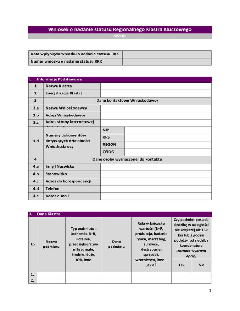 Formularz Wniosku o nadanie statusu regionalnego klastra