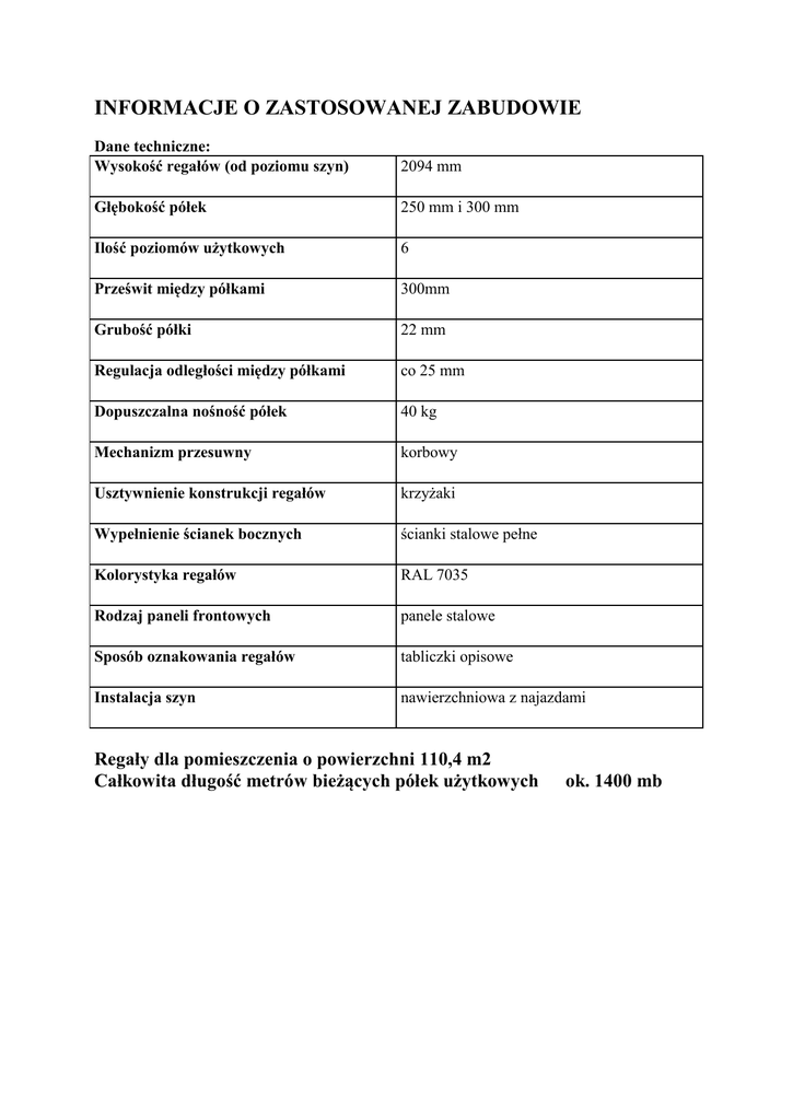 INFORMACJE O ZASTOSOWANEJ ZABUDOWIE Dane techniczne: Wysokość regałów (od poziomu szyn) 2094 mm Głębokość półek 250 mm i 300 mm Ilość poziomów użytkowych 6 Prześwit między półkami 300mm Grubość półki 22 mm Regulacja odległości między półkami co 25 mm Dopuszczalna nośność półek 40 kg Mechanizm przesuwny korbowy Usztywnienie konstrukcji regałów krzyżaki Wypełnienie ścianek bocznych ścianki stalowe pełne Kolorystyka regałów RAL 7035 Rodzaj paneli frontowych panele stalowe Sposób oznakowania regałów tabliczki opisowe Instalacja szyn nawierzchniowa z najazdami Regały dla pomieszczenia o powierzchni 110,4 m2 Całkowita długość metrów bieżących półek użytkowych ok. 1400 mb Konstrukcja torów jezdnych Tory jezdne wykonane są z płaskownika (2 x 70 mm) i kształtownika torowego (10 x 25 mm) - ocynkowane. Oba te elementy są ze sobą łączone (spawane). Wysokość całkowita toru 12 mm. Tory kotwiczone są z podłożem za pomocą kołków rozporowych. Skrajne tory posiadają system antyprzechyłowy zabezpieczający przed przewróceniem się regału. Podwozie regałów. Podwozie (rama) regałów o wys. 100 mm wykonana jest z profili stalowych oraz elementów giętych z blachy stalowej gr. 2 i 3 mm malowanej proszkowo w kolorze RAL 7035. W ramie znajdują są wały. Na wałach osadzone są żeliwne koła jezdne z jednostronnym obrzeżem o średnicy ø94 mm (z kołnierzem ø108 mm) . Wszystkie koła jezdne są standardowo wyposażone w łożyska kulkowe co dodatkowo podnosi jakość użytkowania. Konstrukcja korpusu regałów. Korpus regałów (ściany) wykonane są z blachy stalowej gr. 1,0 mm malowanej proszkowo w kolorze RAL 7035. Przykręcane są do ramy (podwozia) regałów. Posiadają perforację co 25 mm (do zawieszania półek). Dodatkowo dla uzyskania większej sztywności zastosowane są wzmocnienia krzyżowe – śruba rzymska. Konstrukcja półki. Półka wykonana z blachy stalowej gr. 0,6–0,8 mm malowanej proszkowo w kolorze RAL 7035. Półki posiadają ogranicznik przesuwu dokumentów na sąsiednią półkę o wys. 37 mm. Nośność półki 40 kg. Grubość półki 22 mm. Konstrukcja mechanizmu napędowego. Rodzaj zastosowanego napędu – mechaniczny, wspomagany przez korbę trójramienną – z tworzywa sztucznego z trzema obrotowymi gałkami. Przekładnia łańcuchowa jest wyposażona w element napędowy i element redukcyjny. Przełożenie 1 do 6,8. Przemieszczenie regału następuje przy użyciu niewielkiej siły. Blokada w osi korby. W regałach przesuwnych o długości ciągu 6200 mm – mechanizm przesuwny zamontowany po obu stronach regału. Konstrukcja panela ozdobnego. Stalowe panele przednie (pełne) osłaniają mechanizm przesuwu. Osłona łamana o grubości 70 mm - zwiększenie estetyki regałów. Panele wyposażone są w etykiety do opisywania zawartości regału. Kolor jasno szary - RAL 7035. W regałach dwustronnych – panel ozdobny zamontowany po obu stronach regału.