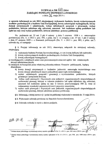 5 6) wykaz osób prawnych i fizycznych oraz jednostek organizacyjnych nieposiadających osobowości prawnej, którym w zakresie podatków lub opłat udzielono ulg, odroczeń, umorzeń lub rozłożono spłatę na raty w kwocie przewyższającej 500 zł, wraz ze wskazaniem wysokości umorzonych kwot i przyczyn umorzenia: Lp. 1. 2. Wyszczególnienie K. Wanda G. Marlena Kwota umorzenia Przyczyna umorzenia 1 040,88 zł trudna sytuacja materialna 618,20 zł trudna sytuacja materialna 7) wykaz osób prawnych i fizycznych oraz jednostek organizacyjnych nieposiadających osobowości prawnej, którym udzielono pomocy publicznej: Lp. Nazwa 1 2 3 4 5 6 7 8 9 10 11 12 13 14 15 16 17 18 19 20 21 22 23 24 25 26 27 28 29 30 31 32 33 34 35 C. Adrian - Słońsko K. Adam - Pakość W. Mirosław - Godzięba S. Sebastian - Inowrocław B. Waldemar - Polanowice Ś. Jarosław - Inowrocław N. Jakub - Inowrocław F. Jakub - Modliborzyce R. Jędrzej - Buczkowo W. Dawid - Rycerzewo R. Mikołaj - Janikowo M. Katarzyna - Inowrocław N. Krzysztof - Niszczewice G. Paweł - Inowrocław R. Małgorzata - Gniewkowo K. Marcin - Inowrocław G. Marcin - Kruszwica M. Krzysztof - Inowrocław M. Radosław - Tuczno K. Piotr - Inowrocław S. Małgorzata - Inowrocław T. Wiesława - Zagajewiczki S. Marlena - Rycerzewko B. Filip - Inowrocław P.Marcin - Inowrocław S. Filip - Radłowo G. Łukasz - Inowrocław K.-B. Karolina - Inowrocław S. Piotr - Inowrocław K. Maksymilian - Gniewkowo H. Mariola - Pakość Z. Wioletta - Inowrocław L. Magdalena - Złotniki Kujawskie D. Lidia - Sukowy T. Tomasz - Janikowo 6 36 37 38 39 40 41 42 43 44 45 46 47 48 49 50 51 52 53 54 55 56 57 58 59 60 61 62 63 64 65 66 67 68 69 70 71 72 73 74 75 76 77 78 79 80 81 82 83 84 G. Dominika - Inowrocław G. Maciej - Inowrocław S. Mariusz - Pakość K. Anita - Kruszwica Z. Jacek - Złotniki Kujawskie Ł. Michał - Inowrocław A. Andrzej - Inowrocław K. Marika - Gniewkowo W. Mateusz - Inowrocław R. Bartosz - Inowrocław J. Krzysztof - Inowrocław Ż. Bartłomiej - Inowrocław B. Radosław - Janikowo G. Maciej - Inowrocław O. Łukasz - Inowrocław W. Agnieszka - Inowrocław P. Michał - Inowrocław D. Martyna - Inowrocław R. Andrzej - Złotniki Kujawskie M. Wojciech - Inowrocław P. Radosław - Gniewkówiec W. Sylwia - Inowrocław O. Leszek - Inowrocław G. Piotr - Komaszyce S. Danuta - Inowrocław S. Patryk - Inowrocław O. Łukasz - Kruszwica M. Wojciech - Inowrocław K. Roma - Inowrocław B. Wojciech - Inowrocław D. Kazimierz - Złotniki Kujawskie K. Krzysztof - Inowrocław W. Ewelina - Liszkowo N. Anna - Inowrocław K. Krzysztof - Kruszwica K. Henryk - Rybitwy M. Irena - Pakość P. Zbigniew - Inowrocław G. Anna - Inowrocław Z. Katarzyna - Inowrocław Ś. Switłana - Janikowo K. Agnieszka - Gniewkowo R. Marta - Przybysław F.-C. Ewa - Inowrocław R. Celina - Rejna S. Martika - Pakość G. Iwona - Złotniki Kujawskie Ch. Arpine - Racice K. Andrzej - Inowrocław 7 85 86 87 88 89 90 91 92 93 94 95 96 97 98 99 100 101 102 103 104 105 106 107 108 109 110 111 112 113 114 115 116 117 118 119 120 121 122 123 124 125 126 127 128 129 130 131 132 133 M. Aleksandra - Rucewko C. Paweł - Gniewkowo M. Daria - Złotniki Kujawskie Sz. Monika - Pakość C. Łukasz - Inowrocław G. Danuta - Inowrocław L. Anna - Lachmirowice M. Krzysztof - Kruszwica T. Iwona - Inowrocław S. Iwona - Gniewkowo S. Agnieszka - Rzepowo K. Tomasz - Inowrocław T. Jacek - Gniewkowo N. Jolanta - Pakość B. Michał - Inowrocław W. Beata - Kruszwica G. Irena - Inowrocław Cz. Mikołaj - Wielowieś W. Piotr - Inowrocław Ł. Jarosław - Inowrocław M. Krystyna - Radojewice B. Maria - Inowrocław B. Barbara - Inowrocław R. Beata - Pakość T. Beata - Inowrocław P. Agnieszka - Kruszwica K. Natalia - Kruszwica C. Ryszard - Inowrocław K. Elżbieta - Gniewkowo L.-W. Beata - Inowrocław Sz. Danuta - Sójkowo K. Robert - Inowrocław O. Jarosław - Inowrocław W. Aleksandra - Inowrocław S.-R. Małgorzata - Gniewkowo W. Maria - Dąbrowa Biskupia J. Małgorzata - Inowrocław W. Paulina - Inowrocław K. Magdalena - Inowrocław K. Aleksandra - Balczewo Ż. Emilia - Inowrocław M. Mikołaj - Inowrocław B. Dorota - Komaszyce L. Mirosława - Gniewkowo Z. Monika - Sławęcin C. Marta - Inowrocław S. Anna - Inowrocław P. Arkadiusz - Gniewkowo C. Tomasz - Inowrocław 8 134 135 136 137 138 139 140 141 142 143 144 145 146 147 148 149 150 151 152 153 154 155 156 157 158 159 160 161 162 163 164 165 166 167 168 169 170 171 172 173 174 175 176 177 178 179 180 181 182 M. Jakub - Kołodziejewo P. Kamil - Kruszwica L. Michał - Pakość B. Ewa - Janikowo O. Tomasz - Janikowo S. Adrian - Inowrocław L. Malwina - Złotniki Kujawskie L. Sylwia - Brudnia G. Julita - Pakość G. Janusz - Janikowo B. Ewa - Inowrocław L. Agnieszka - Karczyn S. Lucyna - Inowrocław K. Justyna - Palczyn P.-Z. Magdalena - Inowrocław S. Mariusz - Inowrocław P. Piotr - Inowrocław B. Robert - Tuczno S. Monika - Inowrocław S. Wioletta - Inowrocław W. Marlena - Inowrocław S. Łukasz - Inowrocław S. Krzysztof - Kruszwica W. Karol - Złotniki Kujawskie R. Anna - Dąbrowa Biskupia D. Rafał - Radłowo J. Emilia - Inowrocław Z. Monika - Kruszwica M. Marcin - Inowrocław F. Adam - Inowrocław W. Karol - Inowrocław K. Tomasz - Kruszwica P. Bogusława - Gniewkowo M. Jakub - Gniewkowo M. Magdalena - Inowrocław S. Łukasz - Inowrocław P. Agata - Tuczno Ś. Andrzej - Inowrocław J. Aleksandra - Inowrocław W.-K. - Ludwiniec S. Arkadiusz - Inowrocław Cz. Marcin - Janikowo K. Małgorzata - Wielowieś M. Jacek - Inowrocław W. Patryk - Pakość S. Dawid - Gniewkowo S. Katarzyna - Inowrocław L. Grzegorz - Sukowy P. Arleta - Inowrocław 9 183 184 185 186 187 188 189 190 191 192 193 194 195 196 197 198 199 200 201 202 203 204 205 206 207 208 209 210 211 212 213 214 215 216 217 218 219 220 221 222 223 224 225 226 227 228 229 230 231 Z. Karolina - Rojewice O. Zbigniew - Dziarnowo M. Magdalena - Tupadły B. Honorata - Inowrocław K. Natalia - Inow