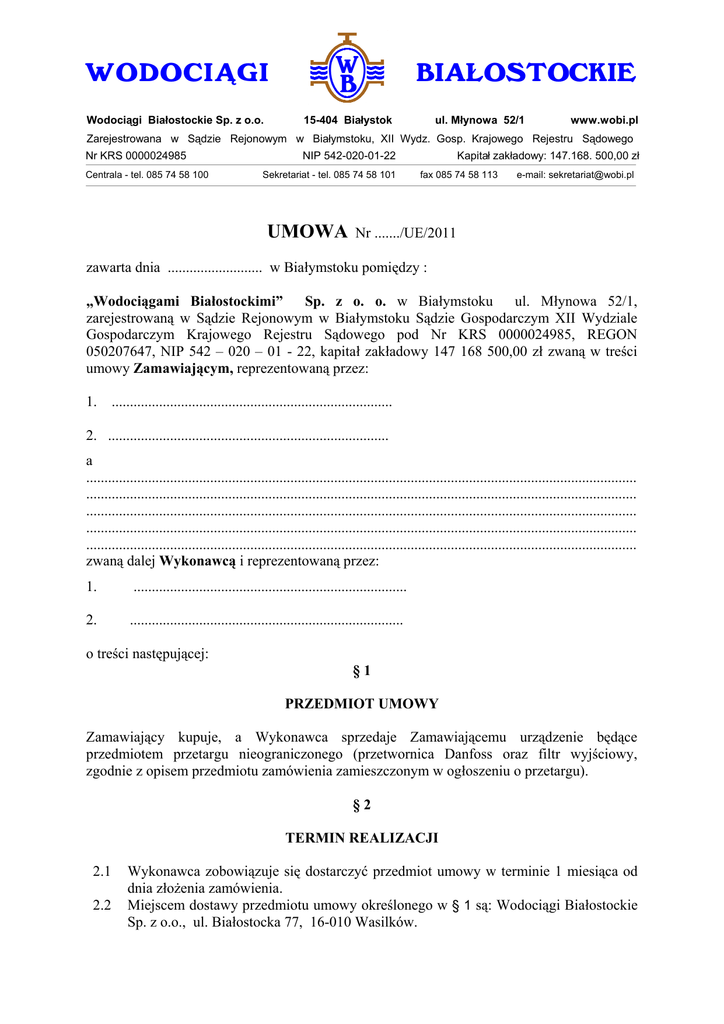 WODOCIĄGI Wodociągi Białostockie Sp. z o.o. BIAŁOSTOCKIE 15-404 Białystok ul. Młynowa 52/1 www.wobi.pl Zarejestrowana w Sądzie Rejonowym w Białymstoku, XII Wydz. Gosp. Krajowego Rejestru Sądowego Nr KRS 0000024985 Centrala - tel. 085 74 58 100 NIP 542-020-01-22 Sekretariat - tel. 085 74 58 101 UMOWA Kapitał zakładowy: 147.168. 500,00 zł fax 085 74 58 113 e-mail: [email protected] Nr ......./UE/2011 zawarta dnia .......................... w Białymstoku pomiędzy : „Wodociągami Białostockimi” Sp. z o. o. w Białymstoku ul. Młynowa 52/1, zarejestrowaną w Sądzie Rejonowym w Białymstoku Sądzie Gospodarczym XII Wydziale Gospodarczym Krajowego Rejestru Sądowego pod Nr KRS 0000024985, REGON 050207647, NIP 542 – 020 – 01 - 22, kapitał zakładowy 147 168 500,00 zł zwaną w treści umowy Zamawiającym, reprezentowaną przez: 1. ............................................................................. 2. ............................................................................. a ....................................................................................................................................................... ....................................................................................................................................................... ....................................................................................................................................................... ....................................................................................................................................................... ....................................................................................................................................................... zwaną dalej Wykonawcą i reprezentowaną przez: 1. ........................................................................... 2. ........................................................................... o treści następującej: §1 PRZEDMIOT UMOWY Zamawiający kupuje, a Wykonawca sprzedaje Zamawiającemu urządzenie będące przedmiotem przetargu nieograniczonego (przetwornica Danfoss oraz filtr wyjściowy, zgodnie z opisem przedmiotu zamówienia zamieszczonym w ogłoszeniu o przetargu). §2 TERMIN REALIZACJI 2.1 2.2 Wykonawca zobowiązuje się dostarczyć przedmiot umowy w terminie 1 miesiąca od dnia złożenia zamówienia. Miejscem dostawy przedmiotu umowy określonego w § 1 są: Wodociągi Białostockie Sp. z o.o., ul. Białostocka 77, 16-010 Wasilków. 2.3 2.4 Zamawiający nie ma obowiązku przedłużenia terminu wykonania przedmiotu umowy, jeżeli Wykonawca w ciągu 7 dni od zaistnienia okoliczności nie przedstawi Zamawiającemu wniosku o przedłużenie terminu ze szczegółowym uzasadnieniem . Po przekroczeniu terminu umownego, wykonawcy nie przysługuje prawo do odstąpienia od wykonania przedmiotu umowy. §3 WYNAGRODZENIE 3.1 3.2 3.3 3.4 3.5 3.6 3.7 3.8 Ustala się wynagrodzenie za wykonanie przedmiotu umowy określonego w §1 niniejszej umowy na kwotę netto: ……………………………… zł (słownie: …………………………………………..) Do wynagrodzenia określonego w pkt 3.1 zostanie doliczony podatek VAT w wysokości 23 %, tj. w wysokości ..........……………………… zł (słownie: …………………………………………………………) Wynagrodzenie brutto przedmiotu umowy: ………………….. zł (słownie: ………………………………………………………….) Fakturowanie za wykonanie przedmiotu umowy odbędzie się po przekazaniu Zamawiającemu dokumentacji powykonawczej i dokonaniu odbioru końcowego przedmiotu umowy. Podstawę do wystawienia faktury końcowej stanowi załączony do faktury oryginał protokołu odbioru robót potwierdzony przez obie strony. Termin płatności faktury: 21 dni od daty jej otrzymania na rachunek bankowy podany na fakturze VAT. W przypadku nie opłacenia faktury w ustalonym terminie Zamawiający zapłaci Wykonawcy odsetki w ustawowej wysokości. Wynagrodzenie ustalone w wyniku przetargu może ulec zmniejszeniu w przypadku zmniejszenia zakresu rzeczowego określonego umową . Jeżeli w toku realizacji przedmiotu zamówienia wystąpi konieczność zamówienia dodatkowego, którego wykonanie stało się konieczne na skutek z sytuacji, których nie można było wcześnie przewidzieć, oraz gdy z przyczyn technicznych lub gospodarczych zamówienia dodatkowego nie można oddzielić od zamówienia podstawowego, Zamawiający zleci ich wykonanie temu samemu Wykonawcy z wolnej ręki. Wykonawca zobowiązany jest wykonać to zamówienie przy zachowaniu tych samych norm, standardów i parametrów, co zamówienie podstawowe. §4 OBOWIĄZKI STRON 4.1 4.2 Zamawiający zobowiązuje się do odbioru przedmiotu umowy. Wykonawca zobowiązuje się do wykonania przedmiotu umowy zgodnie z wykonanym opisem przedmiotu zamówienia, zasadami wiedzy technicznej i przepisami prawa; §5 ODBIÓR ROBÓT 5.1 Przedmiotem odbioru końcowego jest przedmiot umowy. 5.2 Razem z wnioskiem o dokonanie odbioru końcowego robót Wykonawca przekaże Zamawiającemu: a) aprobaty techniczne, certyfikaty lub deklaracje zgodności, wymagane prawem, na materiały , urządzenia, elementy itp. b) wymagane dokumenty, protokoły i zaświadczenia z przeprowadzonych przez Wykonawcę sprawdzeń i badań urzadzeń objętych zamówieniem, 5.3 Strony postanawiają , że z czynności odbioru będzie spisany protokół , zawierający wszelkie ustalenia dokonane w toku odbioru, jak też terminy wyznaczone na usunięcie stwierdzonych przy odbiorze wad. 5.4 Wykonawca zobowiązany jest do zawiadomienia Zamawiającego o usunięciu wad oraz zaproponowaniu ponownego terminu odbioru. Usunięcie wad powinno być stwierdzone protokolarnie. 5.5 O wykryciu wady w okresie gwarancji Zamawiający obowiązany jest zawiadomić Wykonawcę na piśmie. Istnienie wady strony potwierdzą protokolarnie, uzga