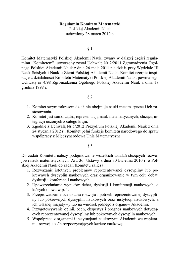 Regulamin Komitetu Matematyki Polskiej Akademii Nauk uchwalony 28 marca 2012 r. §1 Komitet Matematyki Polskiej Akademii Nauk, zwany w dalszej części regulaminu „Komitetem”, utworzony został Uchwałą Nr 2/2011 Zgromadzenia Ogólnego Polskiej Akademii Nauk z dnia 26 maja 2011 r. i działa przy Wydziale III Nauk Ścisłych i Nauk o Ziemi Polskiej Akademii Nauk. Komitet czerpie inspiracje z działalności Komitetu Matematyki Polskiej Akademii Nauk, powołanego Uchwałą nr 4/98 Zgromadzenia Ogólnego Polskiej Akademii Nauk z dnia 18 grudnia 1998 r. §2 1. Komitet swym zakresem działania obejmuje nauki matematyczne i ich zastosowania. 2. Komitet jest samorządną reprezentacją nauk matematycznych, służącą integracji uczonych z całego kraju. 3. Zgodnie z Uchwałą Nr 5/2012 Prezydium Polskiej Akademii Nauk z dnia 24 stycznia 2012 r., Komitet pełni funkcję komitetu narodowego do spraw współpracy z Międzynarodową Unią Matematyczną. §3 Do zadań Komitetu należy podejmowanie wszelkich działań służących rozwojowi nauk matematycznych. Art. 36 Ustawy z dnia 30 kwietnia 2010 r. o Polskiej Akademii Nauk do zadań Komitetu zalicza: 1. Rozważanie istotnych problemów reprezentowanej dyscypliny lub pokrewnych dyscyplin naukowych oraz organizowanie w tym celu debat, dyskusji i konferencji naukowych. 2. Upowszechnianie wyników debat, dyskusji i konferencji naukowych, o których mowa w p. 1. 3. Przeprowadzanie ocen stanu rozwoju i potrzeb reprezentowanej dyscypliny lub pokrewnych dyscyplin naukowych oraz instytucji naukowych, z ich własnej inicjatywy lub na wniosek jednego z organów Akademii. 4. Przygotowywanie opinii, ocen, ekspertyz i prognoz naukowych dotyczących reprezentowanej dyscypliny lub pokrewnych dyscyplin naukowych. 5. Współpraca z organami i instytucjami naukowymi Akademii we wspieraniu rozwoju osób rozpoczynających karierę naukową. 6. Współdziałanie przy wprowadzaniu w życie i upowszechnianiu wyników badań naukowych i prac rozwojowych. 7. Dbałość o reprezentatywny wkład nauki polskiej w rozwój nauki w świecie, w tym przez rozwój współpracy międzynarodowej. 8. Wspólne z innymi komitetami naukowymi przygotowywanie multidyscyplinarnych opracowań naukowych, z ich własnej inicjatywy lub na wniosek jednego z organów Akademii. 9. Ocena wydawnictw naukowych. Komitet uznaje również za swoje zadania: 10. Przeprowadzanie analiz i ocen stanu nauczania matematyki w Polsce. 11. Współdziałanie z organami państwa, w szczególności z Ministerstwem Nauki i Szkolnictwa Wyższego, Ministerstwem Edukacji Narodowej, Radą Główną Nauki i Szkolnictwa Wyższego, Centralną Komisją ds. Stopni i Tytułów, Narodowym Centrum Nauki, Narodowym Centrum Badań i Rozwoju, Komitetem Ewaluacji Jednostek Naukowych i Polską Komisją Akredytacyjną w sprawach dotyczących oceny stanu i poziomu nauczania matematyki, priorytetów badawczych i kierunków rozwoju matematyki. 12. Współpracę z Polskim Towarzystwem Matematycznym, Polską Akademią Umiejętności i innymi krajowymi organizacjami i stowarzyszeniami, których działalność statutowa związana jest z rozwojem matematyki w Polsce. 13. Inicjowanie współpracy z międzynarodowymi i zagranicznymi stowarzyszeniami naukowymi oraz obejmowanie i sprawowanie patronatu nad sekcjami krajowymi międzynarodowych unii i stowarzyszeń naukowych w zakresie nauk matematycznych. 14. Organizację konferencji naukowych oraz obejmowanie i sprawowanie patronatu nad konferencjami i seminariami naukowymi. 15. Opiniowanie wniosków o finansowanie w ramach działalności upowszechniającej naukę i występowanie z takimi wnioskami. 16. Zgłaszanie i opiniowanie przedłożonych Komitetowi wniosków o nagrody naukowe w zakresie nauk matematycznych. 17. Opiniowanie kandydatów w dziedzinie nauk matematycznych na członków korespondentów Polskiej Akademii Nauk. §4 Jako komitet narodowy do spraw współpracy z Międzynarodową Unią Matematyczną, Komitet: 1. Koordynuje współpracę polskiego środowiska naukowego z Międzynarodową Unią Matematyczną. 2. Propaguje na forum Międzynarodowej Unii Matematycznej osiągnięcia polskiej matematyki. 3. Upowszechnia w kraju program działalności Międzynarodowej Unii Matematycznej. 4. Deleguje przedstawicieli matematyki polskiej do władz Międzynarodowej Unii Matematycznej. 5. Wnioskuje o udział i skład delegacji na kongresy i konferencje naukowe organizowane pod auspicjami Międzynarodowej Unii Matematycznej. §5 1. Skład Komitetu określa „Regulamin trybu wyboru członków komitetu naukowego i jego organów”, stanowiący załącznik do Uchwały Nr 28/2011 Prezydium Polskiej Akademii Nauk z dnia 26 maja 2011 r, z poprawką z dnia 1 lipca 2011 r. 2. W skład komitetu wchodzi nie więcej niż 30 członków wyłonionych w wyniku wyborów przez środowisko matematyczne. 3. W skład Komitetu wchodzą również członkowie Akademii Nauk i przedstawiciele Akademii Młodych Uczonych, reprezentujący nauki matematyczne, którzy zgłosili chęć uczestnictwa w pracach Komitetu. 4. Komitet może w trakcie kadencji zapraszać do swojego składu specjalistów, w tym specjalistów z różnych dziedzin życia gospodarczego i społecznego oraz praktycznego zastosowania nauki, w liczbie nieprzekraczającej 1/3 liczby członków pochodzących z wyboru. §6 1. Organami Komitetu są: a. przewodniczący Komitetu; b. prezydium Komitetu. 2. W skład prezydium Komitetu wchodzą: a. przewodniczący Komitetu; b. 2 zastępców przewodniczącego; c. sekretarz Komitetu; d. nie więcej niż 7 członków prezydium. 3. Przewodniczący Komitetu zwołuje zebrania plenarne i zebrania prezydium Komitetu, przewodniczy tym zebraniom, kieruje bieżącą pracą Komitetu oraz reprezentuje Komitet na zewnątrz. W razie nieobecności przewodniczącego zastępuje go upoważniony zastępca przewodniczącego. 4. Do zadań Prezydium Komitetu należy kierowanie pracami Komitetu, przygotowywanie projektów uchwał, pla