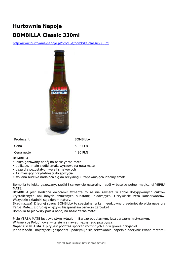 Hurtownia Napoje BOMBILLA Classic 330ml http://www.hurtownia-napoje.pl/produkt/bombilla-classic-330ml Producent BOMBILLA Cena 6.03 PLN Cena netto 4.90 PLN BOMBILLA • lekko gazowany napój na bazie yerba mate • delikatny, mało słodki smak, wyczuwalna nuta mate • baza dla pozostałych wersji smakowych • 12 miesięcy przydatności do spożycia • szklana butelka nadająca się do recyklingu i zapewniająca idealny smak Bombilla to lekko gazowany, rześki i całkowicie naturalny napój w butelce pełnej magicznej YERBA MATE. BOMBILLA jest słodzona owocami! Oznacza to że nie zawiera w sobie dosypywanych cukrów krystalicznych ani innych sztucznych substancji słodzących. Oczywiście zero konserwantów. Wszystkie składniki są dziełem natury. Skąd nazwa? Z jednej strony BOMBILLA to specjalna rurka, nieodzowny przedmiot do picia naparu z Yerba Mate… z drugiej w języku hiszpańskim oznacza żarówkę! Bombilla to pierwszy polski napój na bazie Yerba Mate! Picie YERBA MATE jest swoistym rytuałem. Bardzo popularnym, lecz zarazem mistycznym. W Ameryce Południowej wita się nią nawet nieznanego przybysza. Napar z YERBA MATE pity jest podczas spotkań rodzinnych lub w gronie przyjaciół. Jedna z osób - najczęściej gospodarz - podejmuje się serwowania, napełnia naczynie zwane matero i TXT_PDF_PAGE_NUMBER 1 TXT_PDF_PAGE_OUT_OF 2 przekazuje je kolejnej osobie. Ta za pomocą specjalnej rurki (BOMBILLI !) wypija cały napar i oddaje gospodarzowi, żeby uzupełnił naczynie ciepłą wodą i podał dalej. ZALETY YERBA MATE: • wzmaga siły • niweluje zmęczenie • zwiększa koncentrację • zmniejsza stres i zwalcza bezsenność • podnosi odporność organizmu • polepsza trawienie • czyści krew i usuwa z niej substancje toksyczne • balansuje układ nerwowy • przywraca młodzieńczy kolor włosów, • opóźnia starzenie się • naturalnie odchudza! • zawiera witaminy i minerały CHARAKTERYSTYKA BOMBILLI: • oryginalny i całkowicie naturalny ekstrakt z YERBA MATE! • naturalny cukier specjalnie pozyskiwany z prawdziwych owoców: - 100% zdrowy niemodyfikowany chemicznie - bez konserwantów używanych do produkcji innych cukrów/ słodzików - bez glutenu • idealne połączenie kofeiny naturalnie zawartej w liściach Yerba Mate, nazywanej mateiną z naturalną, aromatyczną kofeiną pochodzącą wprost ze świeżych, zielonych nasion kawy. • bez dodatków syntetycznych, tylko natura. Zawartość kofeiny w butelce Bombilli jest mniejsza niż w jednej filiżance tradycyjnie parzonej kawy • delikatne, piwne pienienie się nie jest przypadkiem a wynikiem setek prób i testów aby bąbelki doskonale współgrały z wyjątkowym smakiem. • używamy najlepszej jakości wody źródlanej a nasze świeże bąbelki są recepturą samą w sobie. • pasteryzowana (pasteryzacja to technika konserwacji przy pomocy odpowiednio dobranego podgrzewania produktów spożywczych (pow. 70ºC. ) • bez chemii i syntetyków ! • bez benzoesanu sodu: Związku mogącego obniżać wartość smakową napojów, silnie podrażniającego błonę śluzową żołądka i jelit oraz zakwaszającego organizm. • bez kwasu sorbowego: Syntetycznego związku, który może powodować poważne podrażnienia i alergie TXT_PDF_PAGE_NUMBER 2 TXT_PDF_PAGE_OUT_OF 2